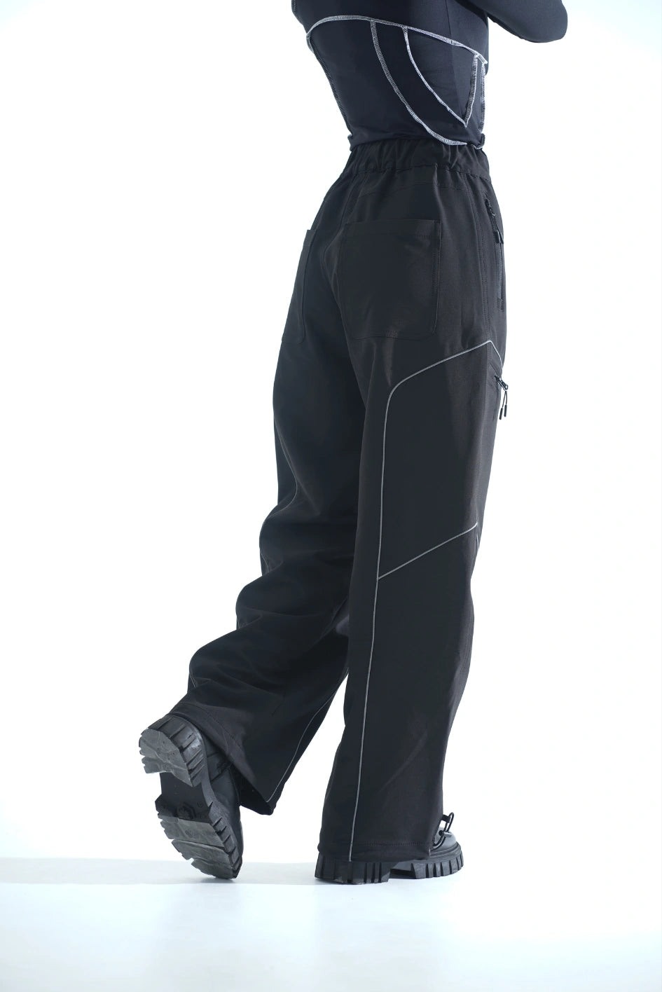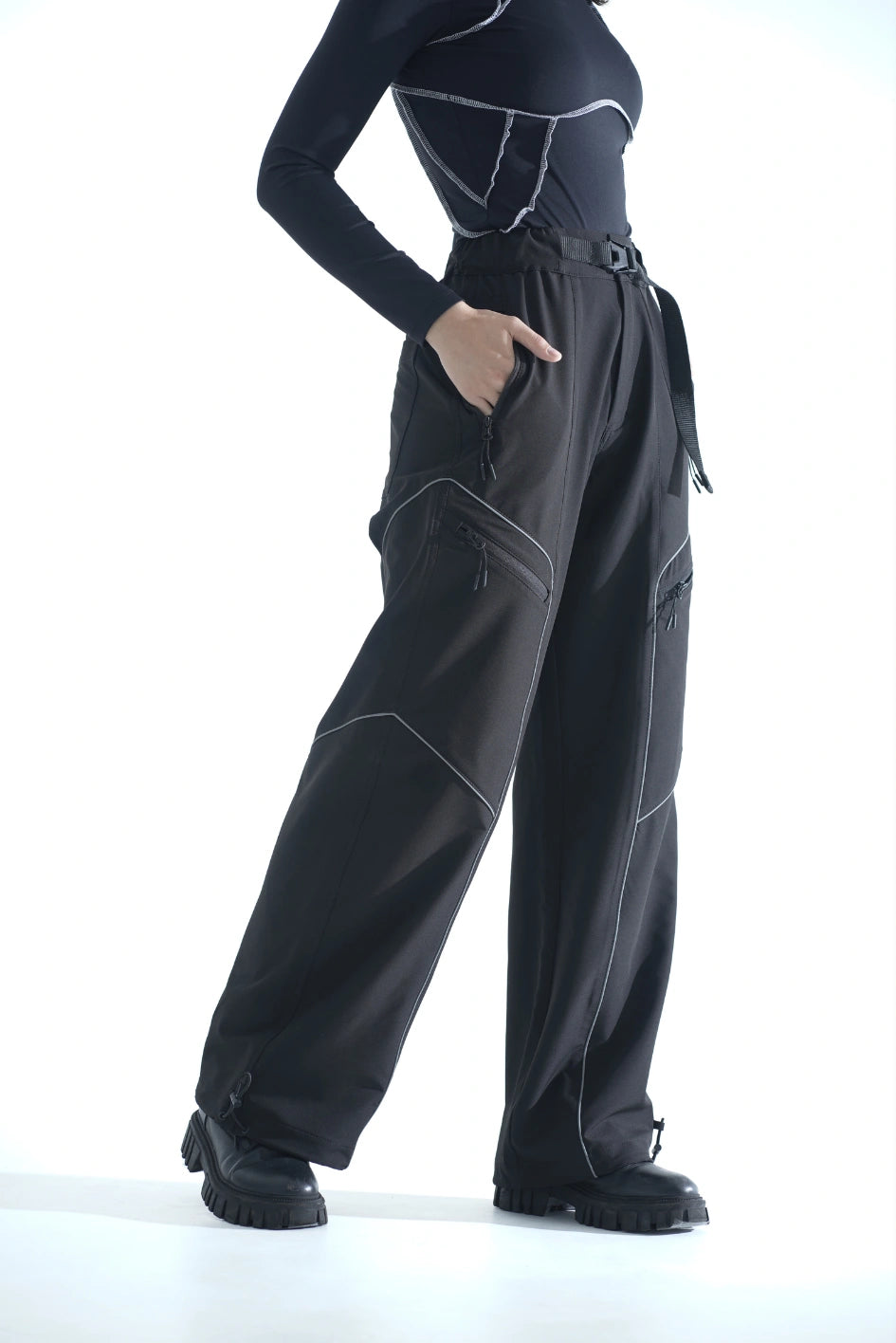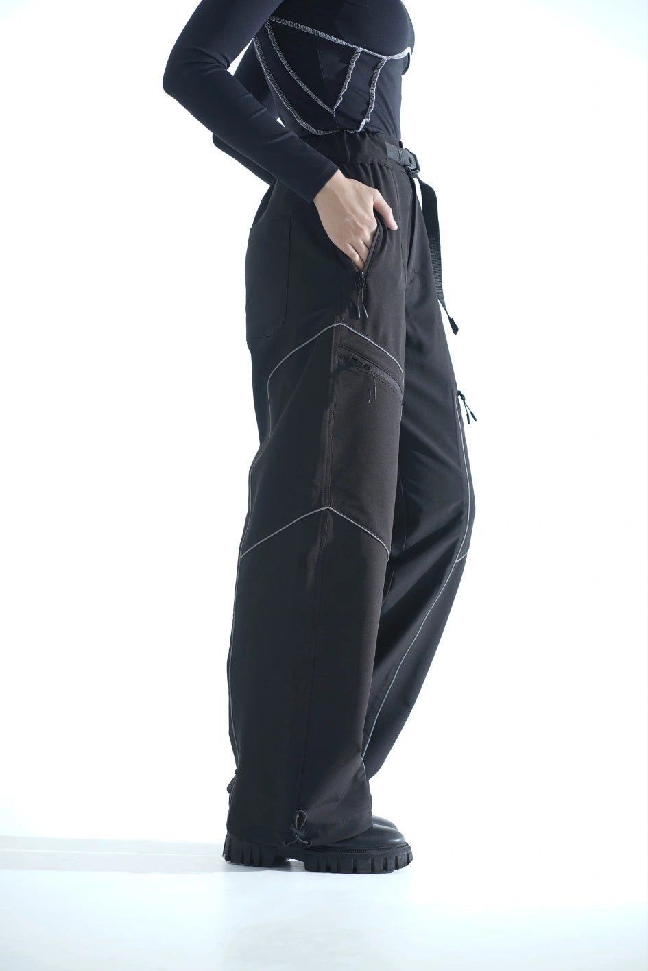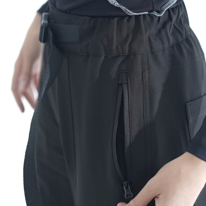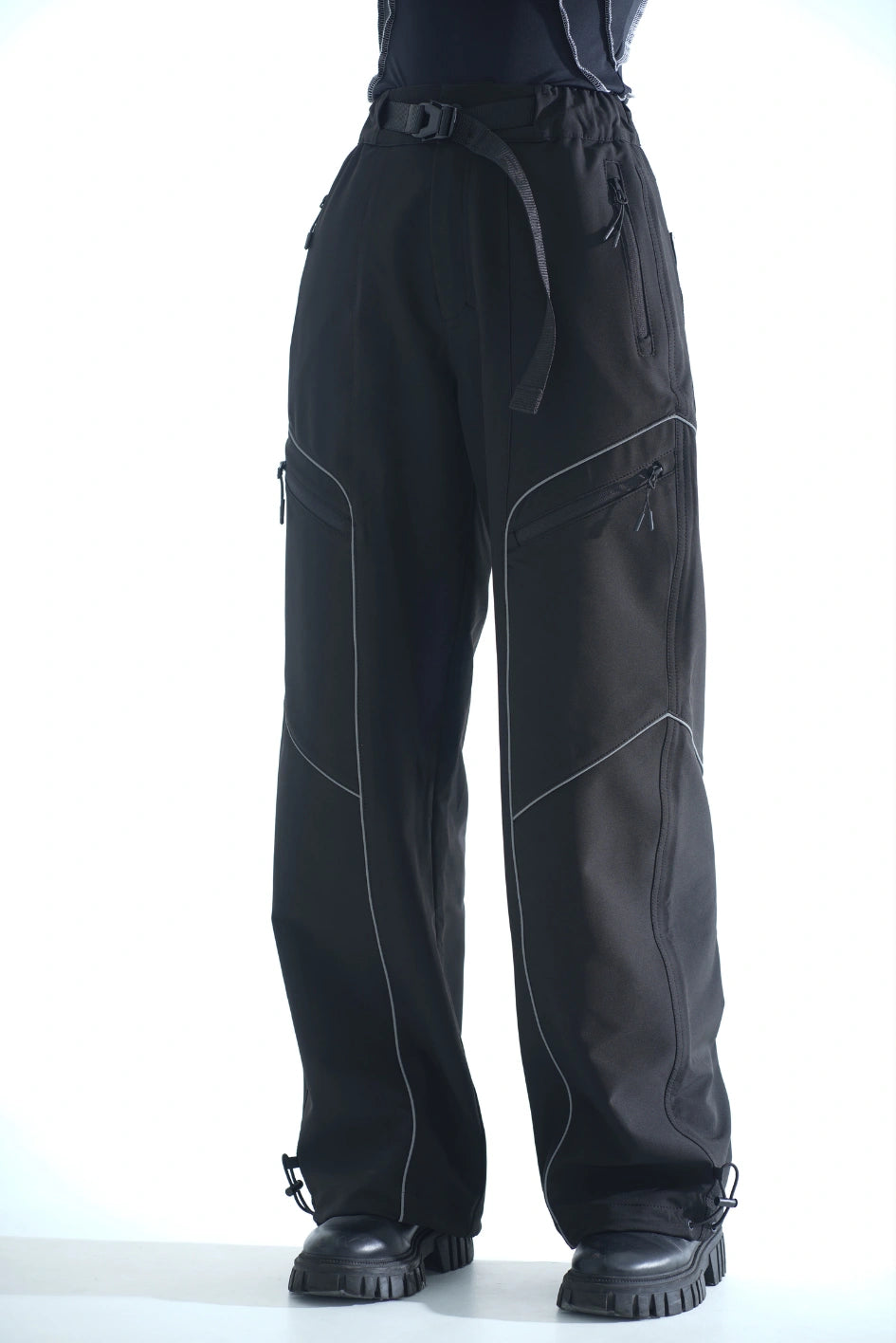 Straight-cut nylon pants — a versatile option for those who value comfort and detail. Equipped with six pockets: two upper and two side zip pockets, two back patch pockets. Built-in belt with buckle and elastic waistband ensure a perfect fit.