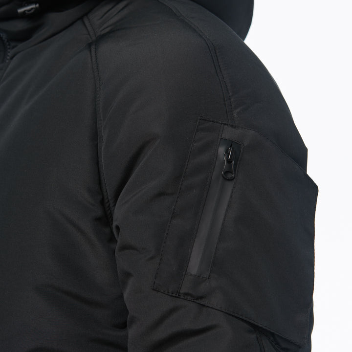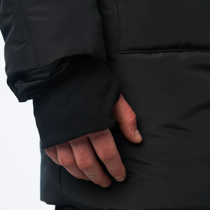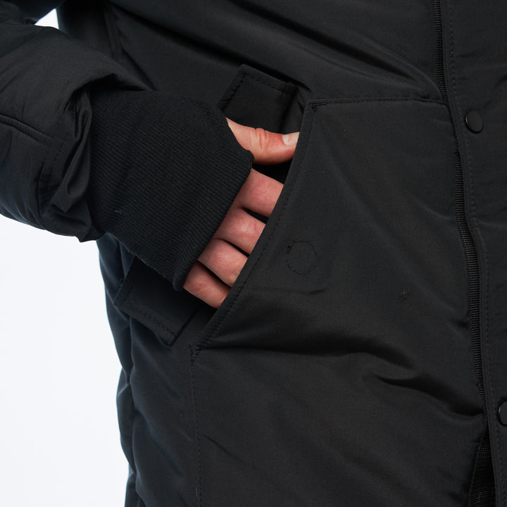 The elongated silhouette helps retain body heat, while two insulated exterior pockets and one inner pocket offer practical storage for essentials.