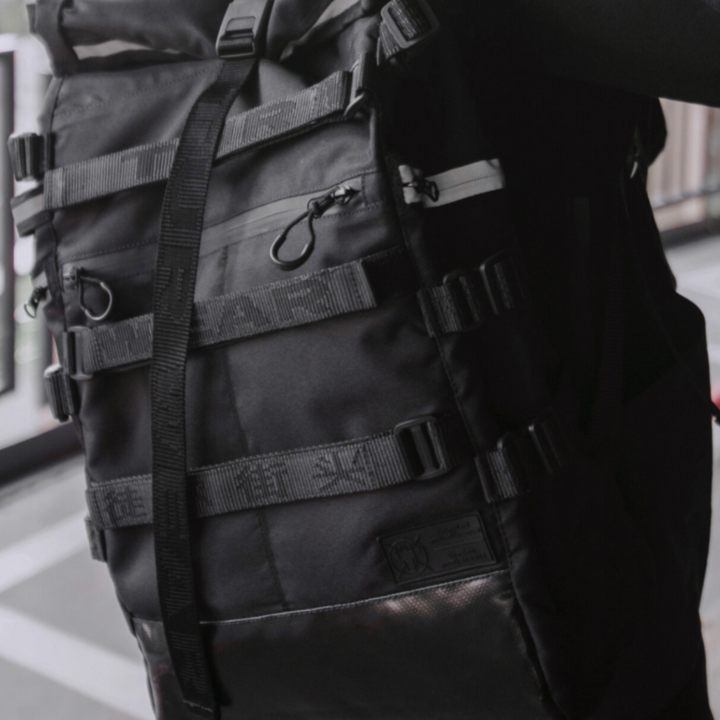 100% polyamide fastenings with magnets, polyester 100% straps, reflective waterproof zippers, branded webbing, 100% nylon Velcro.