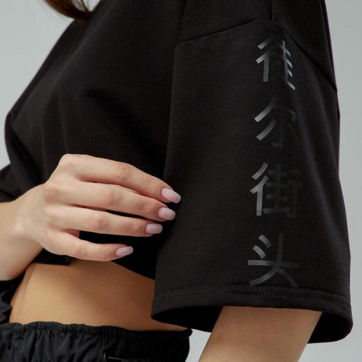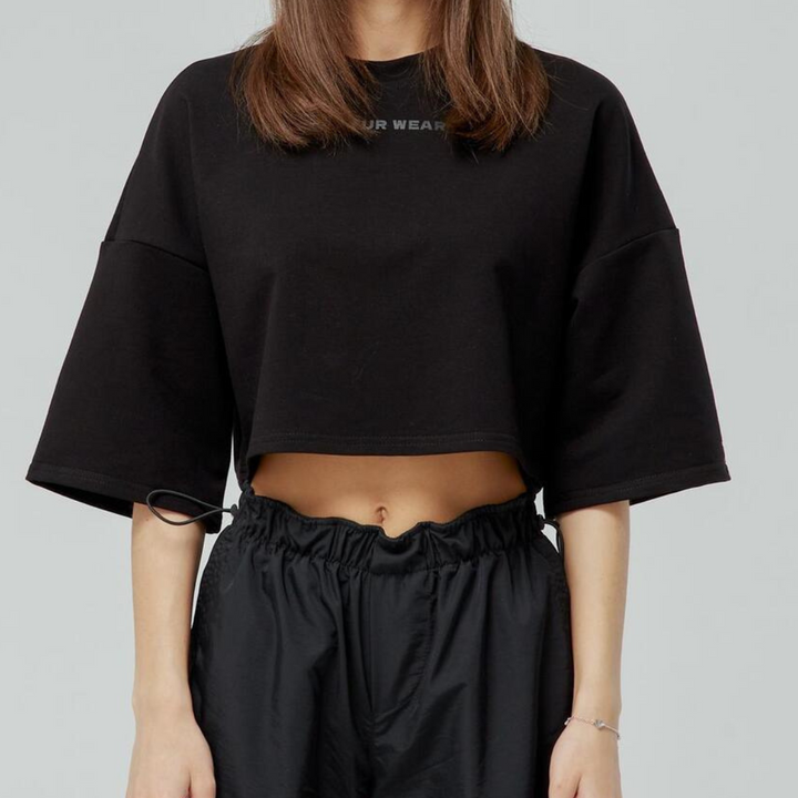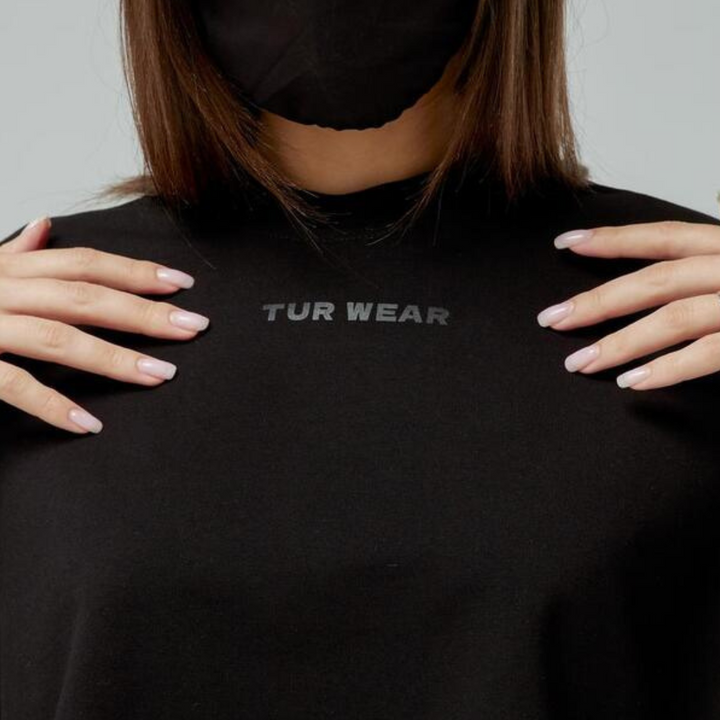A cropped, loose-fit T-shirt with extended sleeves for added comfort and a stylish silhouette. Signature black Japanese characters are embroidered on the left sleeve, and a small "TUR WEAR" print is placed on the front to emphasize the brand identity.