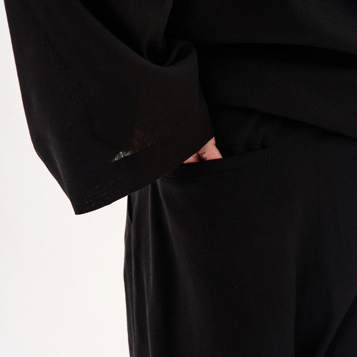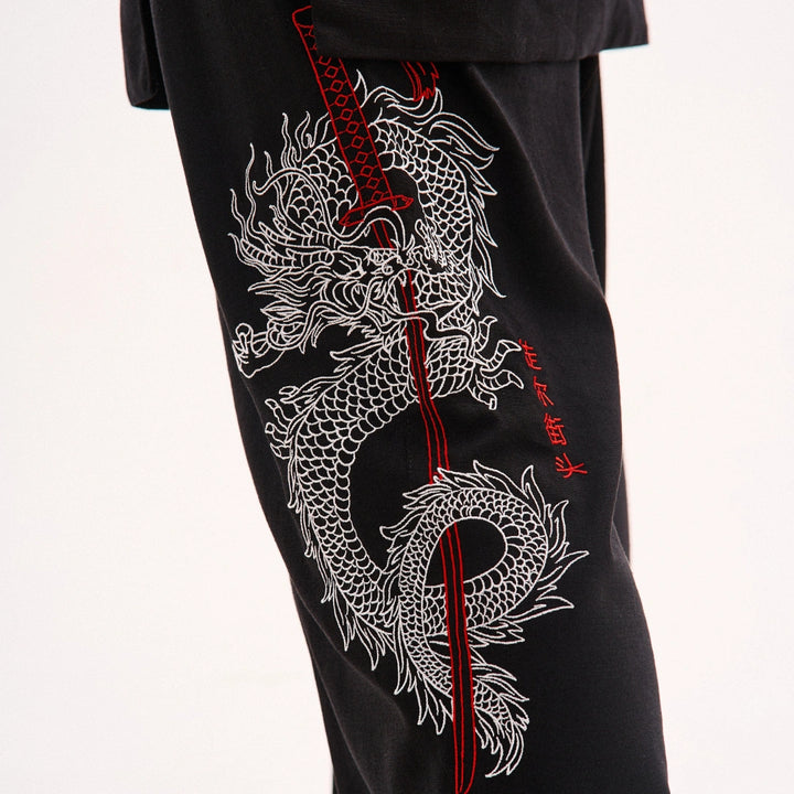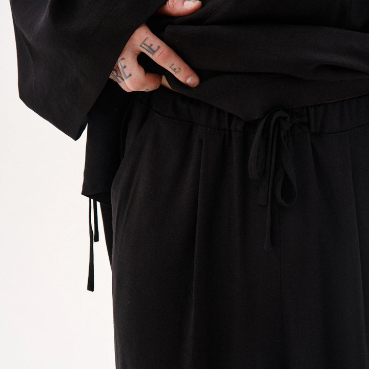 Key features of the model: Wide-leg linen trousers with an adjustable waistband featuring a drawstring and elastic. A Japanese-style print decorates the left leg. Two slanted top pockets, front pleats, and one back pocket. Perfectly pairs with the Haruki kimono or oversized T-shirts.