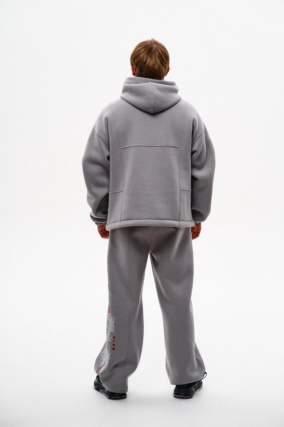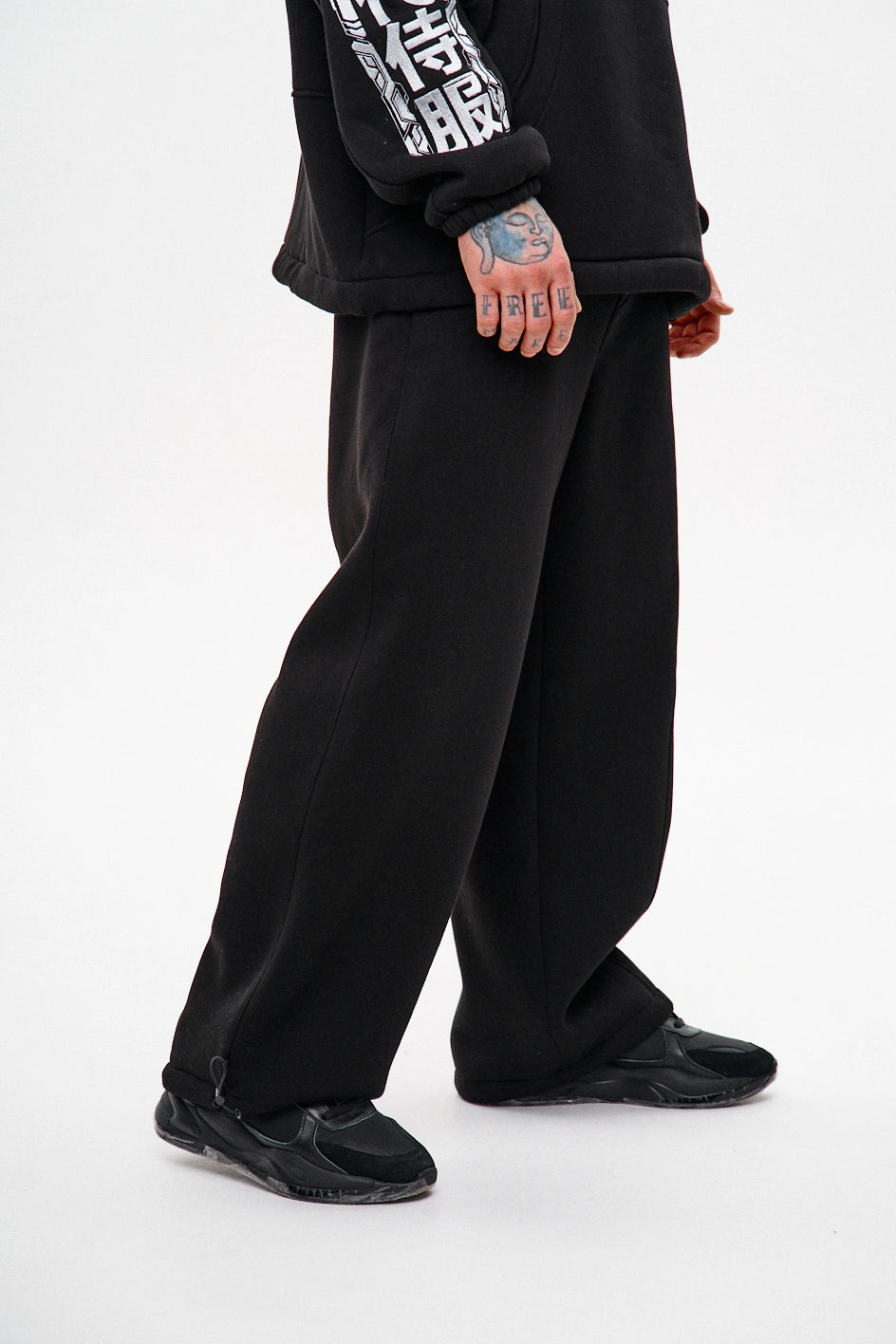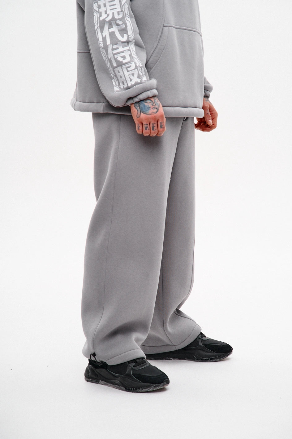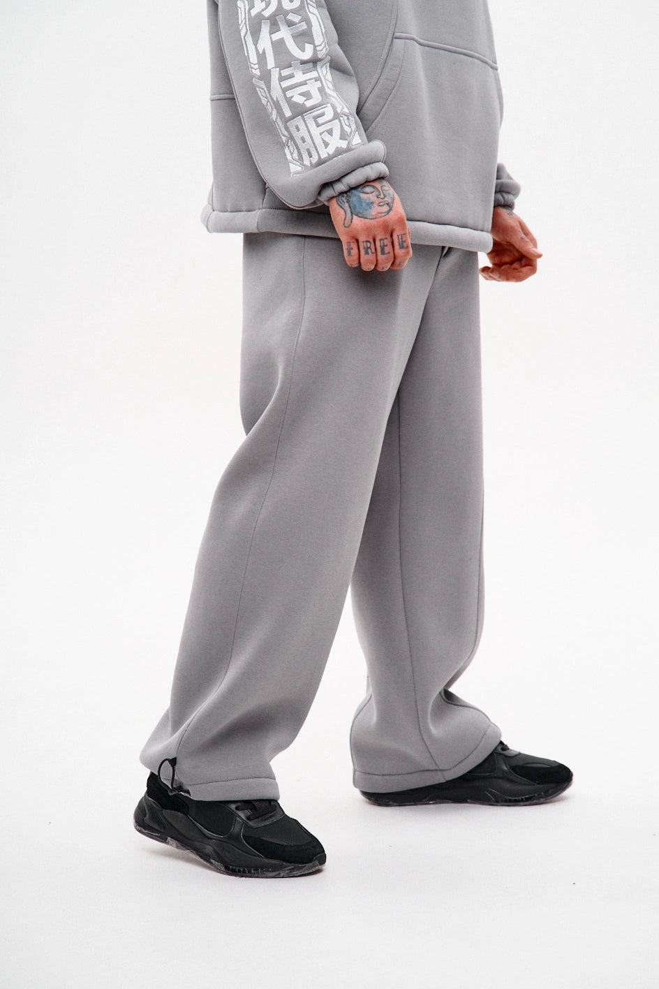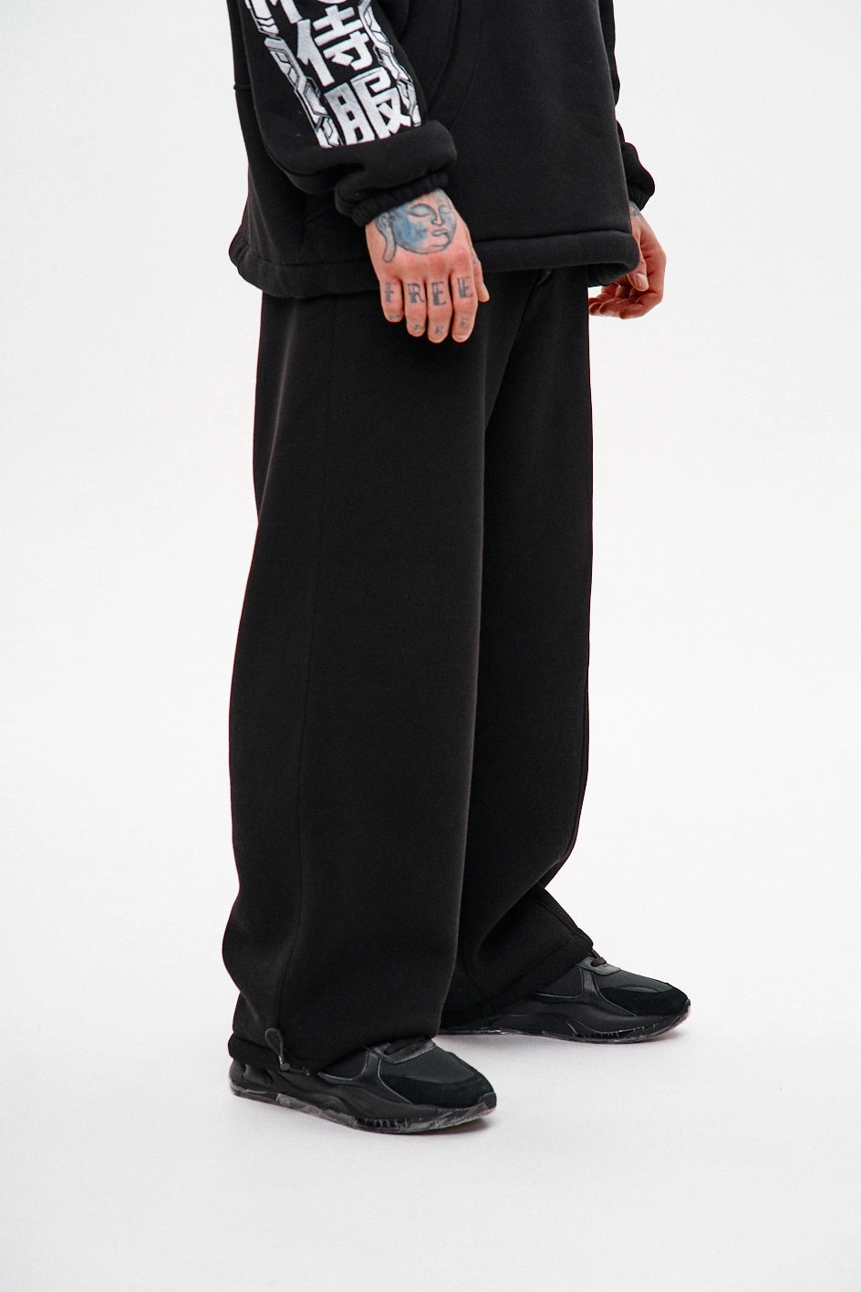 Straight-cut pants made of diagonal three-thread cotton knit with a weight of 450 g/m². Thanks to the high fabric density, the model has a transitional character — in terms of thermal properties, it rivals fleece fabrics (for comparison: standard fleece knit weighs 280 g/m²).