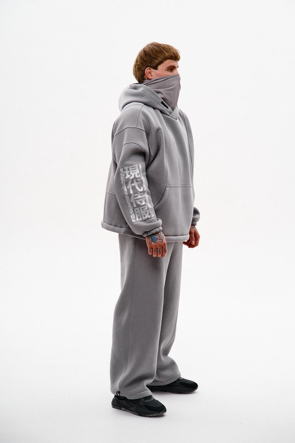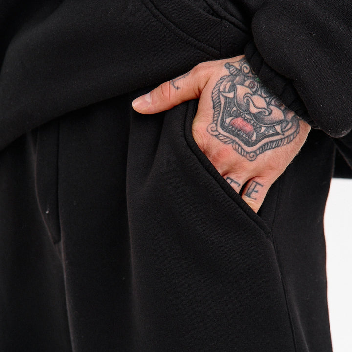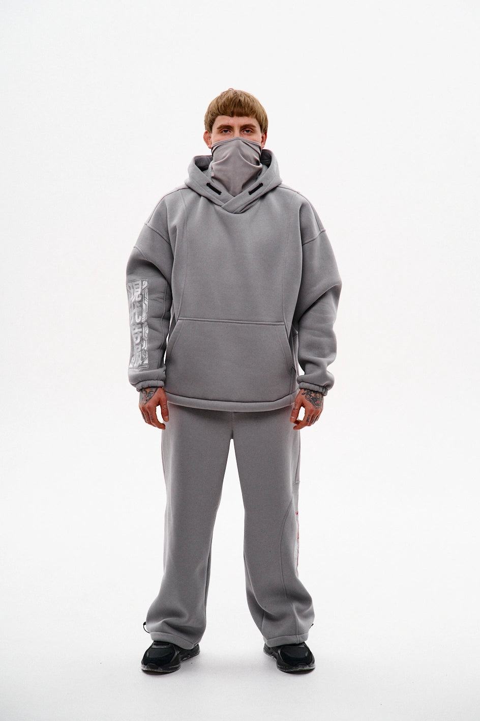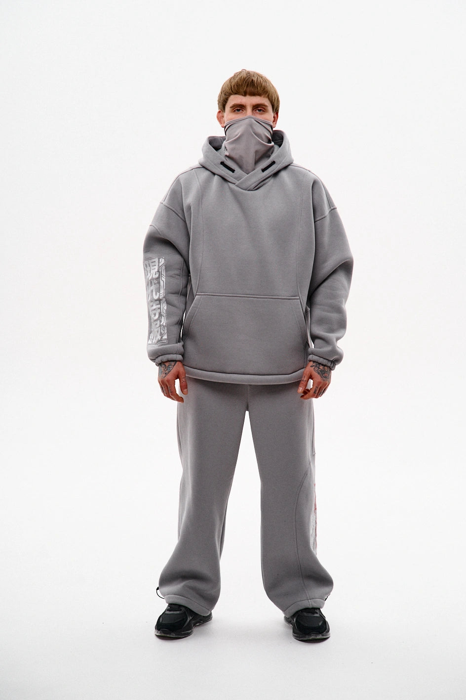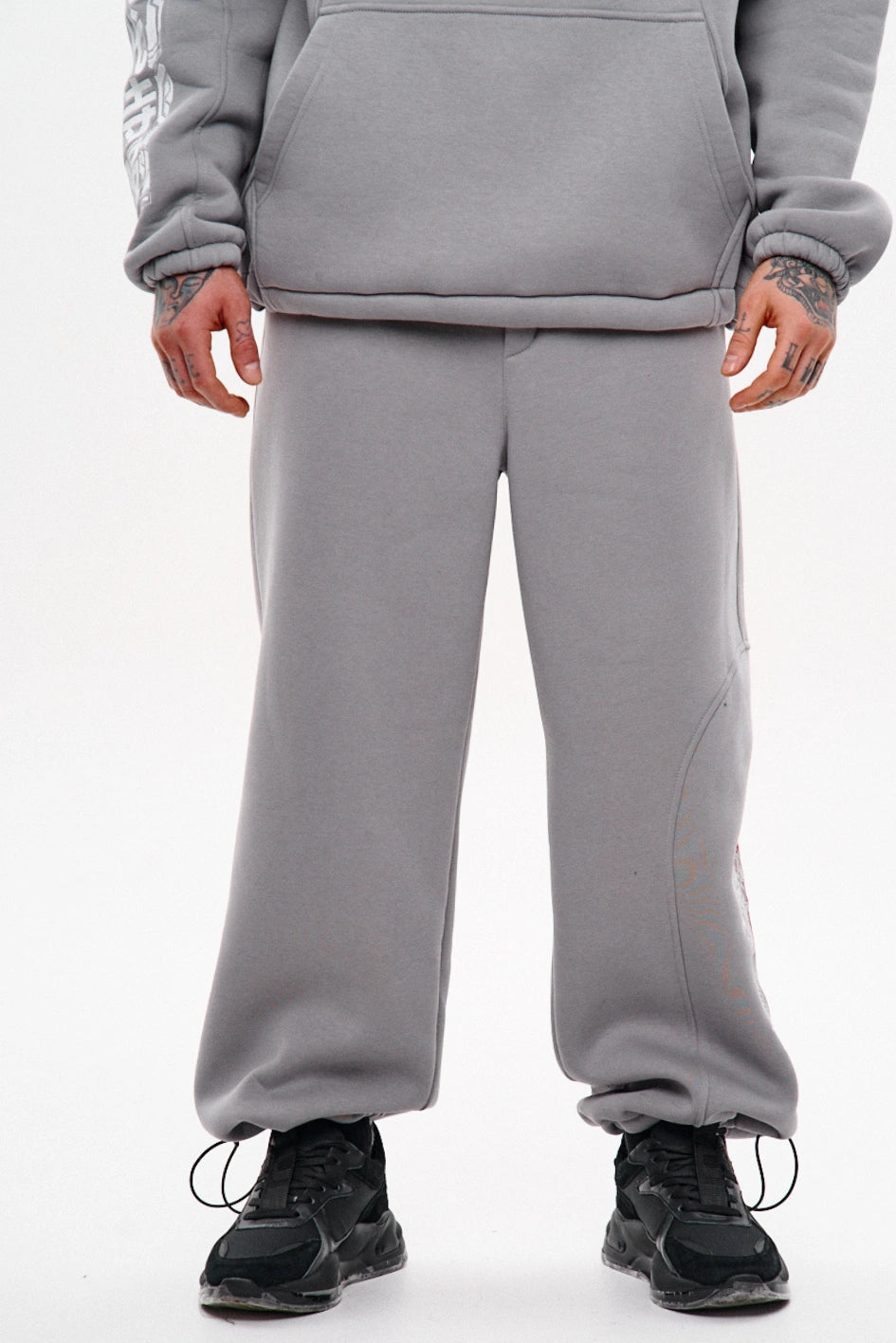 Straight-cut pants made of diagonal three-thread cotton knit with a weight of 450 g/m². Thanks to the high fabric density, the model has a transitional character — in terms of thermal properties, it rivals fleece fabrics (for comparison: standard fleece knit weighs 280 g/m²).