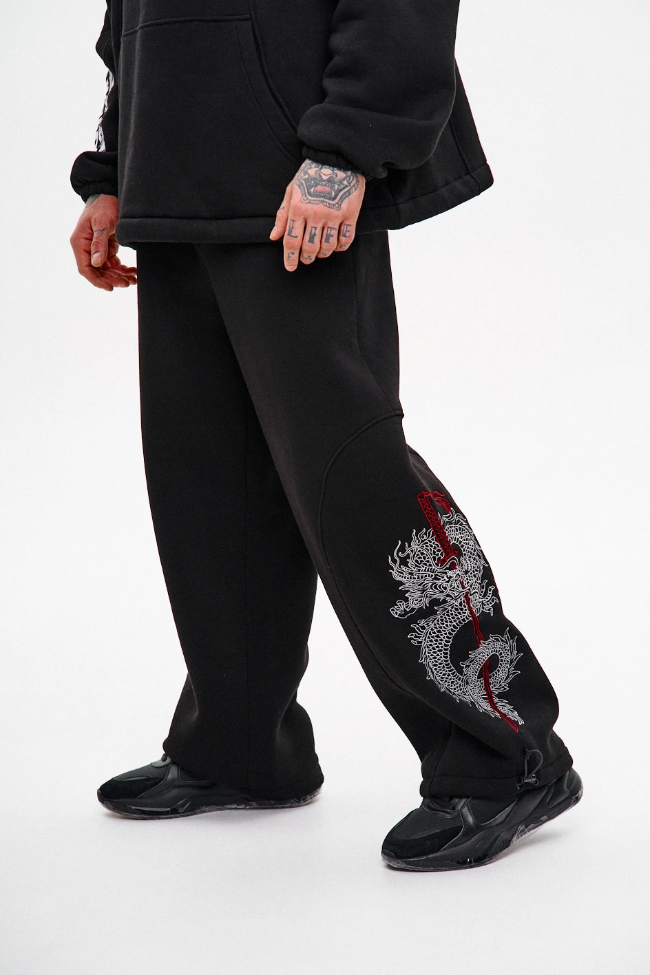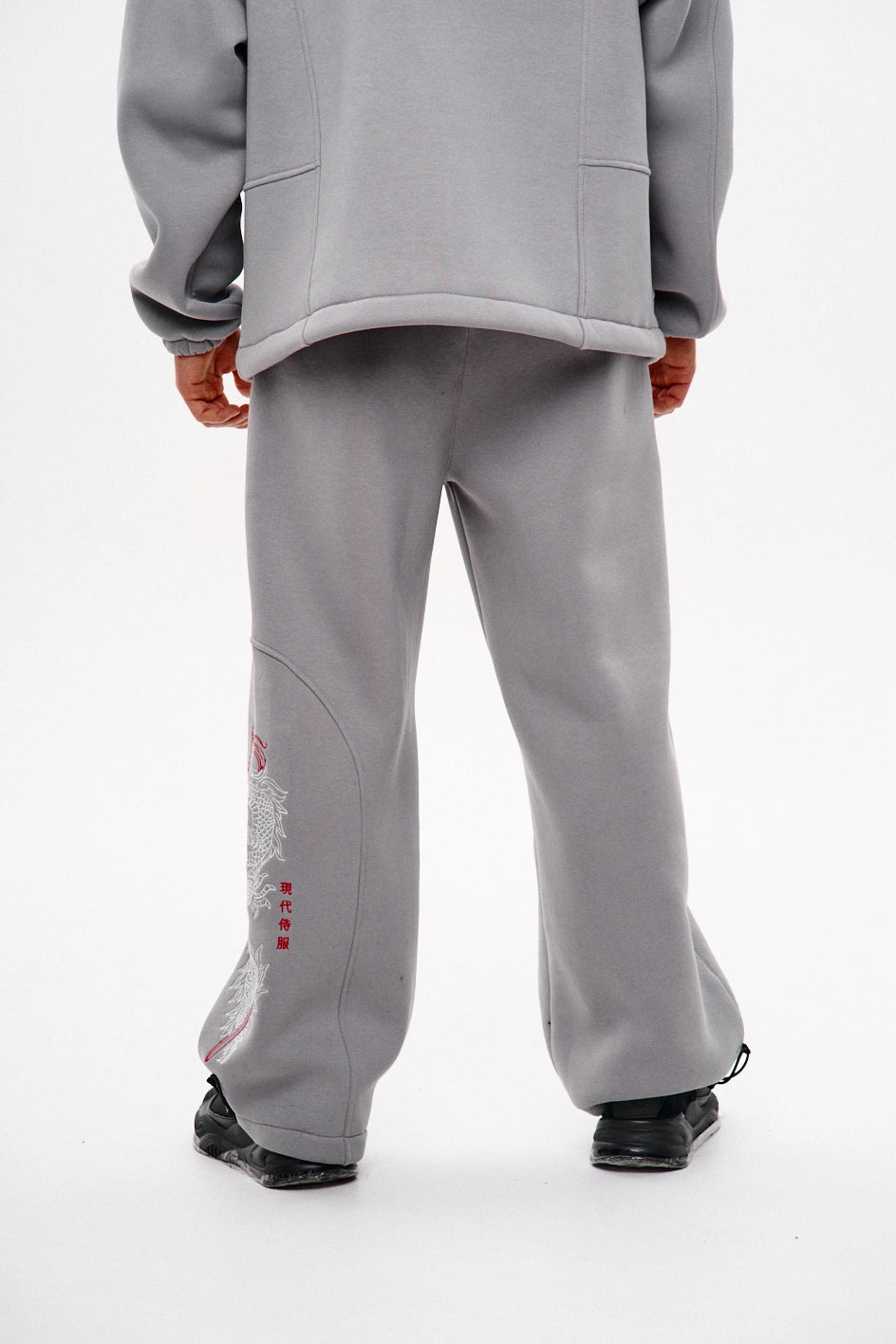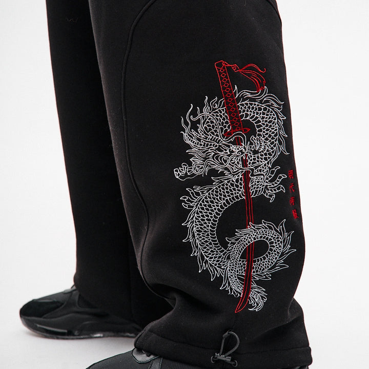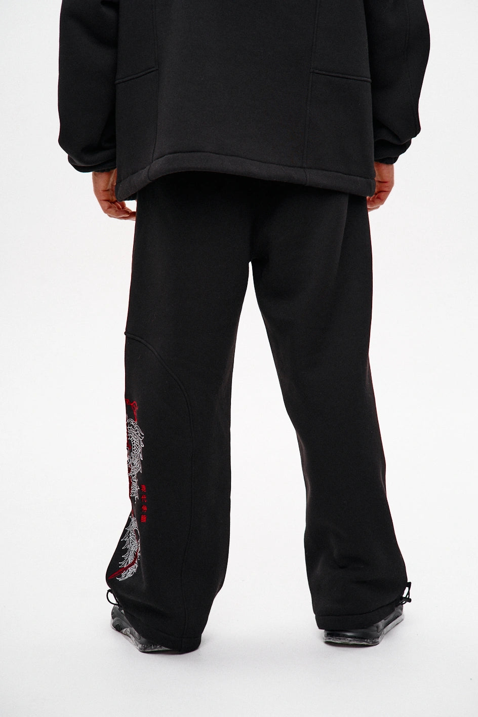 The lower part of the legs features an adjustable elastic drawstring, allowing them to fit various types of footwear. The pants have two front pockets and two back pockets. On the left leg, there is a decorative element with embroidery in a Japanese style.