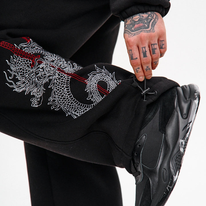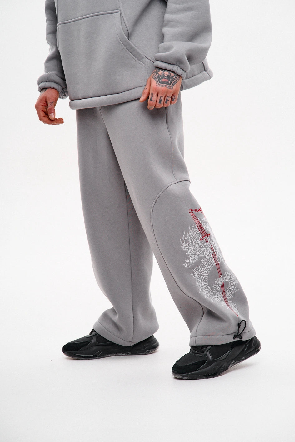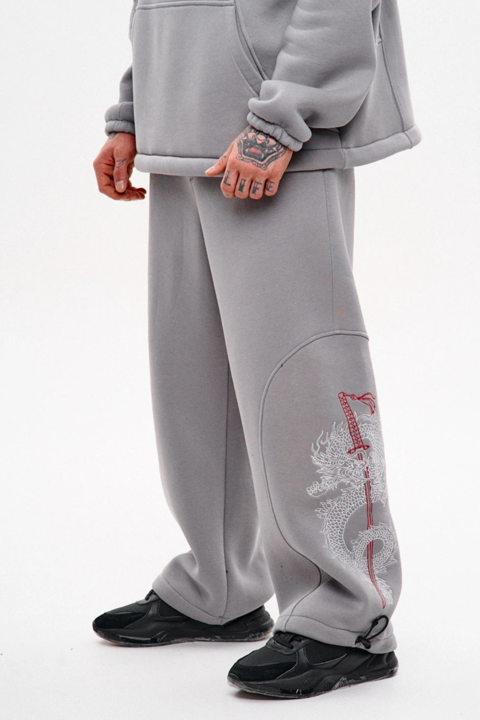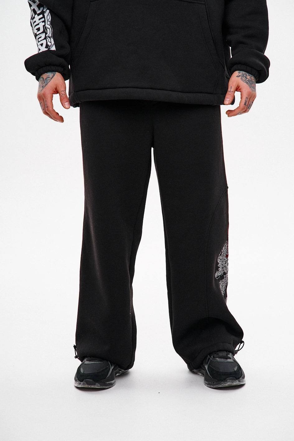 The lower part of the legs features an adjustable elastic drawstring, allowing them to fit various types of footwear. The pants have two front pockets and two back pockets. On the left leg, there is a decorative element with embroidery in a Japanese style.