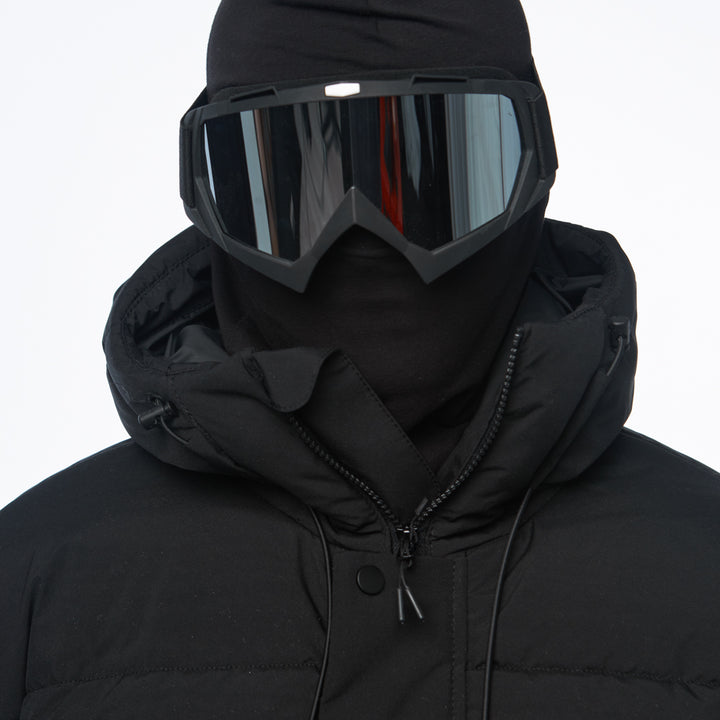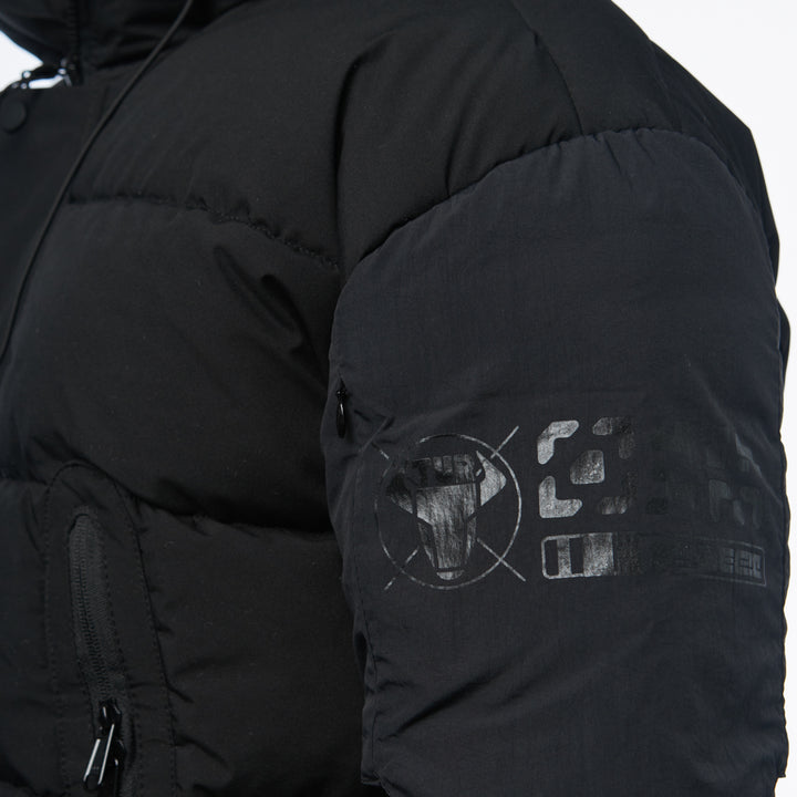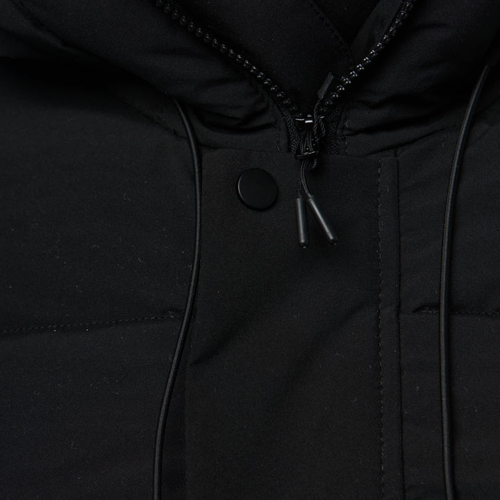 A mid-length down jacket with a high collar and hood for reliable protection against the cold. A placket with a hidden zipper and snap buttons on the front provides convenience and wind protection. Slash pockets in the front, and a pocket with a black branded print on the left sleeve. The bottom of the jacket features a drawstring with fasteners for adjusting the fit. This down jacket is designed for temperatures down to -20°C, ensuring warmth and comfort even in harsh conditions.