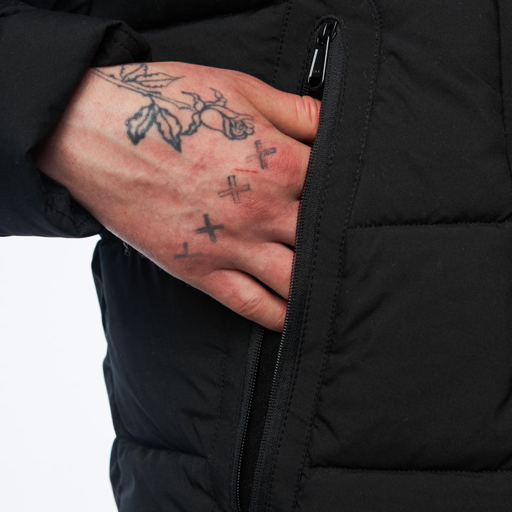 Artic fabric — a technical material that combines durability and lightness. Synthetic down filling provides comfort and warmth without excess volume. Microfleece in the pockets adds extra insulation. The jacket is equipped with YKK zippers — reliable hardware that withstands heavy use. The polyester lining adds convenience and wear resistance.