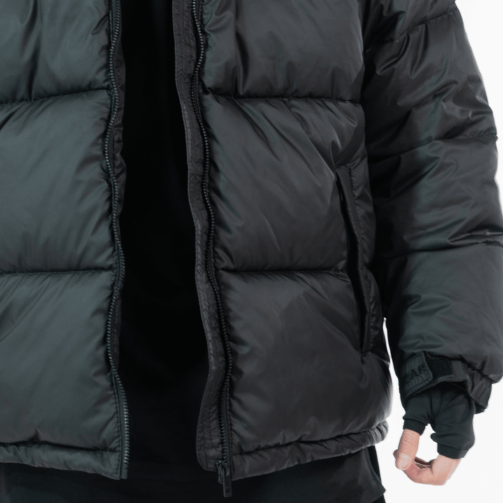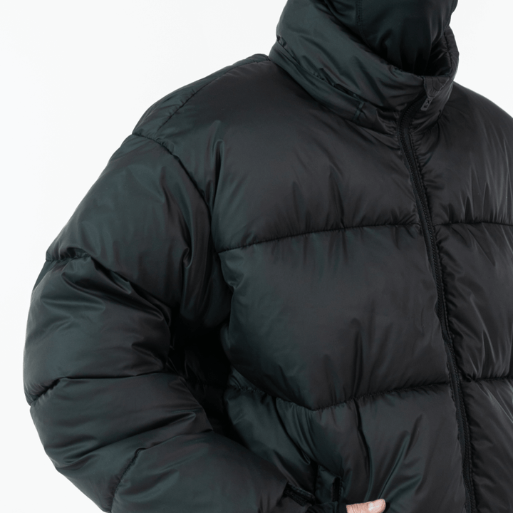 A voluminous mid-length winter jacket with a high collar for maximum protection. Elastic cuffs, two front pockets, and one interior pocket provide convenience and insulation. Adjustable side drawcords at the hem let you fine-tune the fit. The jacket zips up the front and features a hood that hides inside the collar with a zip closure. Finished with a subtle black embroidered Tur Wear logo on the sleeve. Designed for temperatures down to -20°C — comfort without compromise in cold weather.