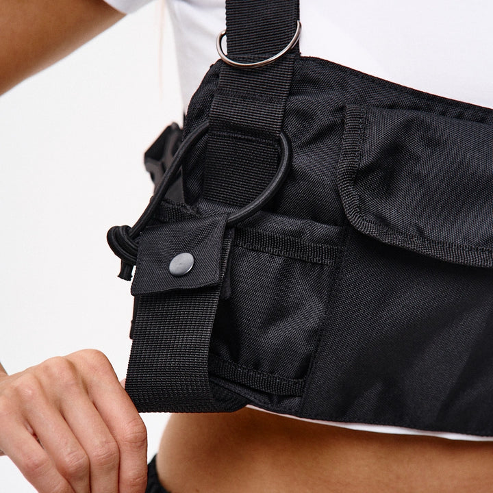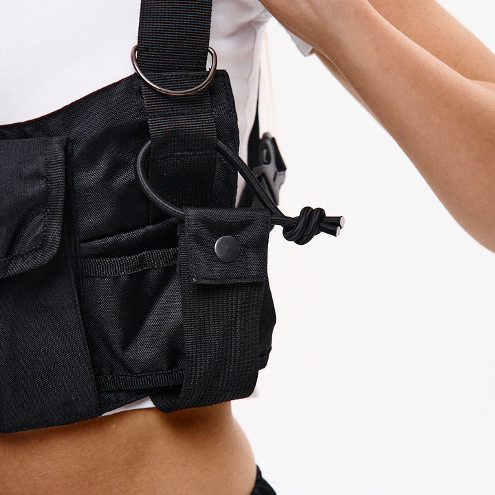 A chest bag with three front pockets. The length of the straps is adjustable. There are auxiliary rings for carrying various items.