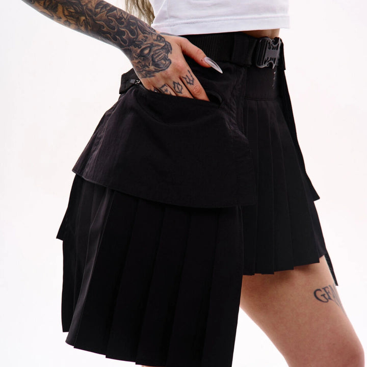 Wrap skirt with pleats fitted on the hips, sitting on a wide waistband. Inside, there is a belt strap with a fast-release buckle. On the sides, two detachable pockets made of crinkle fabric fasten with spiral reverse zippers.