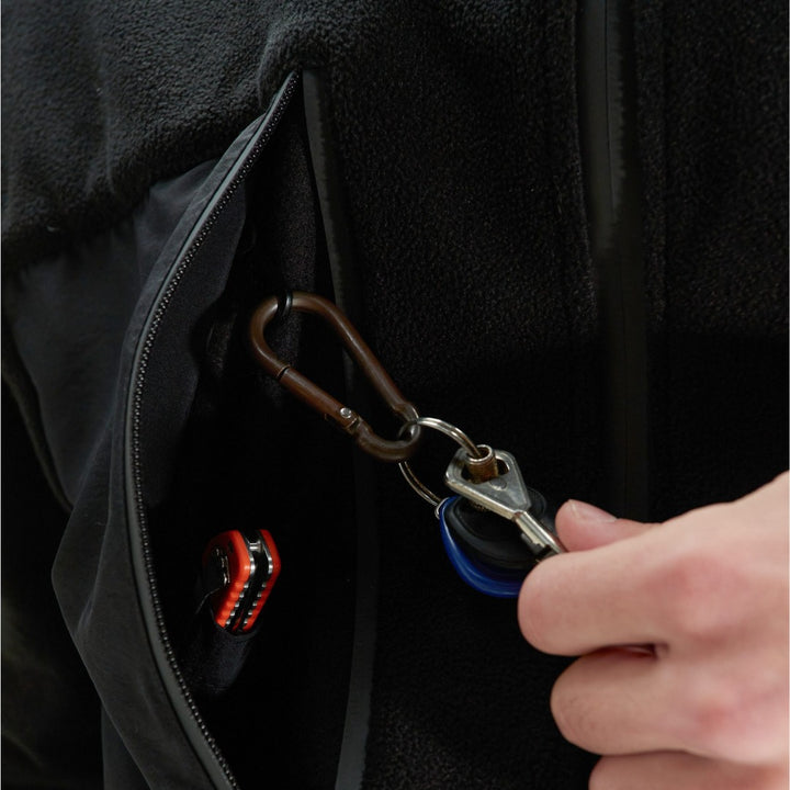 The left chest pocket contains a phone compartment; the right includes an earbud pocket and a webbing strap with a hook for keys.