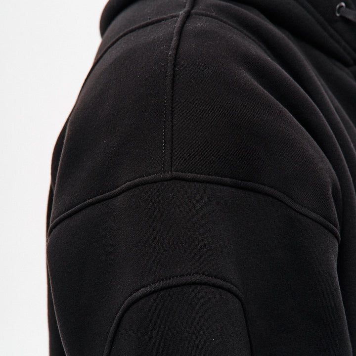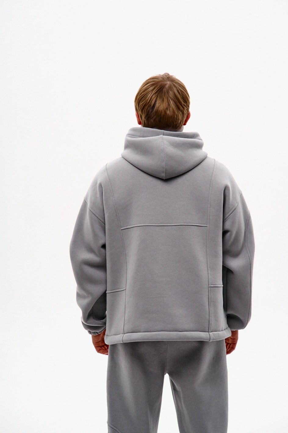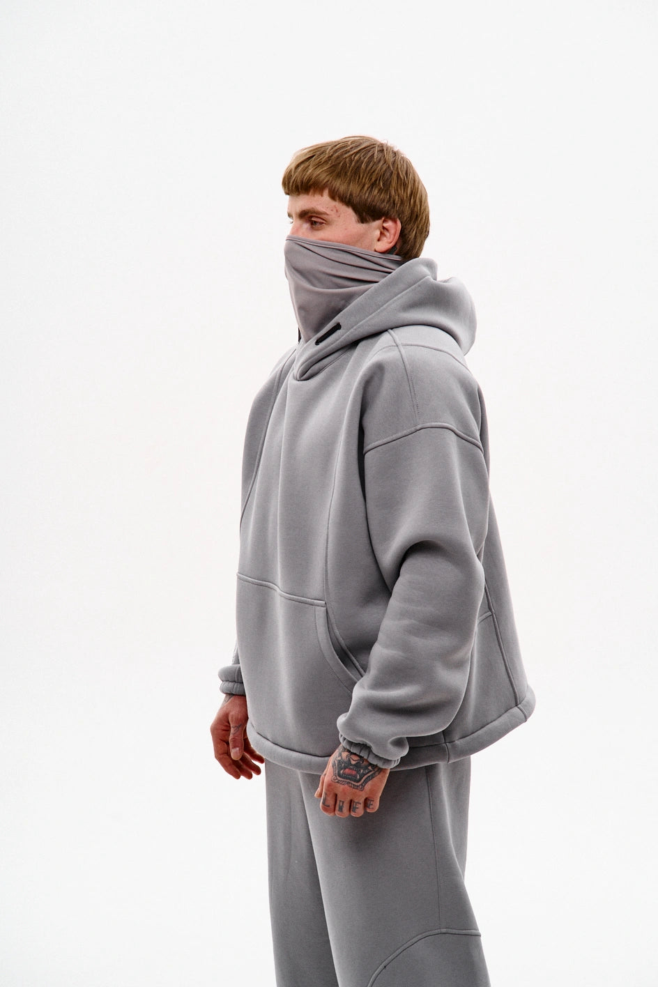Model ma złożony krój z profilowanymi przeszyciami, które tworzą charakterystyczny kształt i unikalny design. Z przodu znajduje się duża kieszeń typu „kangur”. W kaptur wszyta została kominiarka-buff z materiału Coolmax — oddychającego i przyjemnego w dotyku, który nie powoduje przegrzania.