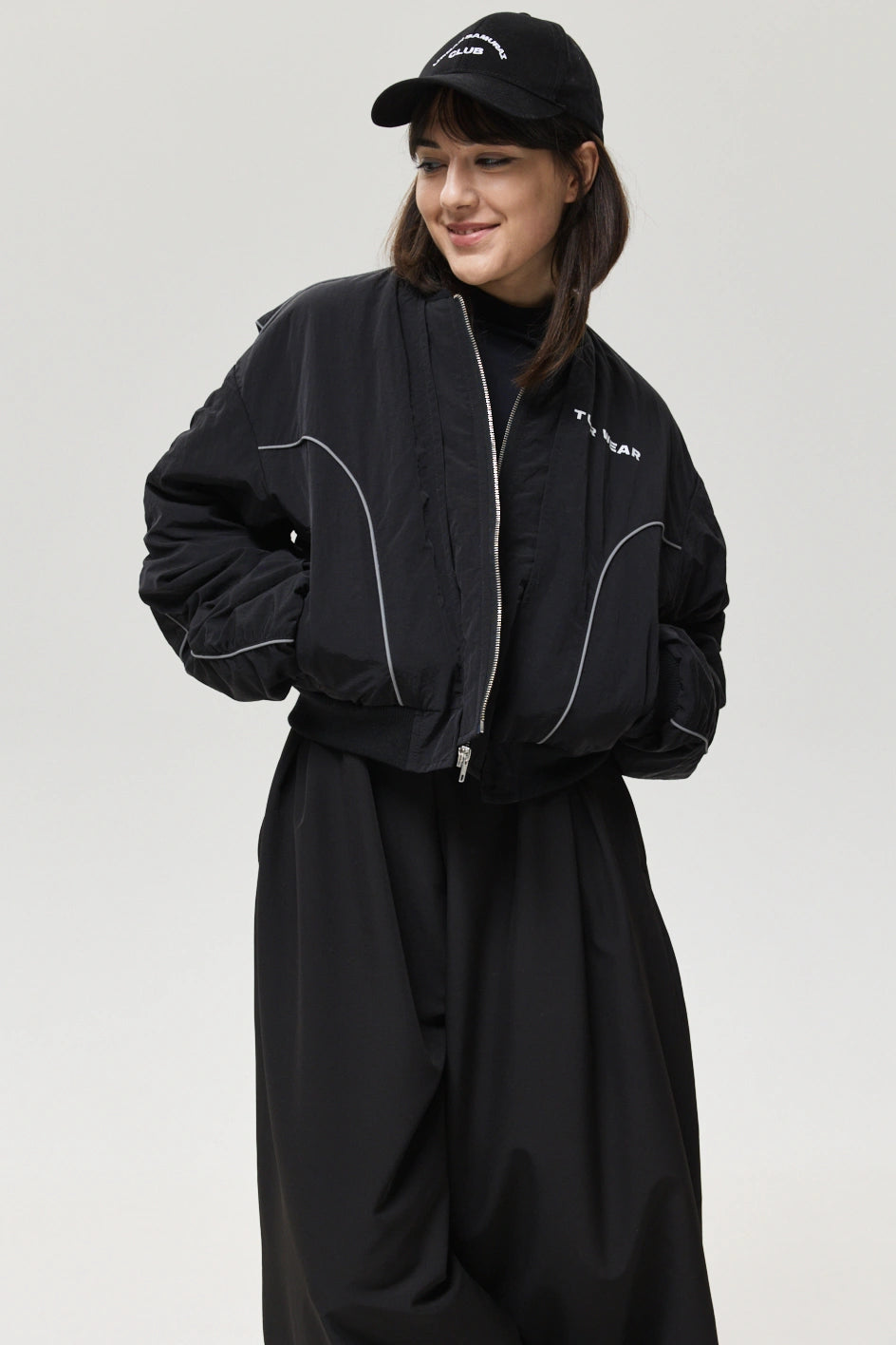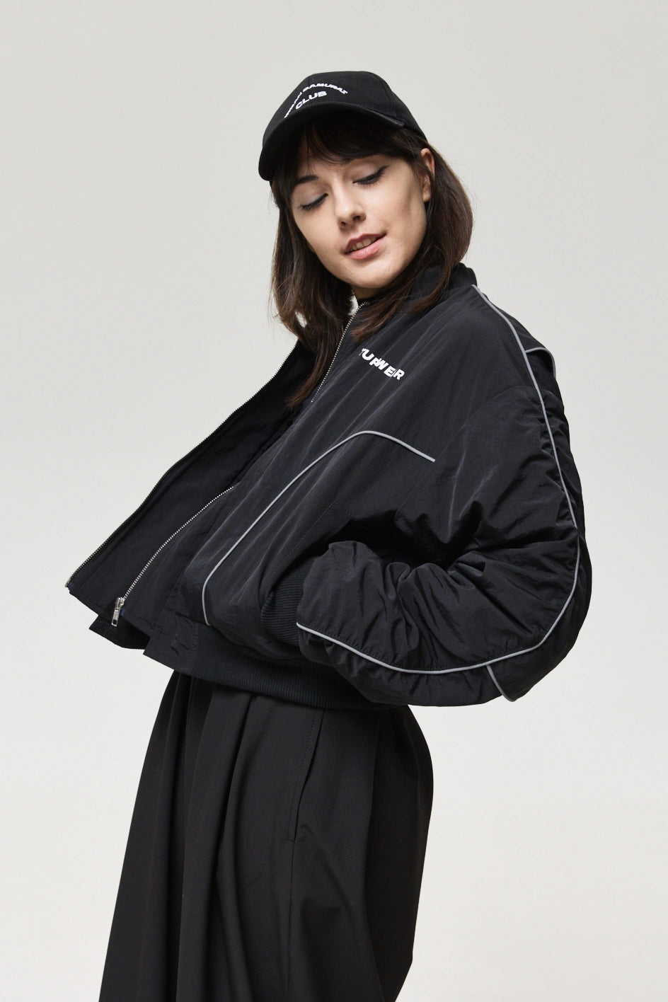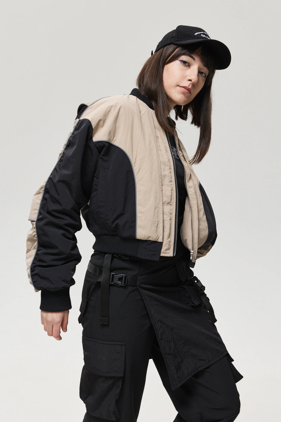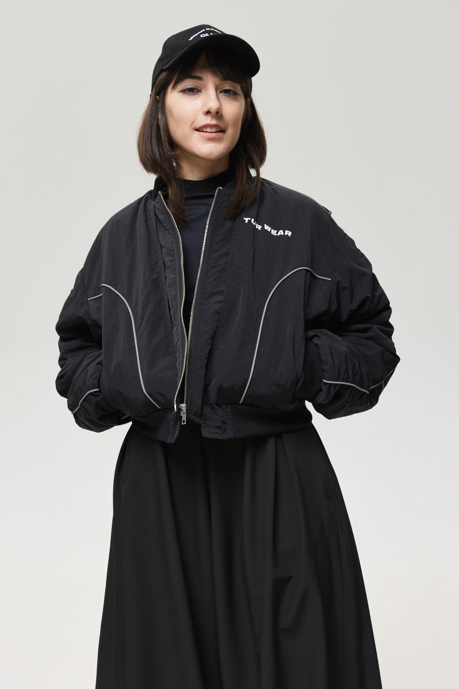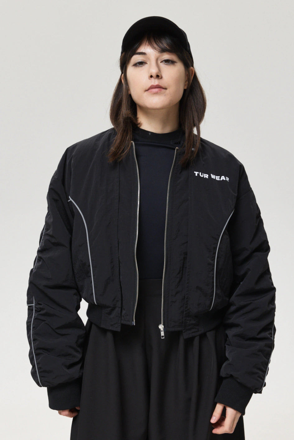Damska kurtka bomber o kroju oversize z dekoracyjnymi odblaskowymi lamówkami, które podkreślają nowoczesny design. Model posiada cztery kieszenie: dwie zewnętrzne i dwie wewnętrzne dla większej funkcjonalności. Kurtka ocieplona lekkim syntetycznym puchem, dzięki czemu jest ciepła, ale nie nadmiernie obszerna. Nadruki z przodu i z tyłu dodają charakteru.