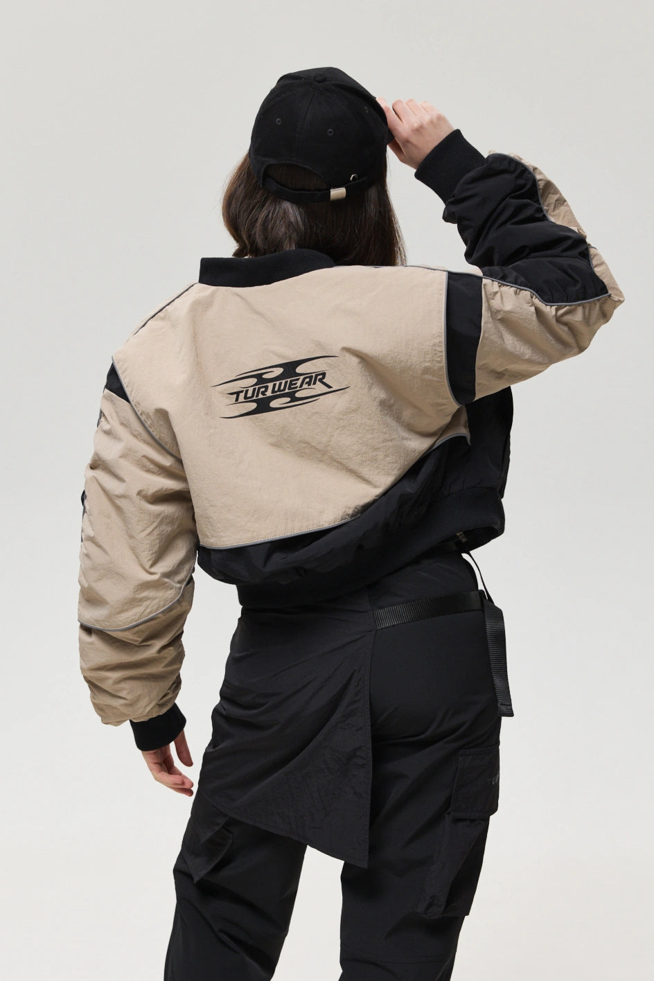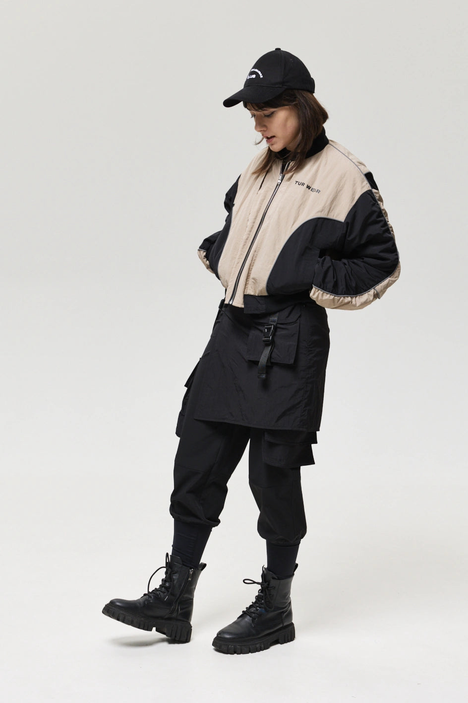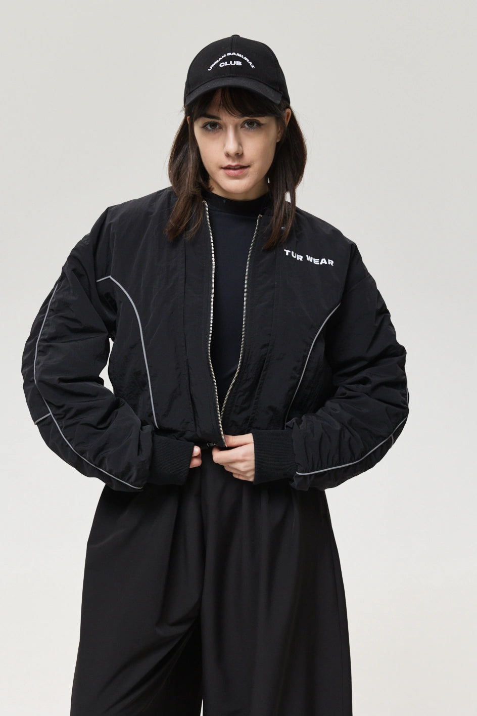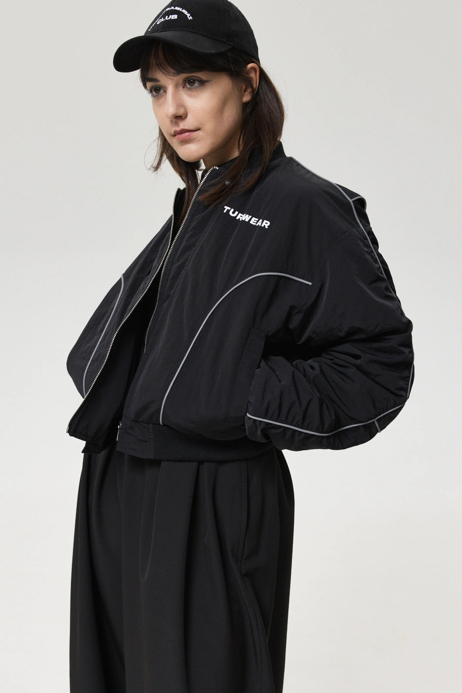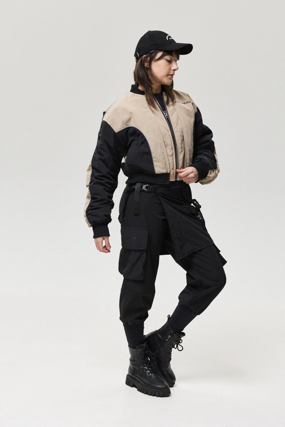 Damska kurtka bomber o kroju oversize z dekoracyjnymi odblaskowymi lamówkami, które podkreślają nowoczesny design. Model posiada cztery kieszenie: dwie zewnętrzne i dwie wewnętrzne dla większej funkcjonalności. Kurtka ocieplona lekkim syntetycznym puchem, dzięki czemu jest ciepła, ale nie nadmiernie obszerna. Nadruki z przodu i z tyłu dodają charakteru.