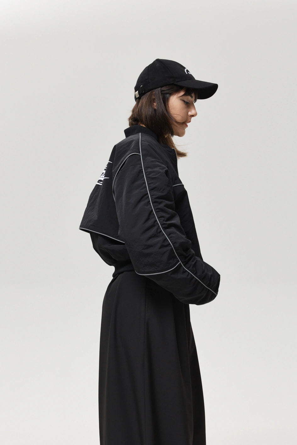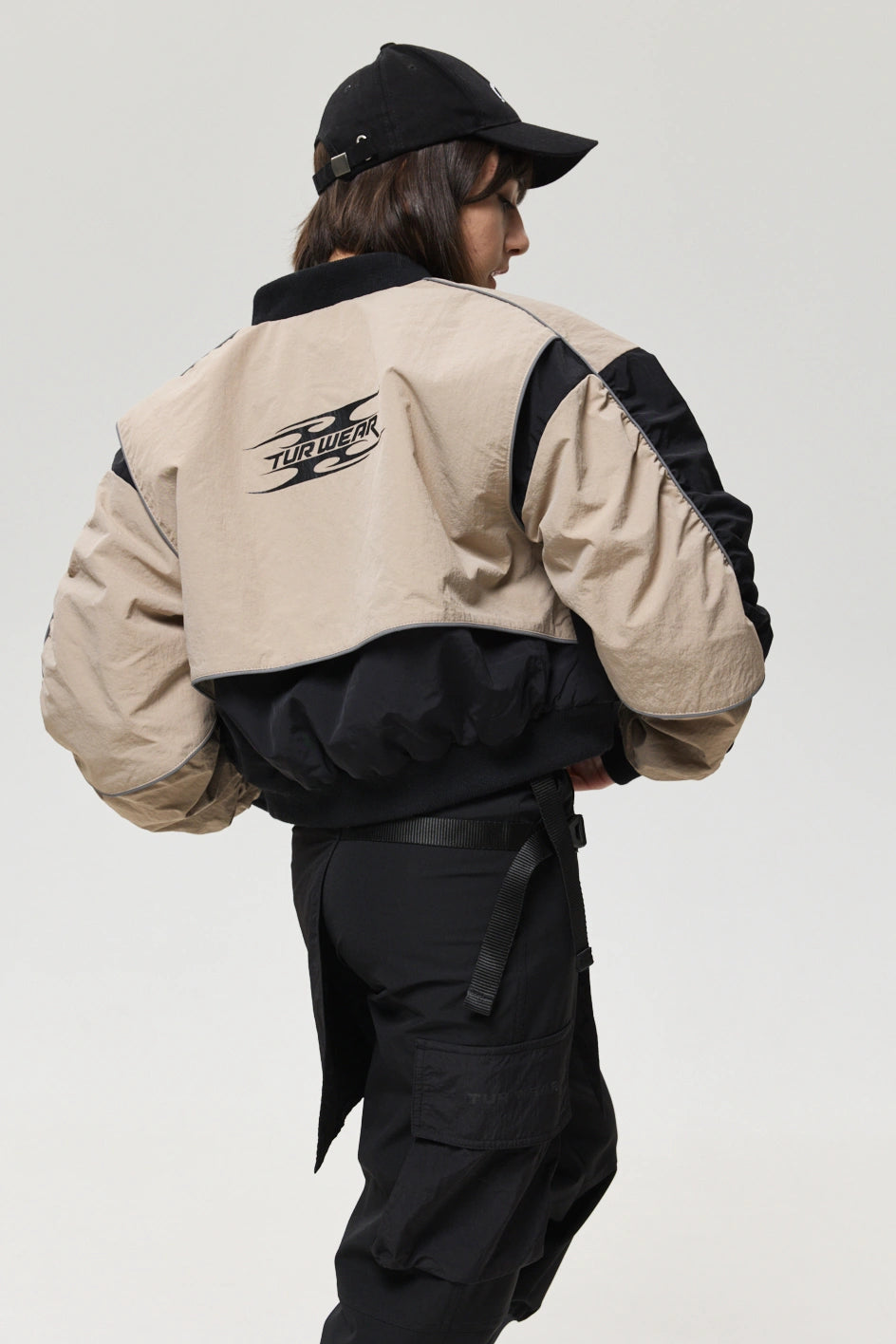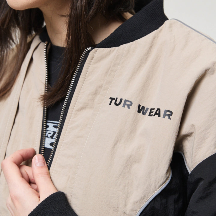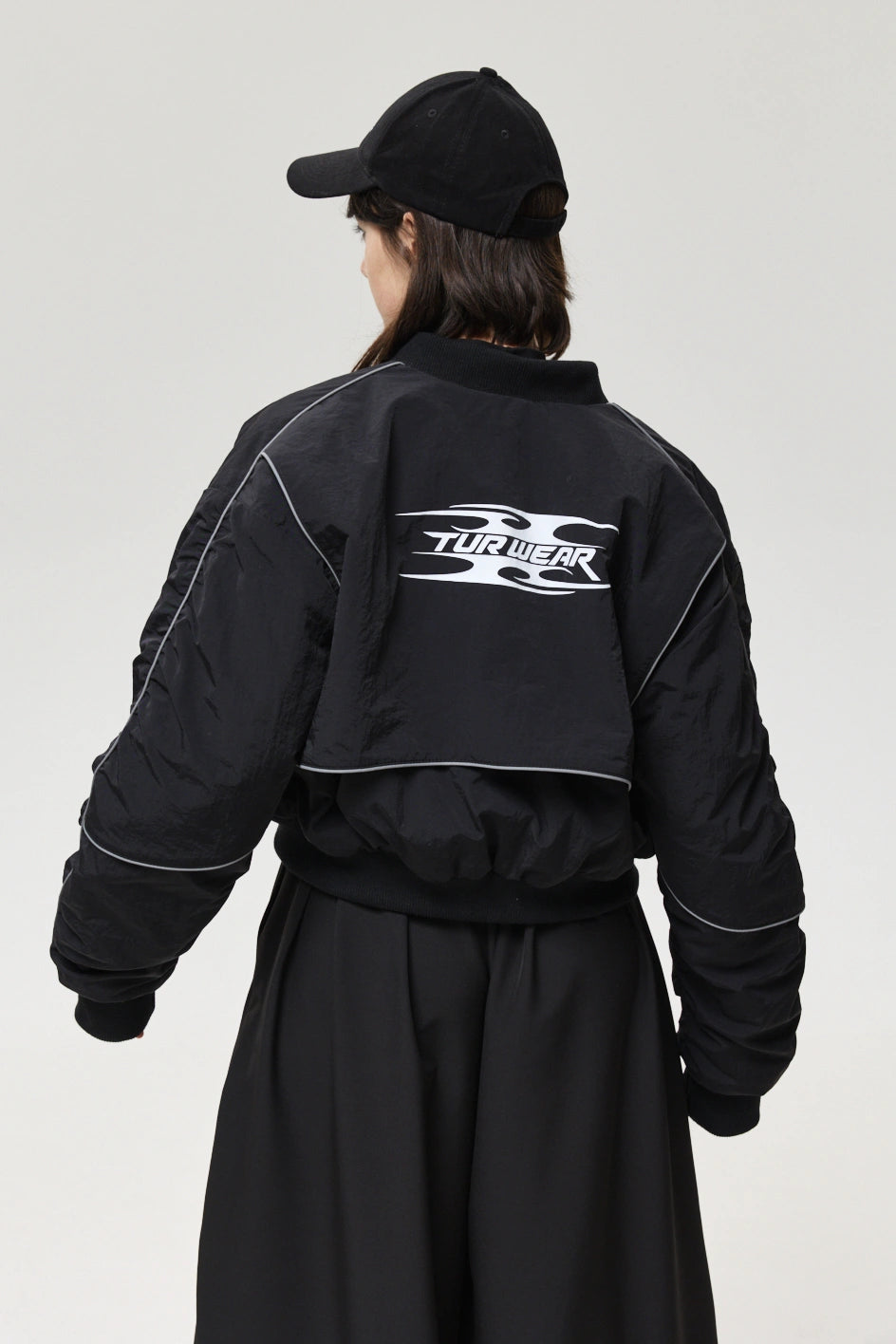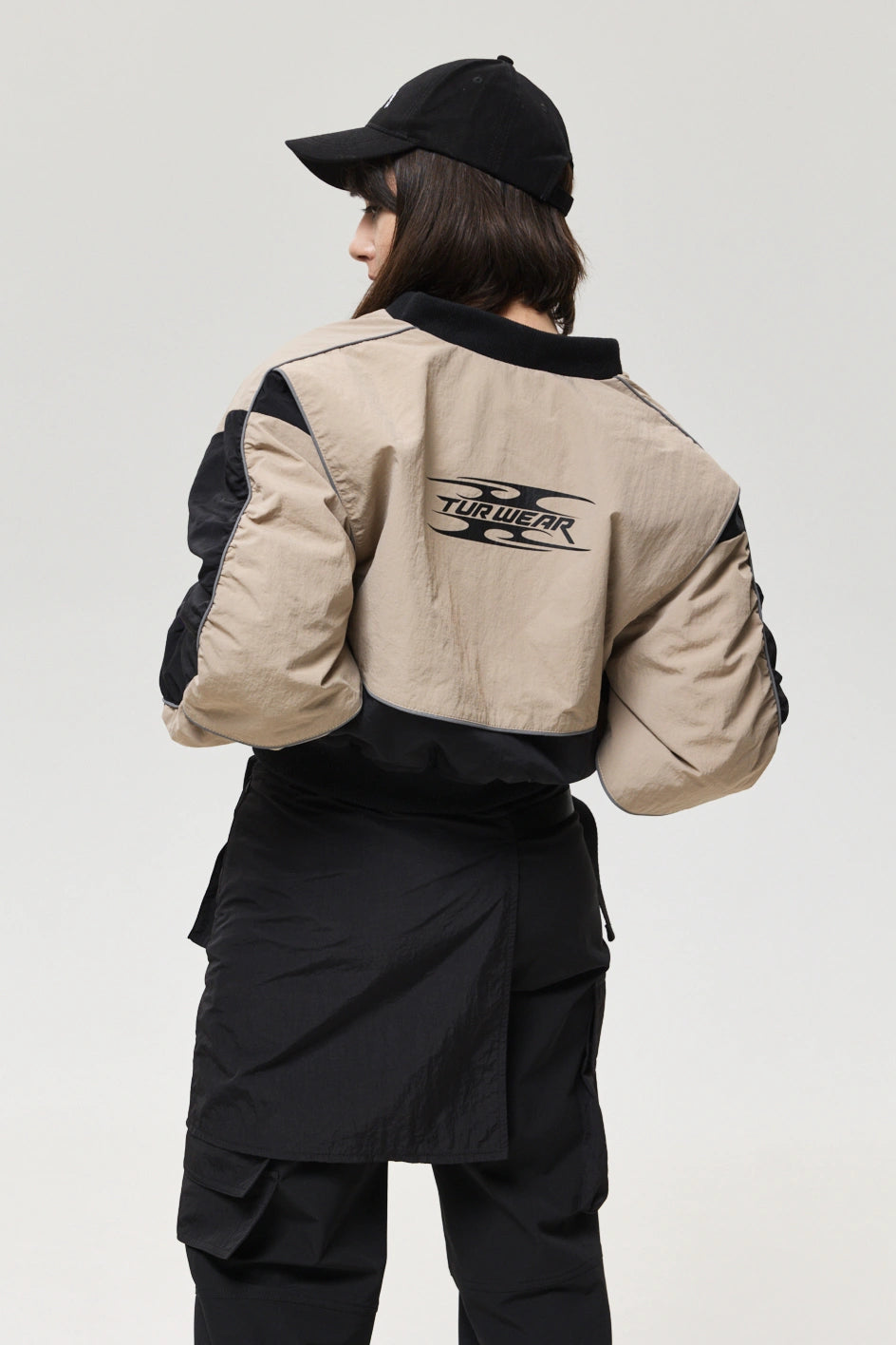Damska kurtka bomber o kroju oversize z dekoracyjnymi odblaskowymi lamówkami, które podkreślają nowoczesny design. Model posiada cztery kieszenie: dwie zewnętrzne i dwie wewnętrzne dla większej funkcjonalności. Kurtka ocieplona lekkim syntetycznym puchem, dzięki czemu jest ciepła, ale nie nadmiernie obszerna. Nadruki z przodu i z tyłu dodają charakteru.