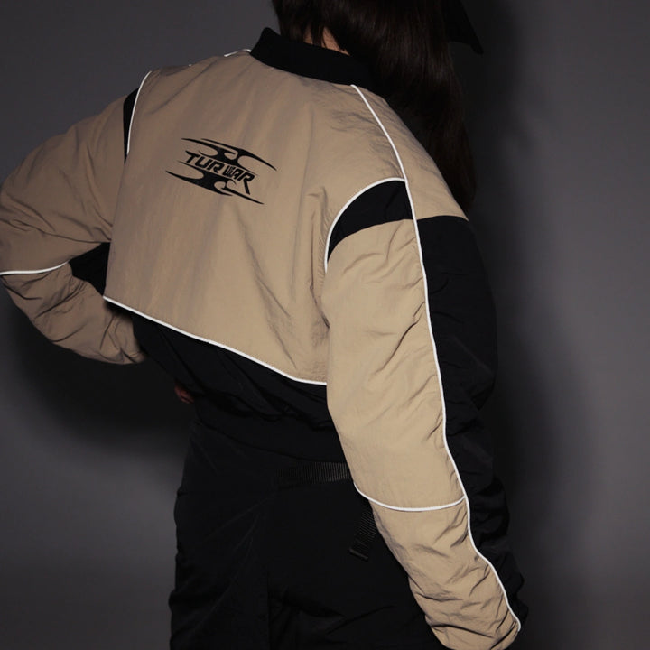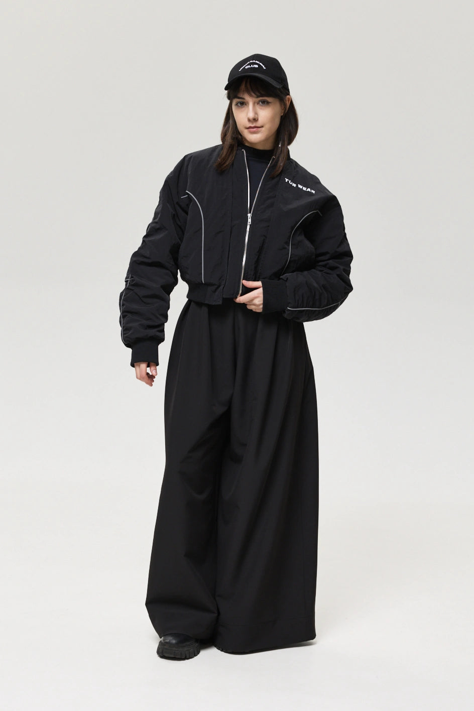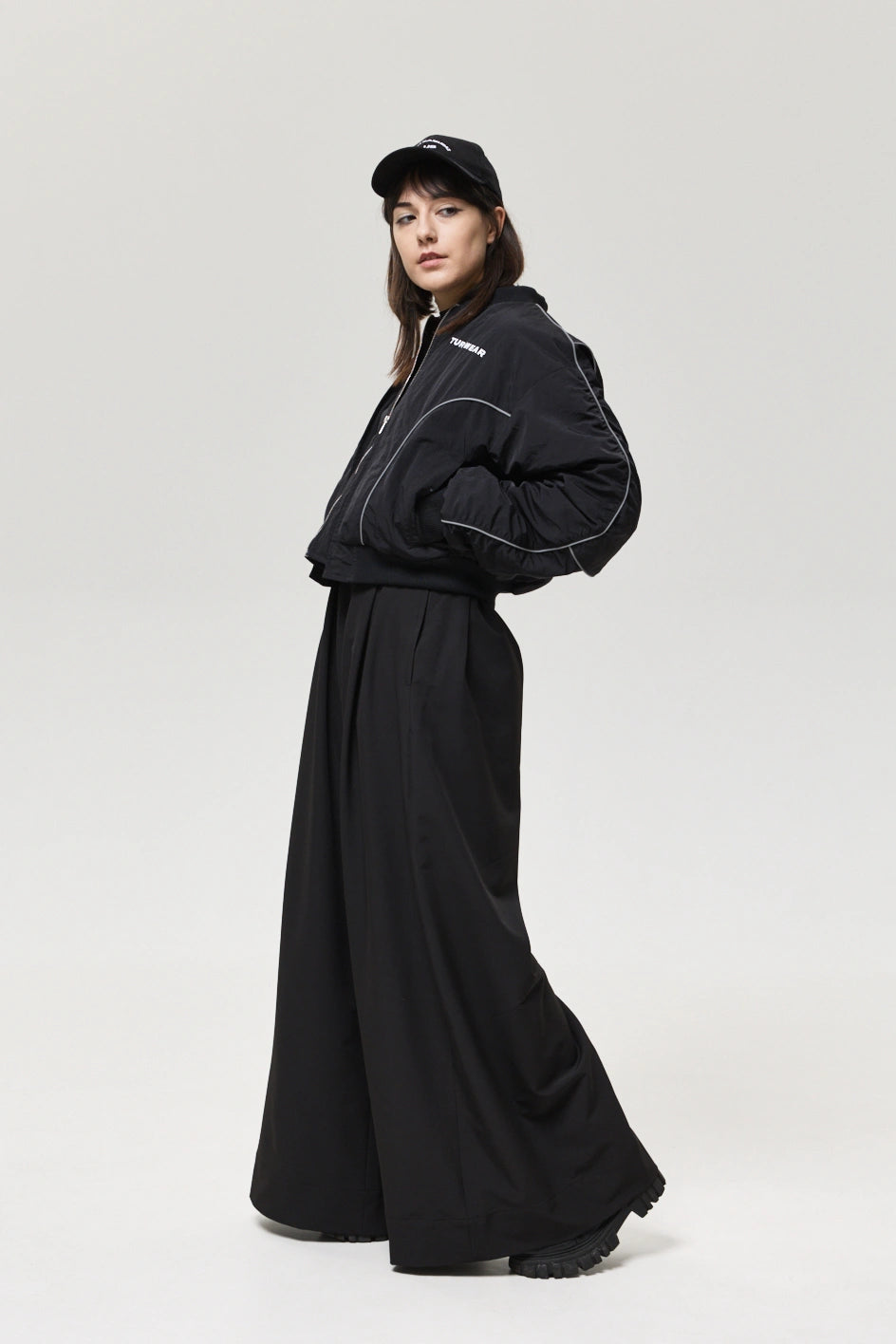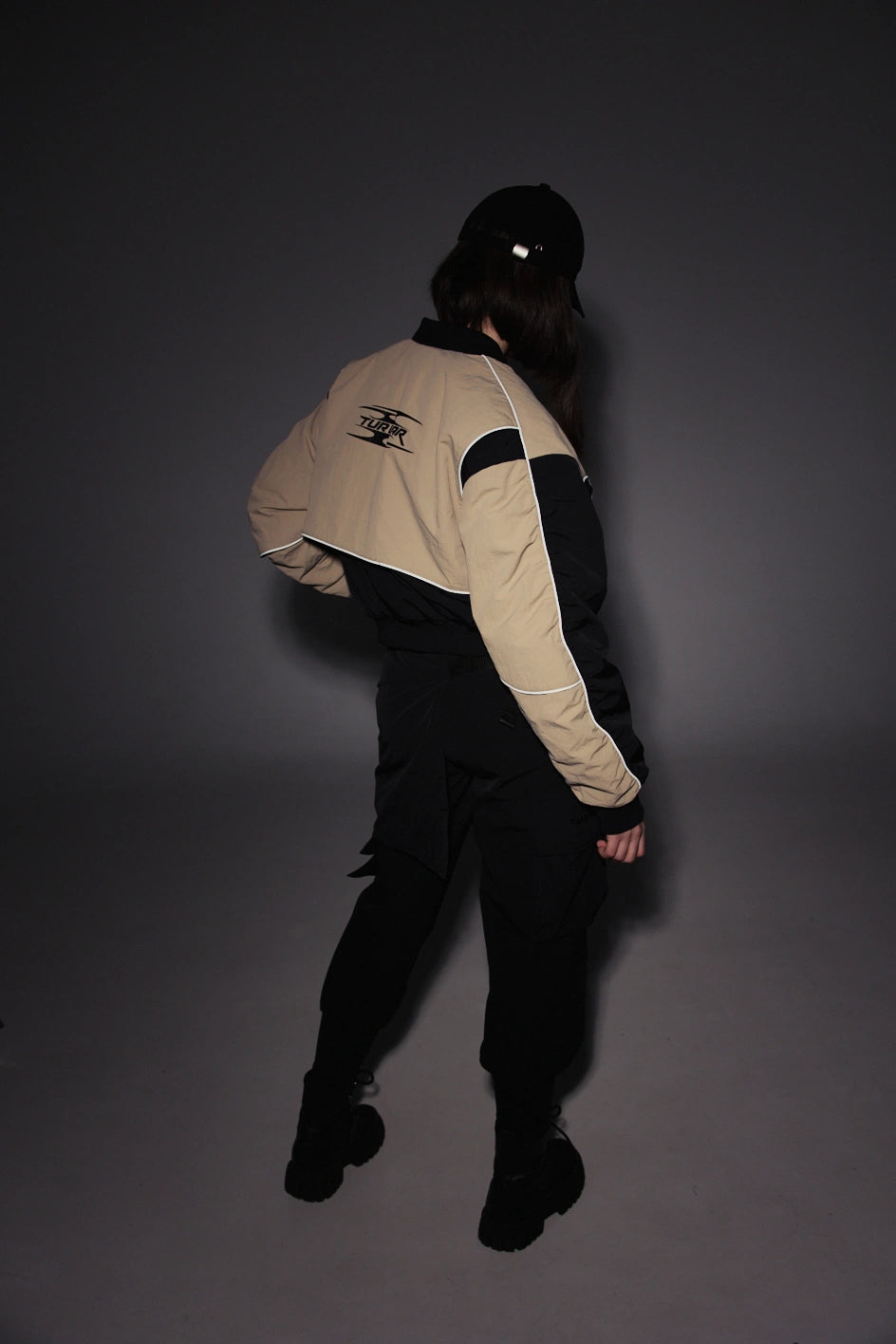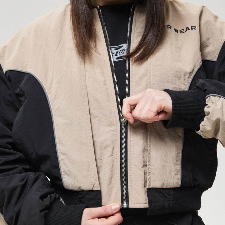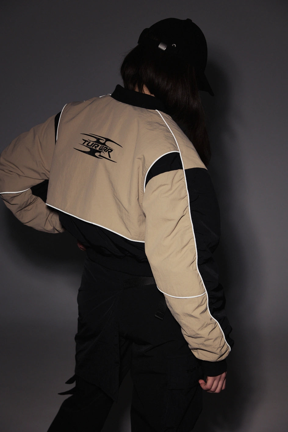 Damska kurtka bomber o kroju oversize z dekoracyjnymi odblaskowymi lamówkami, które podkreślają nowoczesny design. Model posiada cztery kieszenie: dwie zewnętrzne i dwie wewnętrzne dla większej funkcjonalności. Kurtka ocieplona lekkim syntetycznym puchem, dzięki czemu jest ciepła, ale nie nadmiernie obszerna. Nadruki z przodu i z tyłu dodają charakteru.