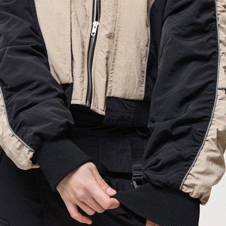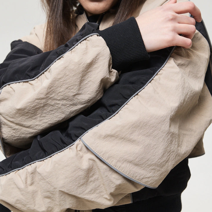 Tkanina główna — poliester odporny na zużycie, lekki i łatwy w pielęgnacji. Wypełnienie — syntetyczny puch o gramaturze 100, lekki materiał termoizolacyjny, który nie dodaje nadmiernej objętości, zapewniając komfort w chłodniejsze dni. Główny zamek — metalowy, japońskiej marki YKK, solidny i wygodny w użytkowaniu. Odblaskowe lamówki nadają bomberce wyrazisty akcent i zwiększają widoczność po zmroku.