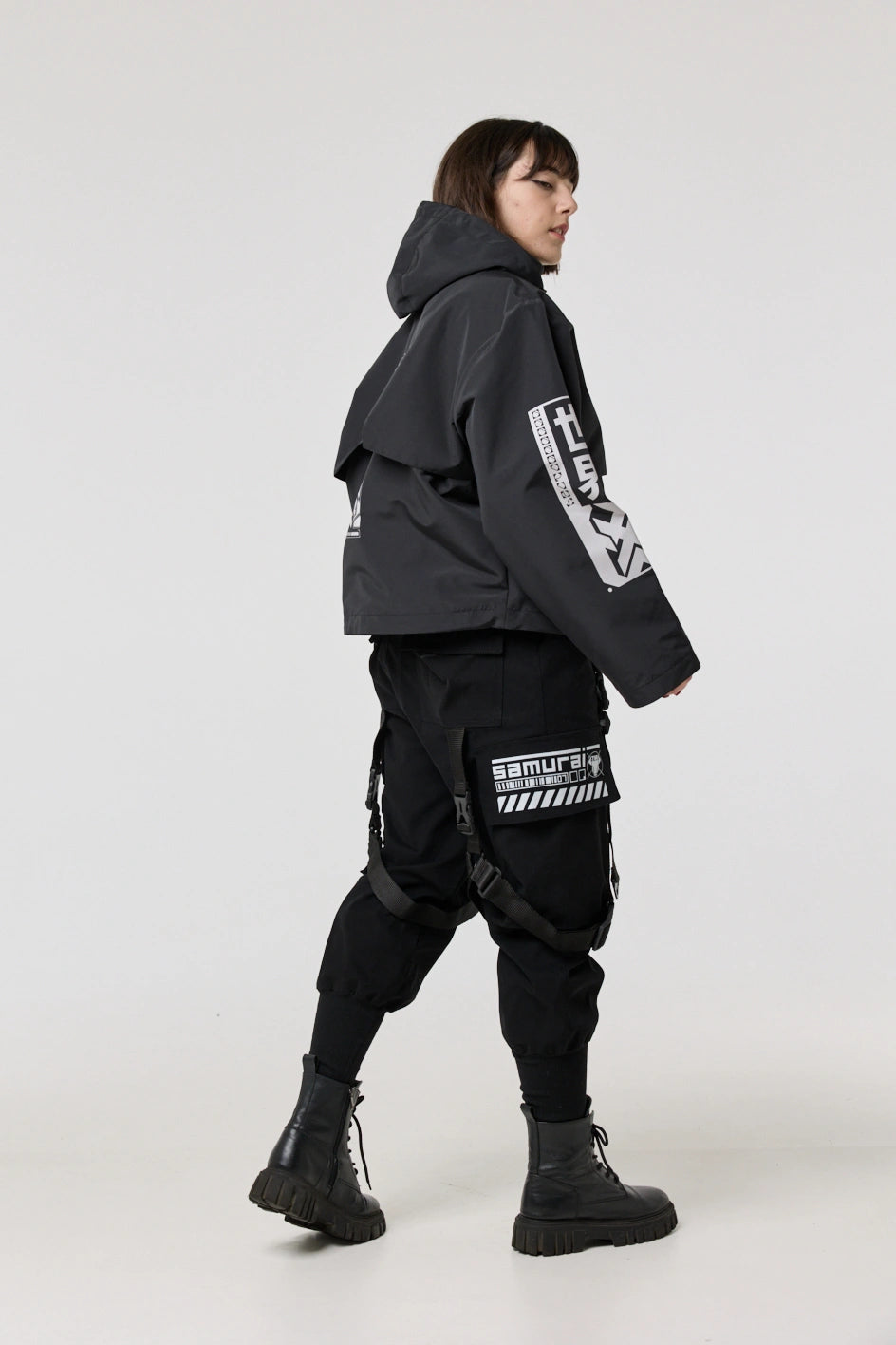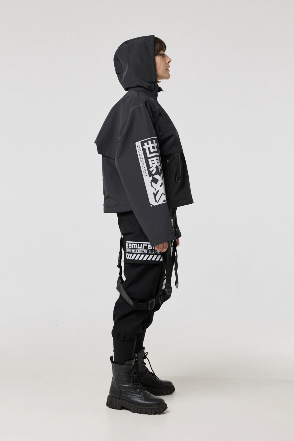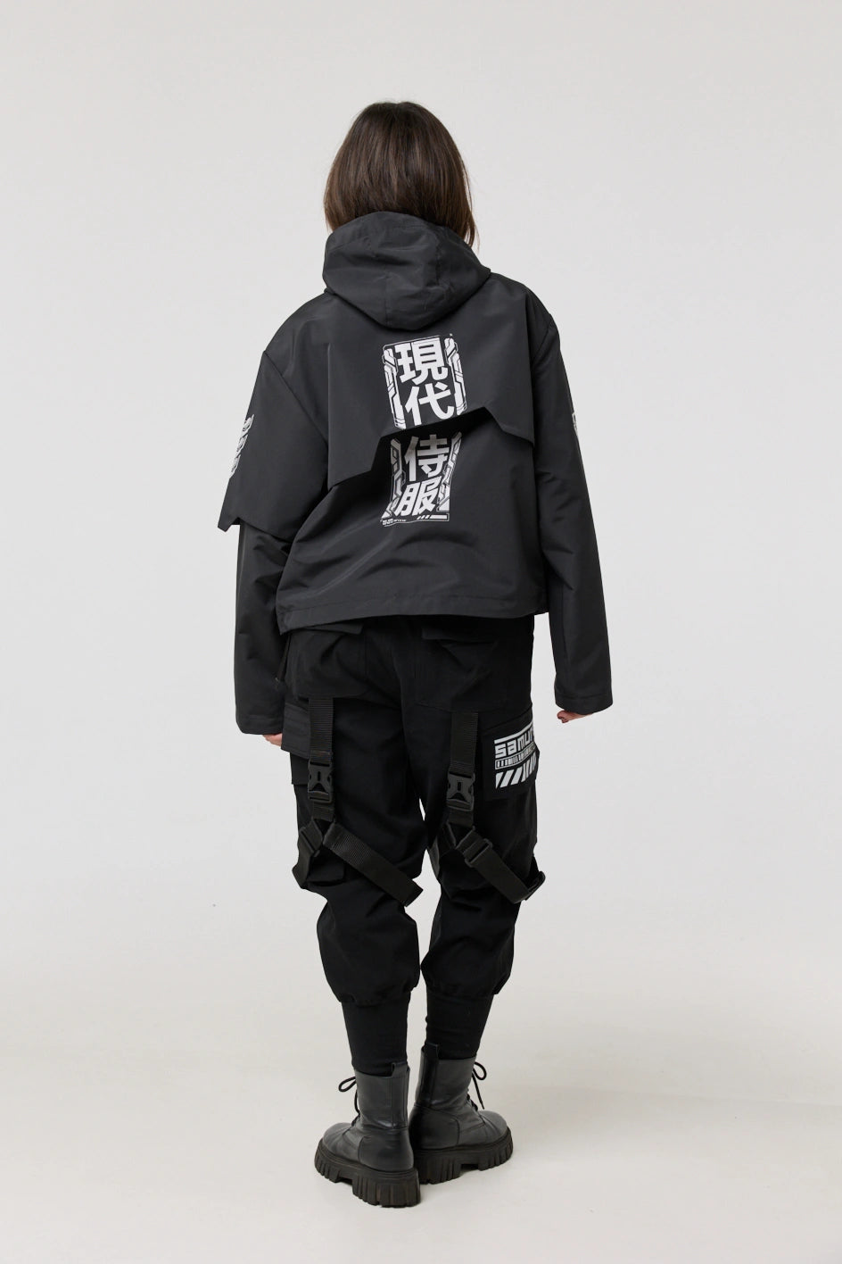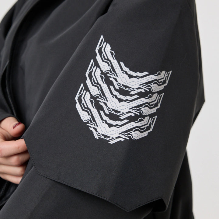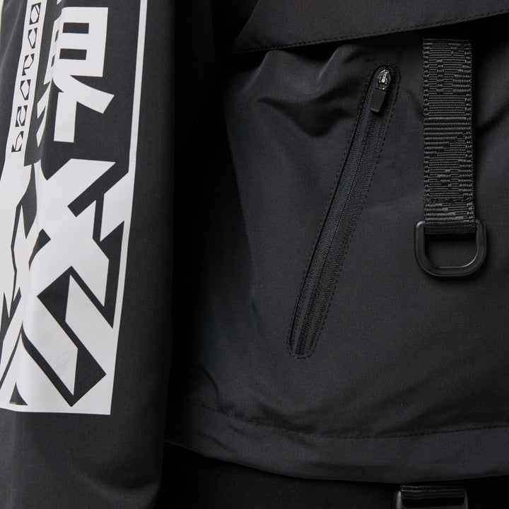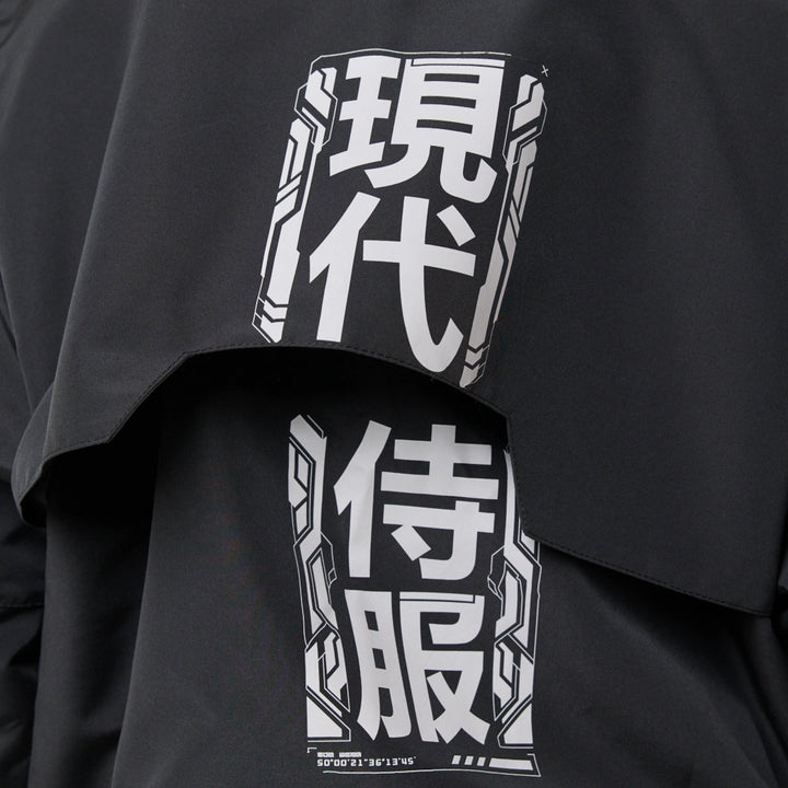 Model posiada wewnętrzną kieszeń na zamek oraz cztery zewnętrzne: dwie dolne kieszenie na zamki, kieszeń na piersi z klamrą i kieszeń na rękawie z klamrą. Na nakładce rękawa i na plecach — printy w stylu cyberpunk z napisem w hieroglifach: „Zbroja współczesnego samuraja”. Kaptur regulowany w pionie, dół produktu — za pomocą elastycznego sznura.