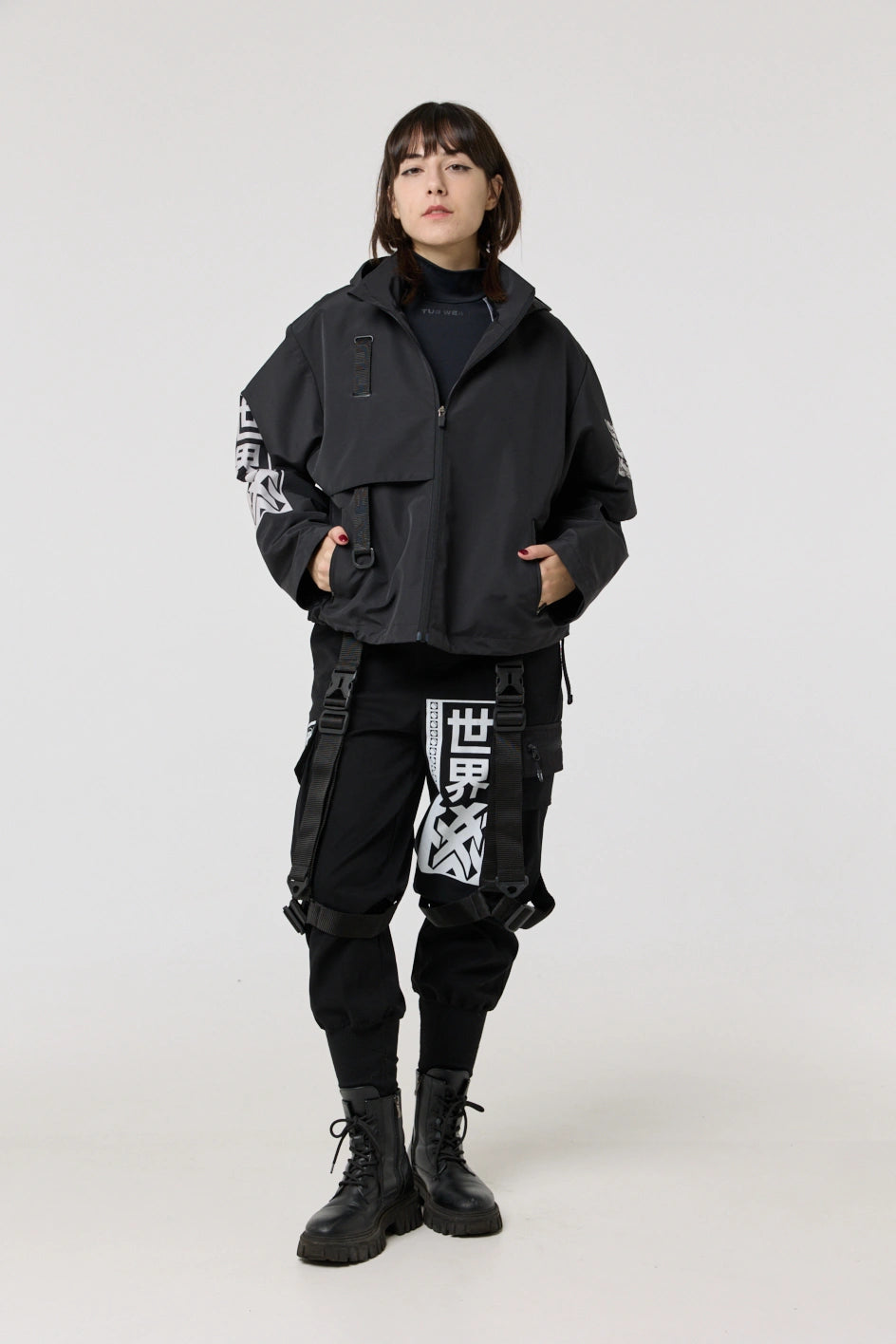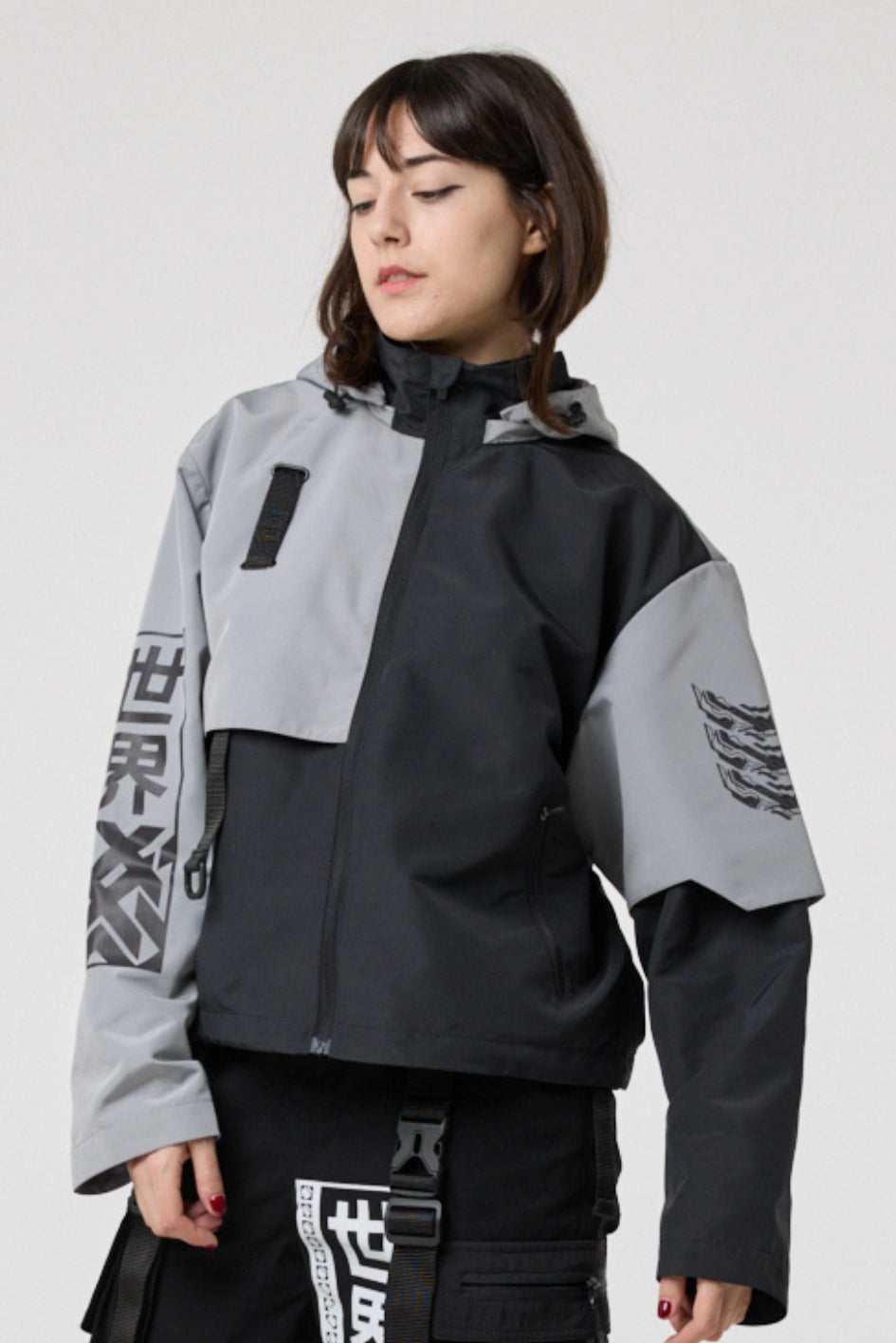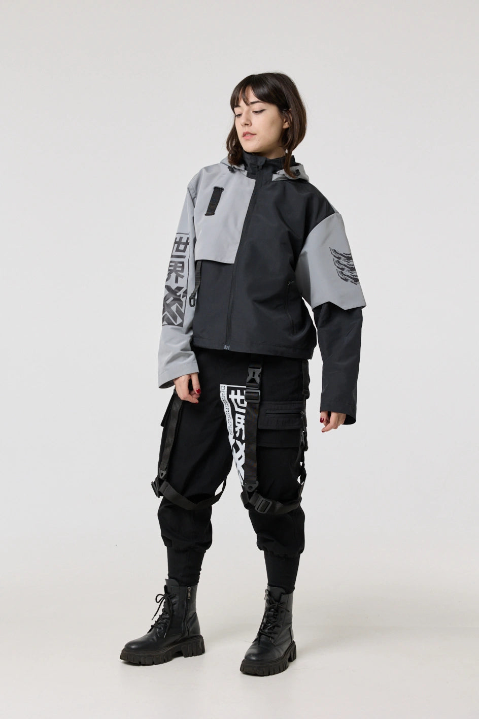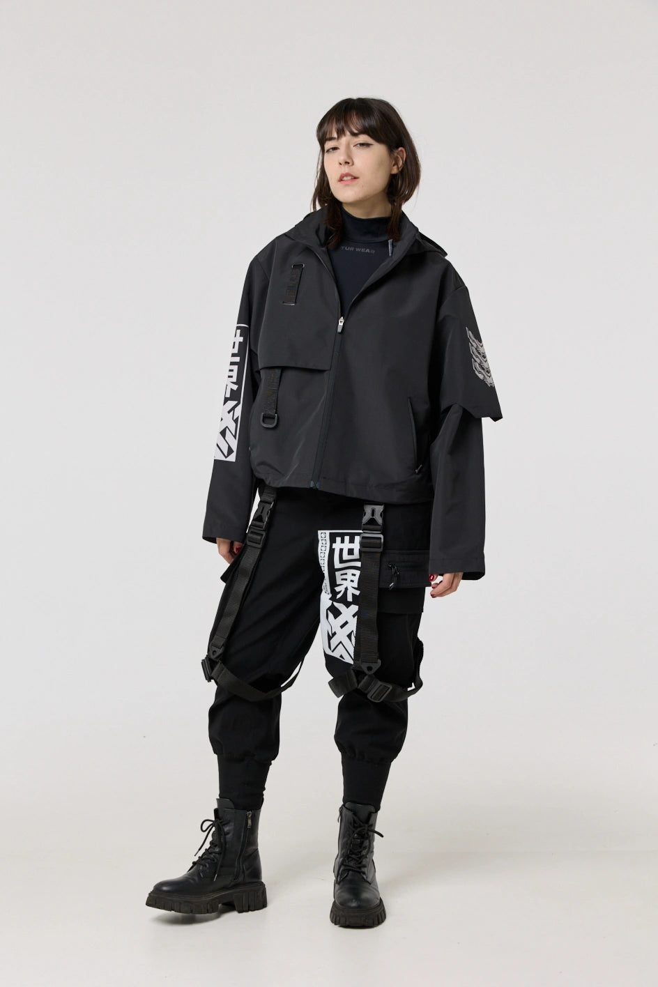 Model posiada wewnętrzną kieszeń na zamek oraz cztery zewnętrzne: dwie dolne kieszenie na zamki, kieszeń na piersi z klamrą i kieszeń na rękawie z klamrą. Na nakładce rękawa i na plecach — printy w stylu cyberpunk z napisem w hieroglifach: „Zbroja współczesnego samuraja”. Kaptur regulowany w pionie, dół produktu — za pomocą elastycznego sznura.