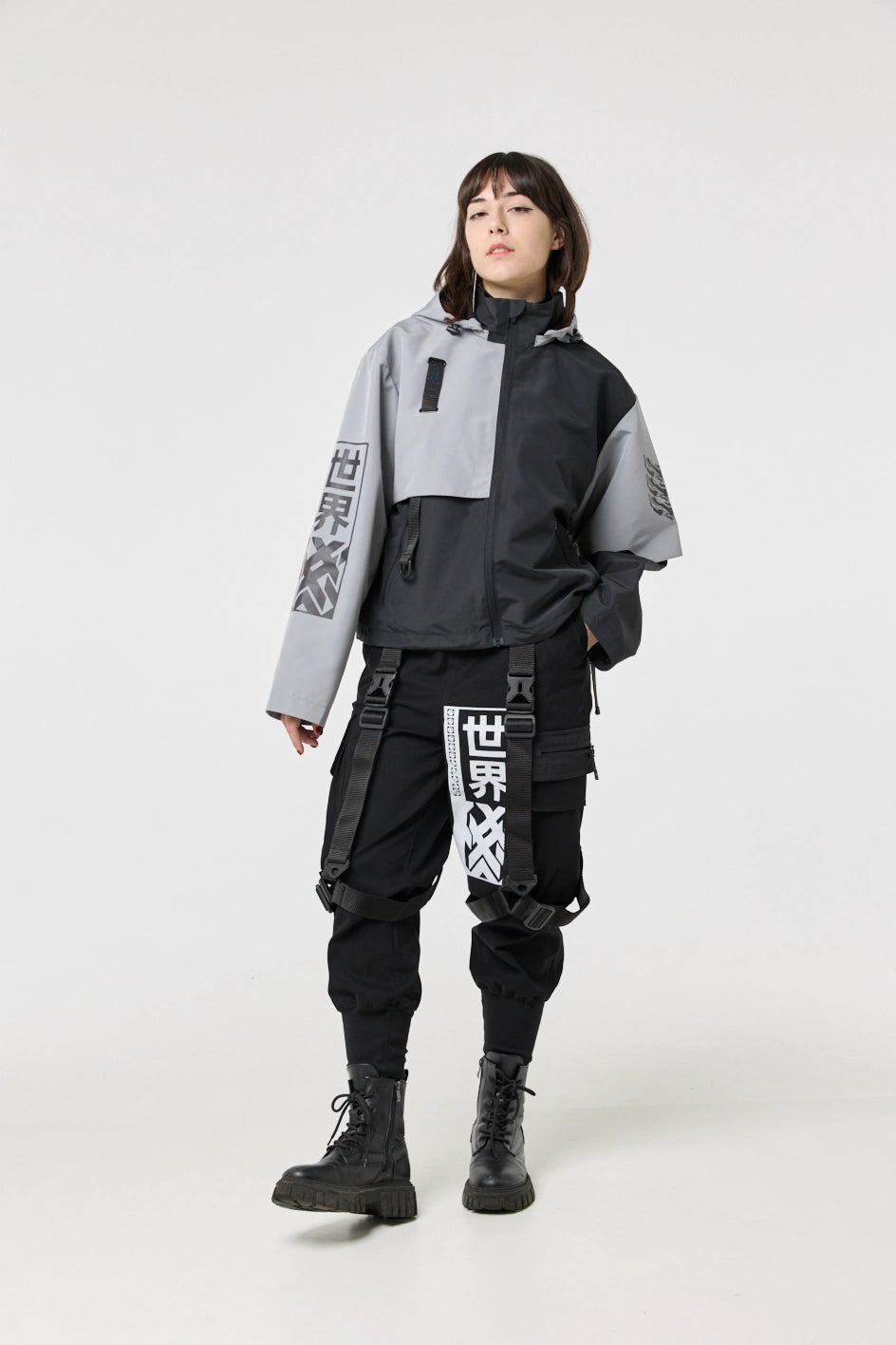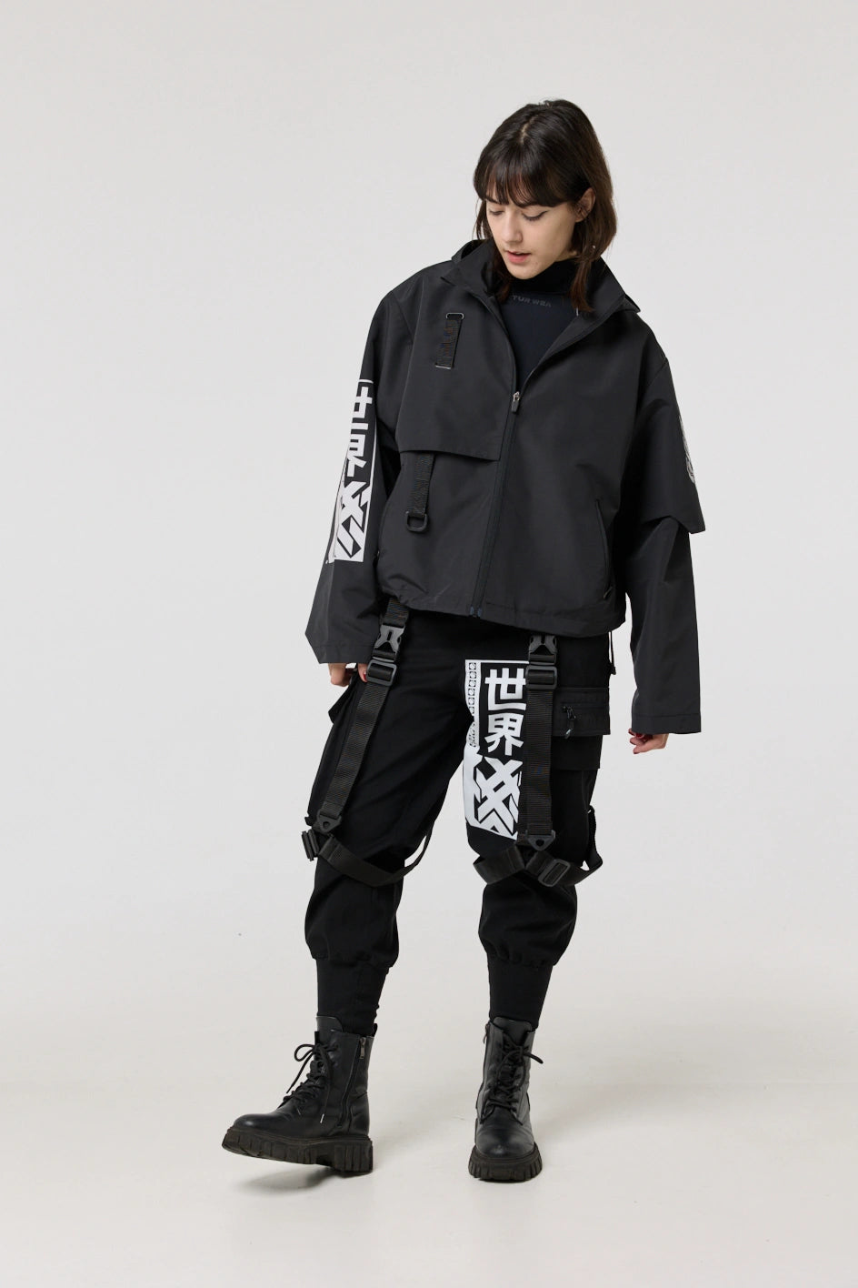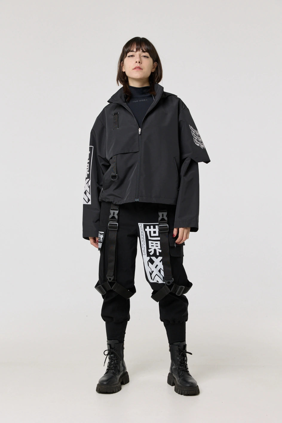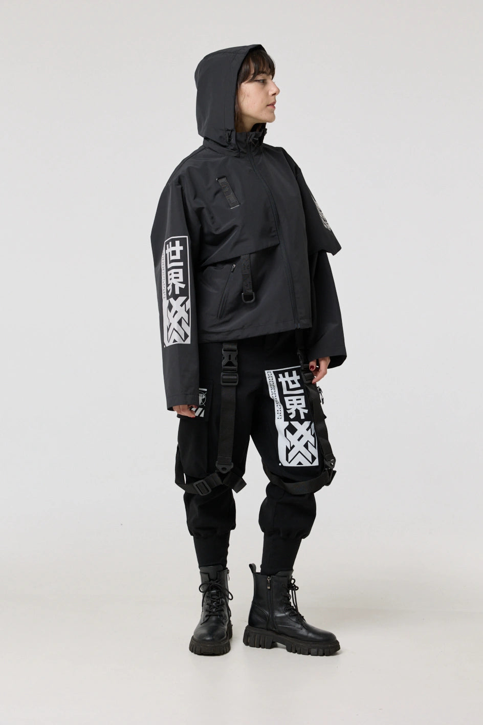 Model posiada wewnętrzną kieszeń na zamek oraz cztery zewnętrzne: dwie dolne kieszenie na zamki, kieszeń na piersi z klamrą i kieszeń na rękawie z klamrą. Na nakładce rękawa i na plecach — printy w stylu cyberpunk z napisem w hieroglifach: „Zbroja współczesnego samuraja”. Kaptur regulowany w pionie, dół produktu — za pomocą elastycznego sznura.