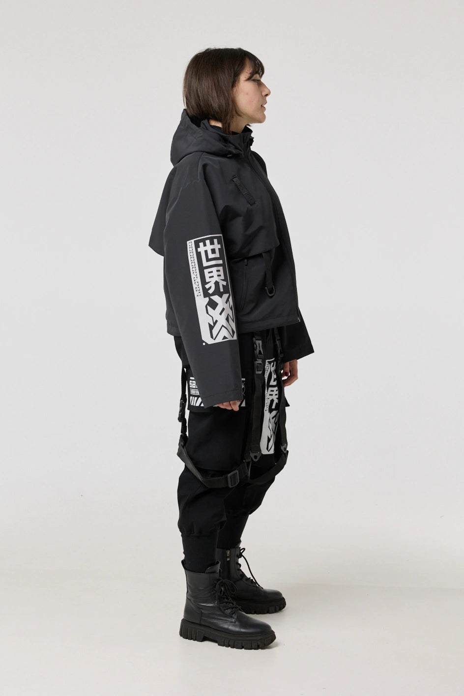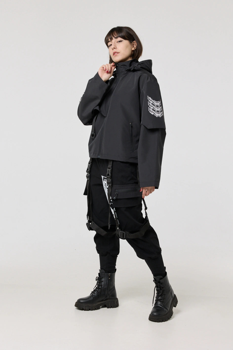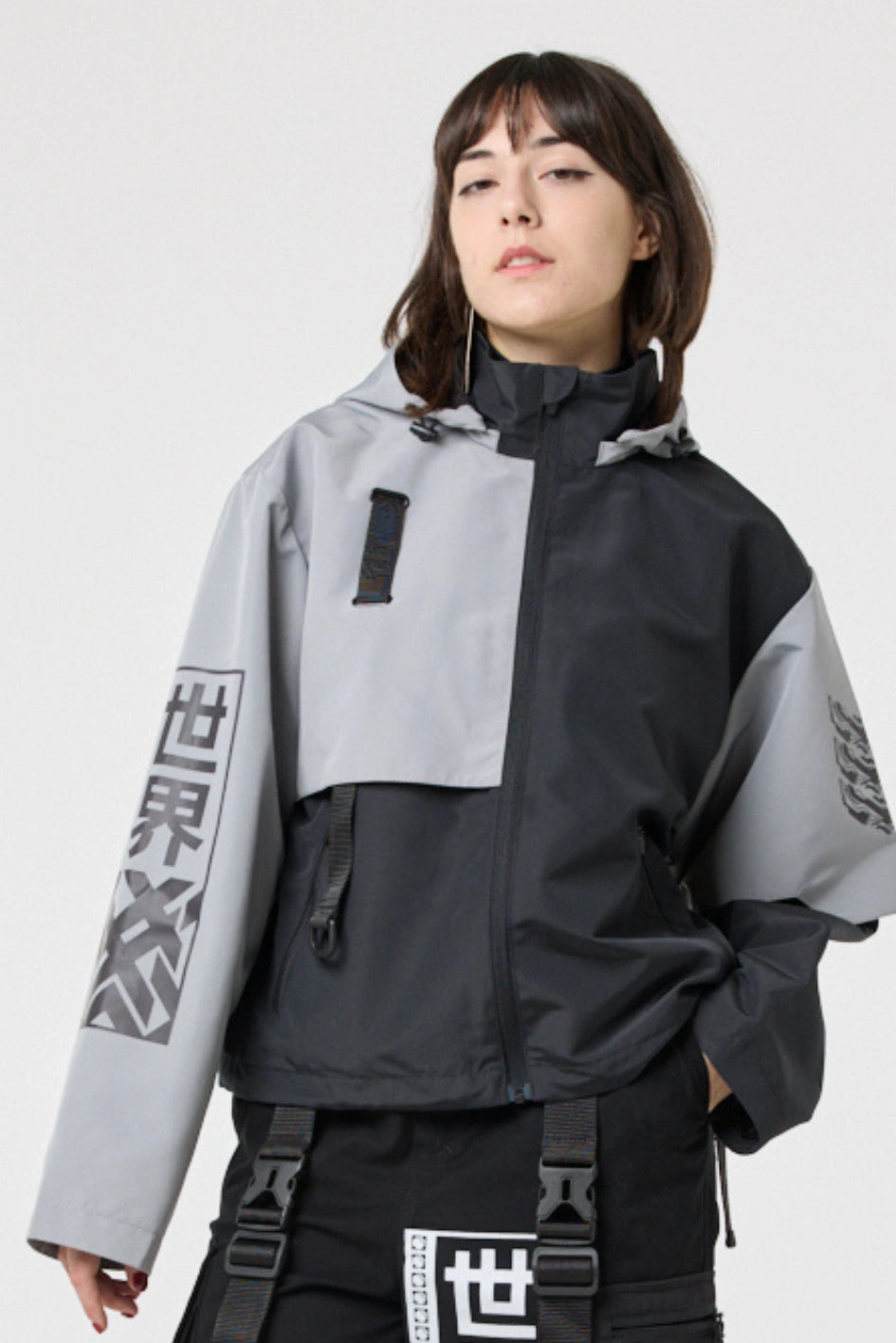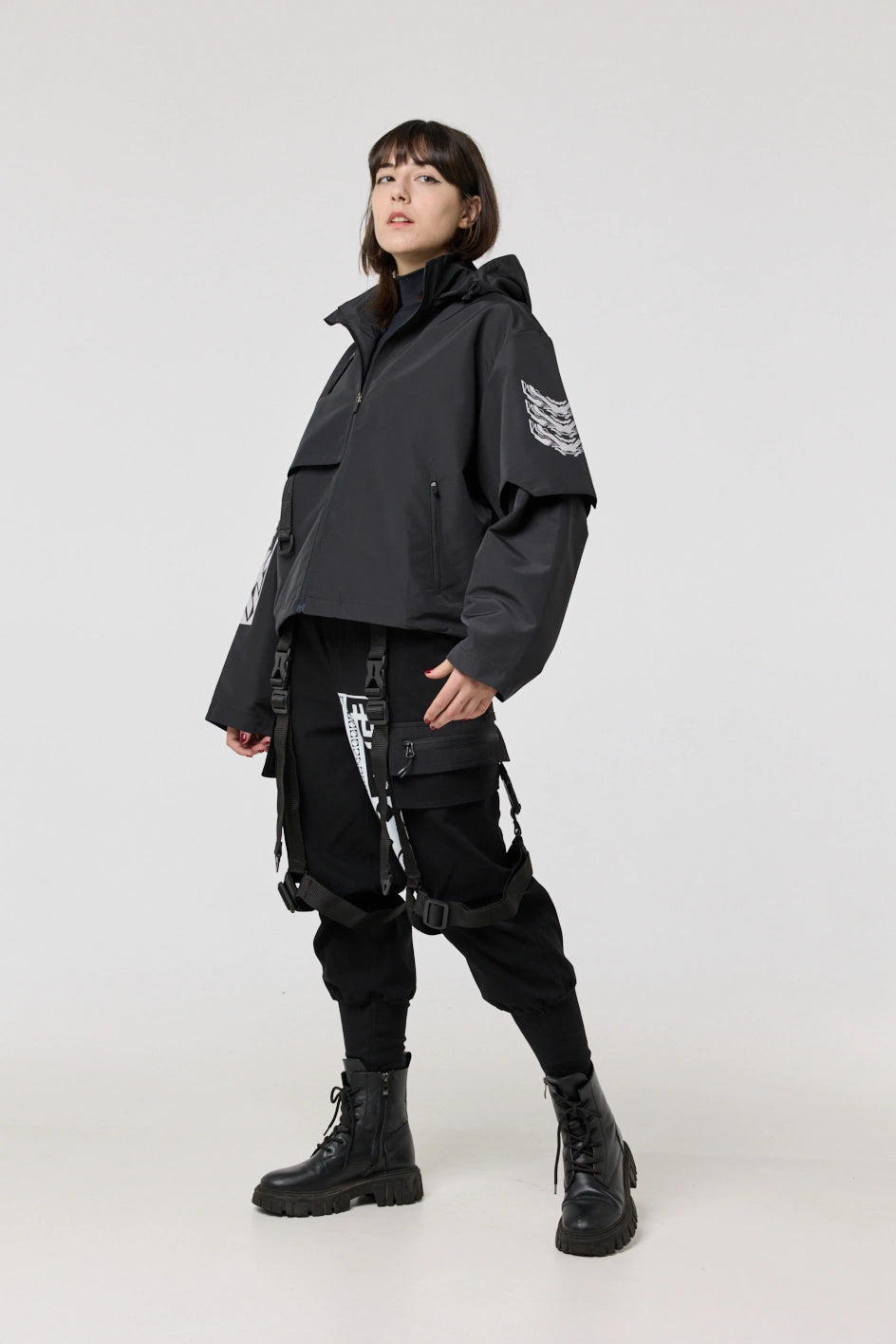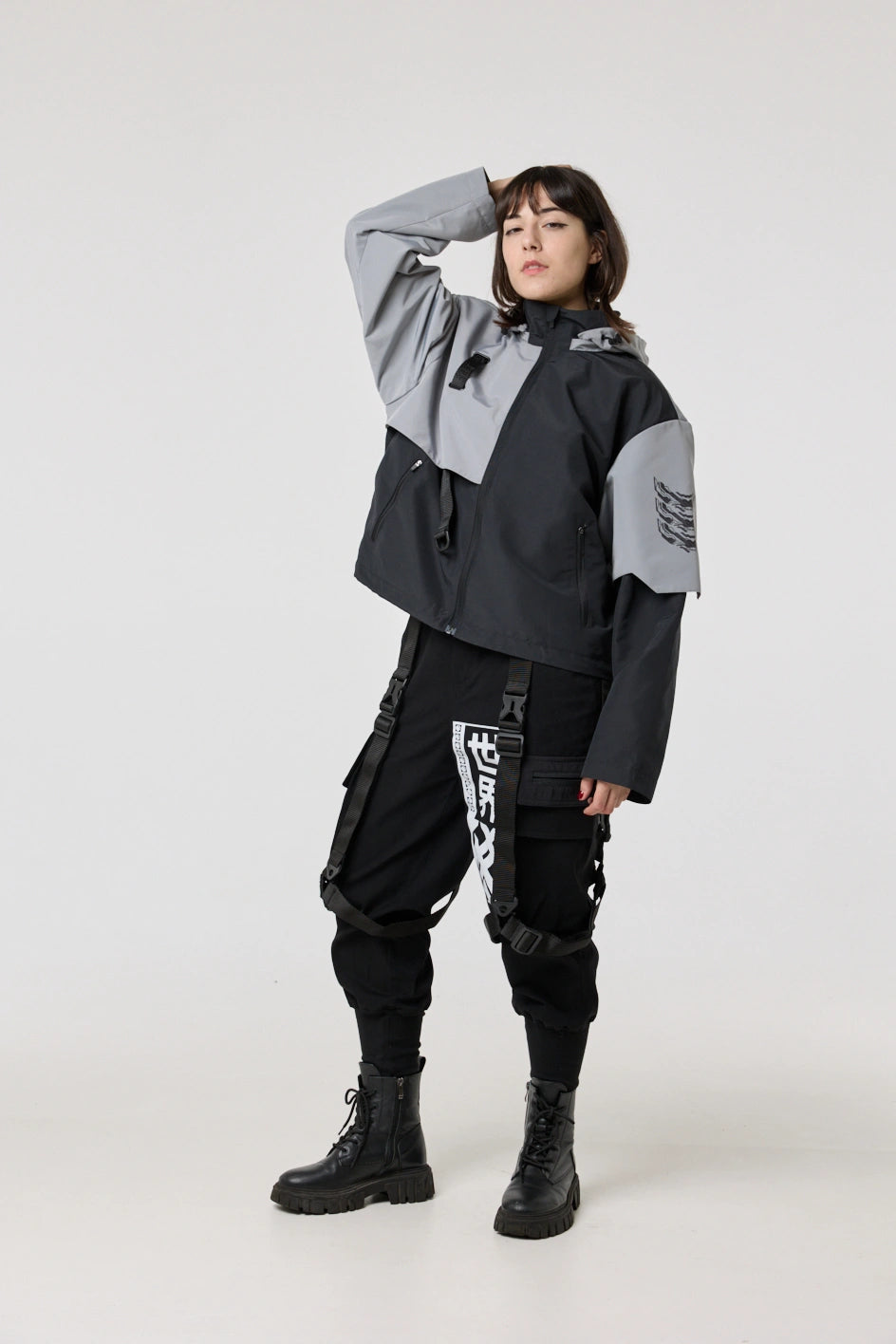 Model posiada wewnętrzną kieszeń na zamek oraz cztery zewnętrzne: dwie dolne kieszenie na zamki, kieszeń na piersi z klamrą i kieszeń na rękawie z klamrą. Na nakładce rękawa i na plecach — printy w stylu cyberpunk z napisem w hieroglifach: „Zbroja współczesnego samuraja”. Kaptur regulowany w pionie, dół produktu — za pomocą elastycznego sznura.