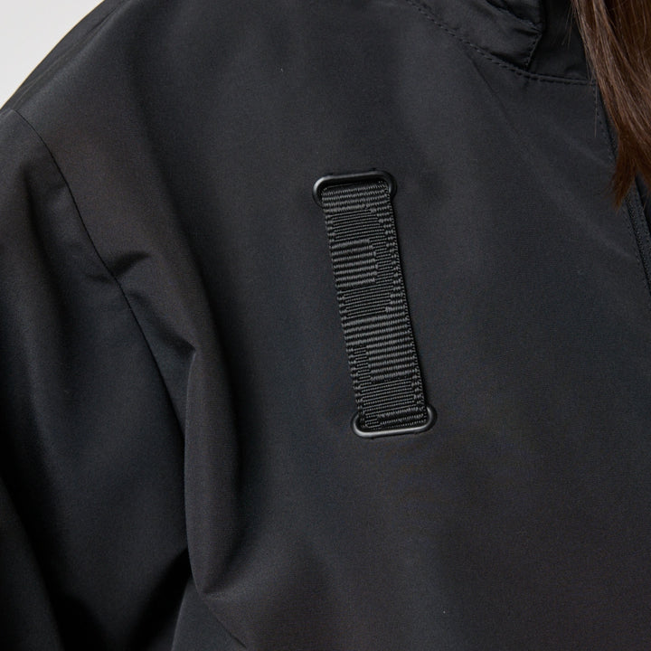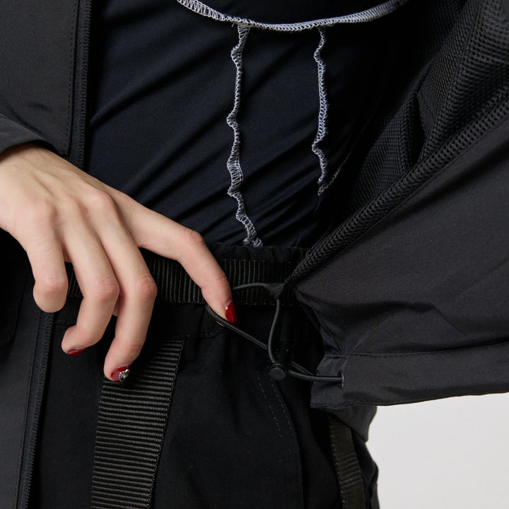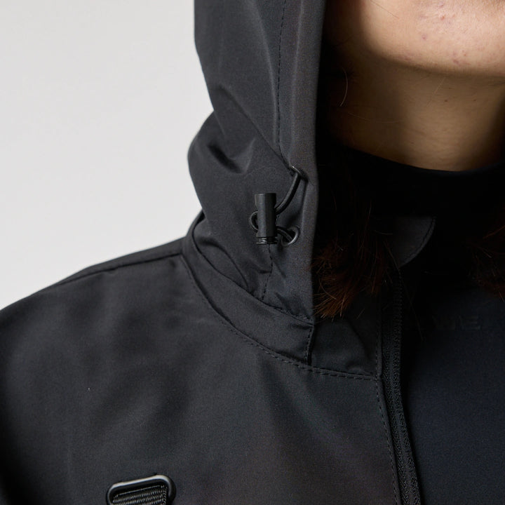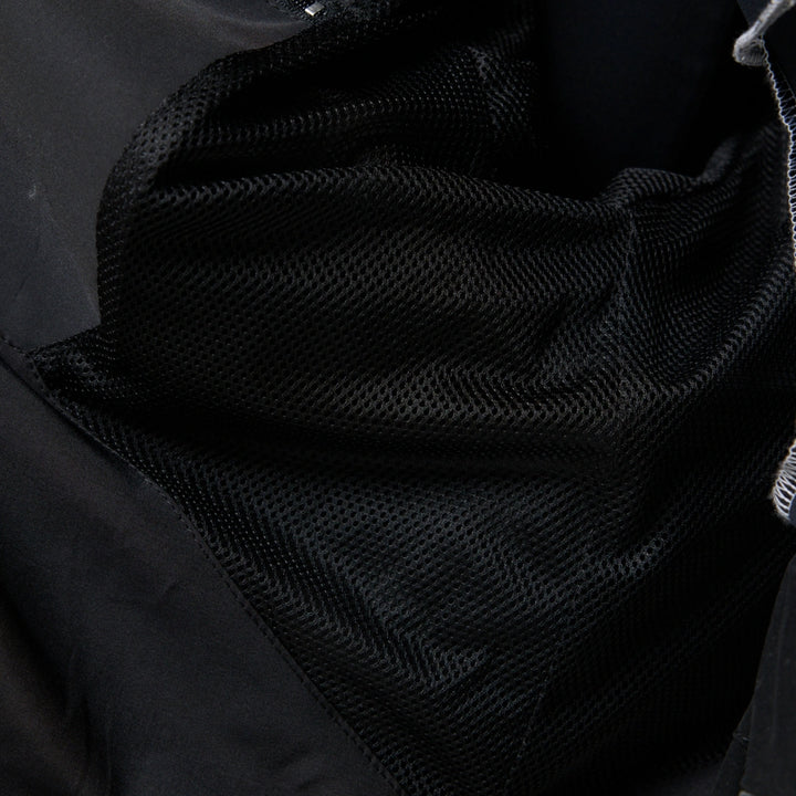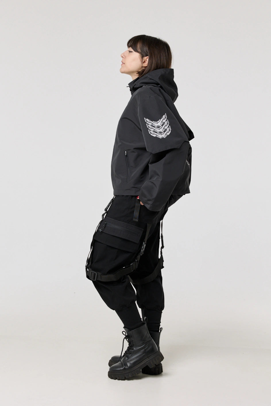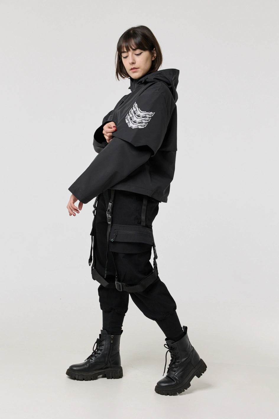 Model posiada wewnętrzną kieszeń na zamek oraz cztery zewnętrzne: dwie dolne kieszenie na zamki, kieszeń na piersi z klamrą i kieszeń na rękawie z klamrą. Na nakładce rękawa i na plecach — printy w stylu cyberpunk z napisem w hieroglifach: „Zbroja współczesnego samuraja”. Kaptur regulowany w pionie, dół produktu — za pomocą elastycznego sznura.