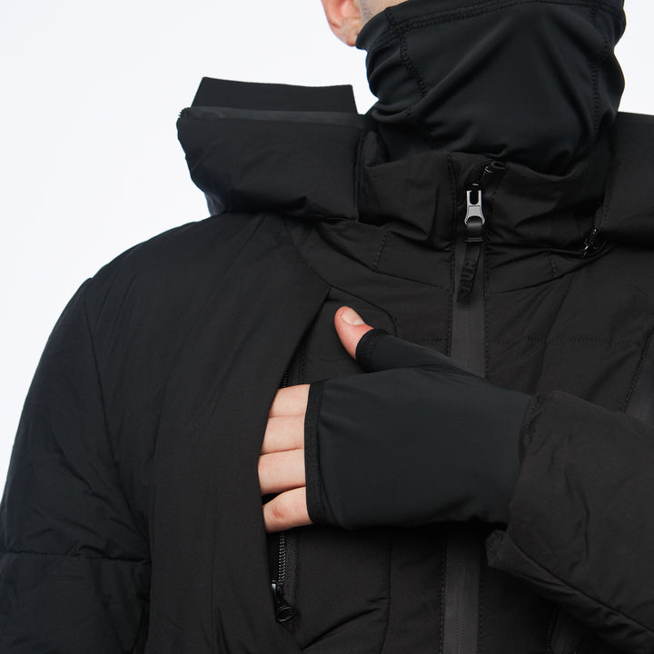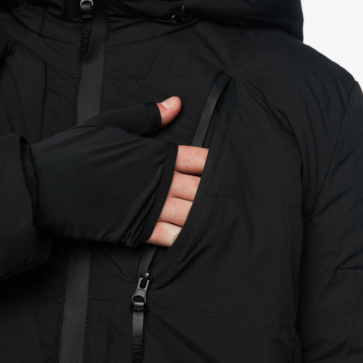 Kurtka o prostym kroju, średniej długości. Odczepiany kaptur z regulacją. Dwie kieszenie na przodzie: jedna zamykana na skośny wodoodporny zamek, druga pod klapą. Po bokach dwie kieszenie z ukrytymi zamkami. Wewnątrz jedna kieszeń. Na wewnętrznej stronie podszewka. Dół kurtki wykończony gumką i zapięciami.