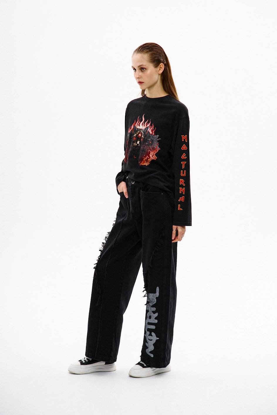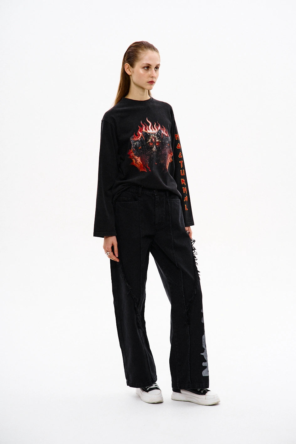 Longsleeve o klasycznym kroju z oryginalnymi akcentami w detalach. W dolnej części przodu znajduje się imitacja dekoltu, tworząca nietypowy efekt wizualny. Tył posiada odwrócony nadruk, przód — nadruk w standardowej orientacji, a na rękawie umieszczony jest pionowy nadruk. W dolnej części pleców znajdują się reliefowe przeszycia bez stebnowania, imitujące odwrócone wycięcie na rękaw. Dolne krawędzie rękawów są podwinięte, a oblamówka wykonana z głównej tkaniny z surowym brzegiem — dla techniczno-surowego efektu estetycznego.