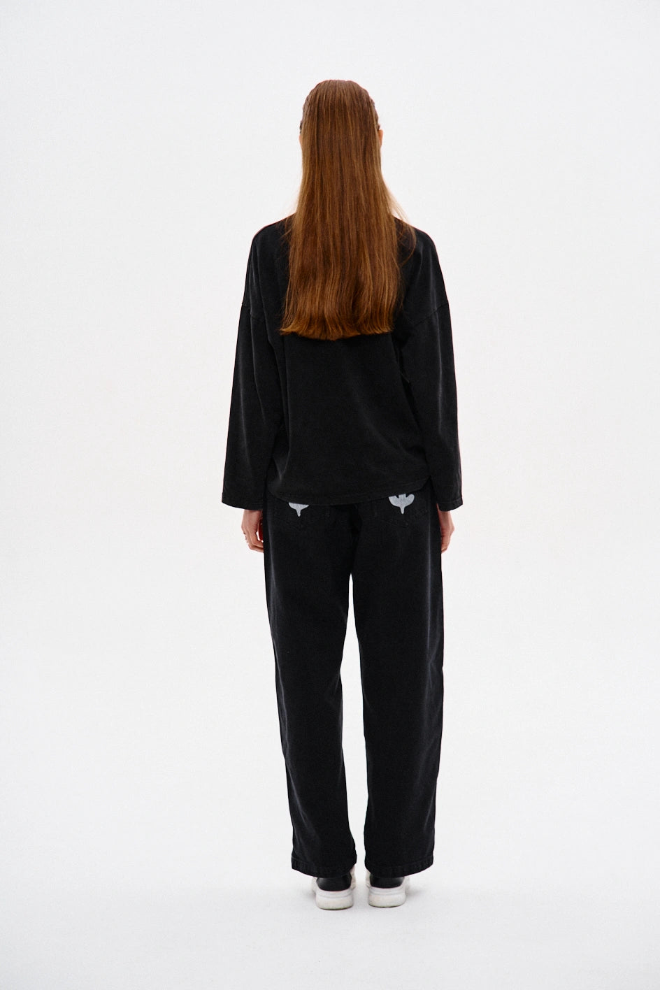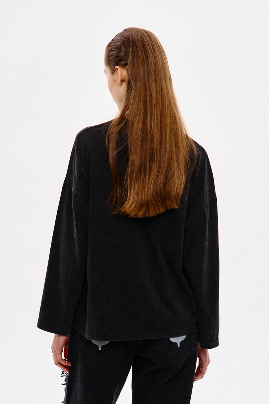 Oversize’owy longsleeve z efektem sprania — dla tych, którzy cenią unikalność w detalach. Obniżone ramiona i dekolt wykończony ribbaną zapewniają komfort i trwałość. Autorski nadruk uzupełnia koncepcję modelu, nadając każdej stylizacji wyrazistości. Idealnie komponuje się z jeansami „Spite”, tworząc stylowy i wyrazisty zestaw.