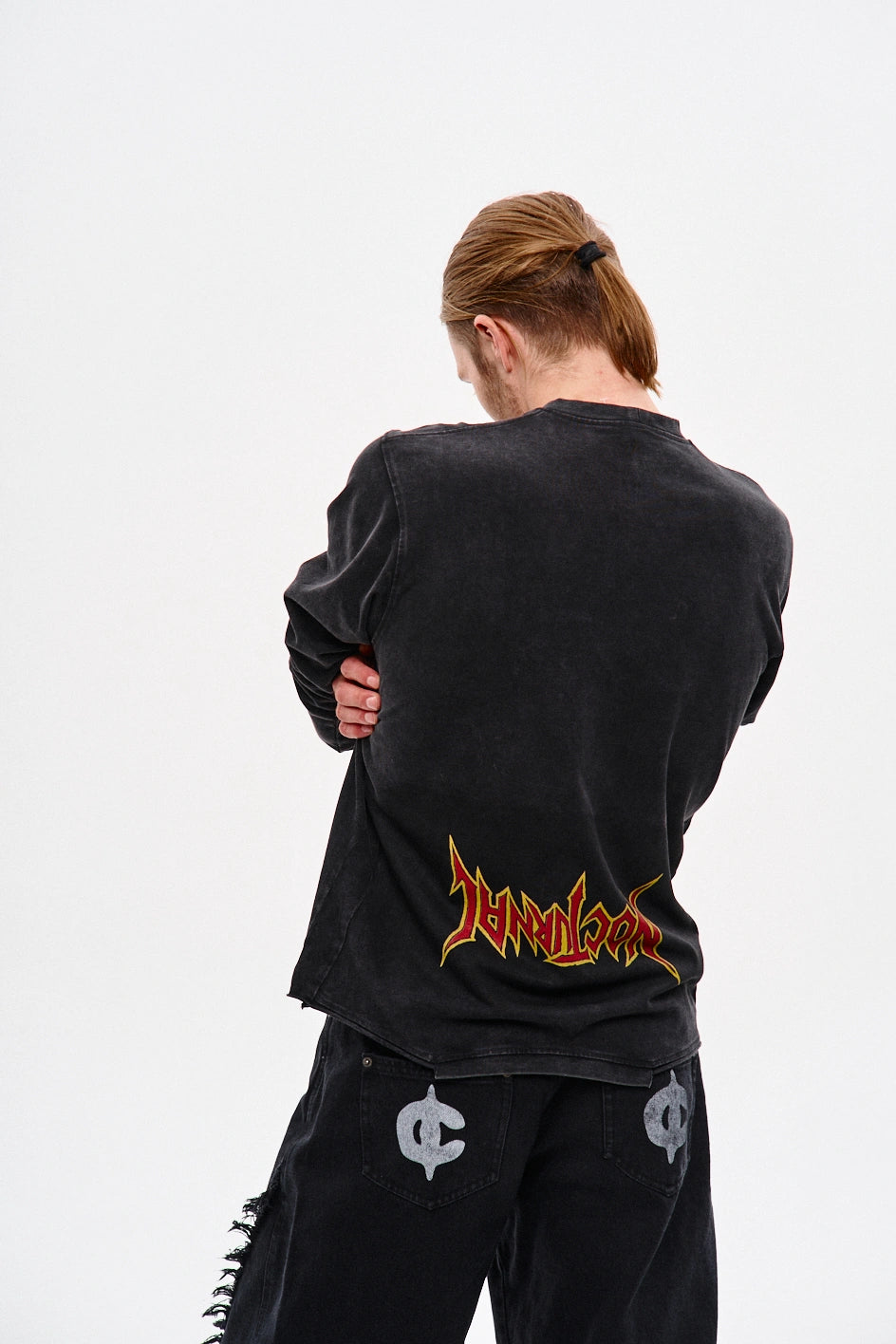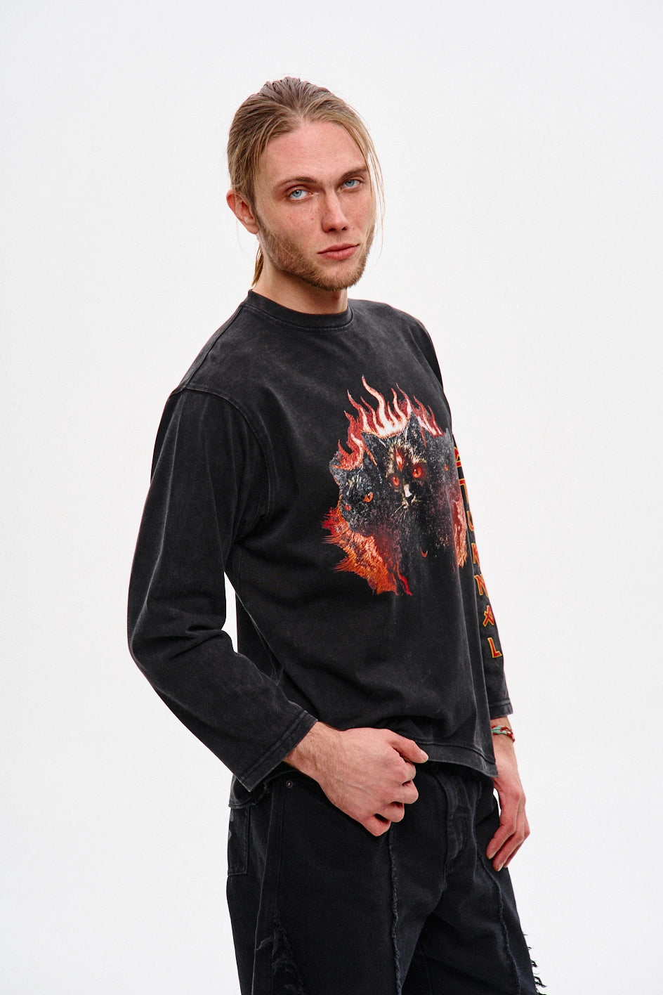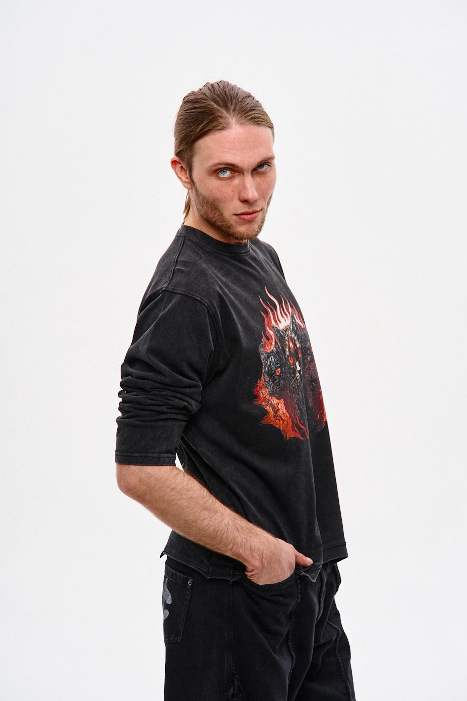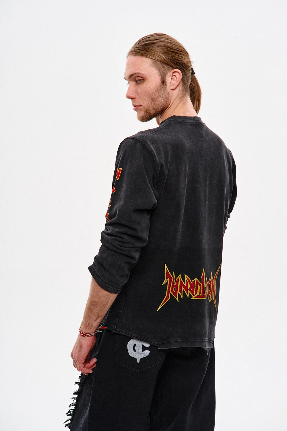 Longsleeve o klasycznym kroju z oryginalnymi akcentami w detalach. W dolnej części przodu znajduje się imitacja dekoltu, tworząca nietypowy efekt wizualny. Tył posiada odwrócony nadruk, przód — nadruk w standardowej orientacji, a na rękawie umieszczony jest pionowy nadruk. W dolnej części pleców znajdują się reliefowe przeszycia bez stebnowania, imitujące odwrócone wycięcie na rękaw. Dolne krawędzie rękawów są podwinięte, a oblamówka wykonana z głównej tkaniny z surowym brzegiem — dla techniczno-surowego efektu estetycznego.