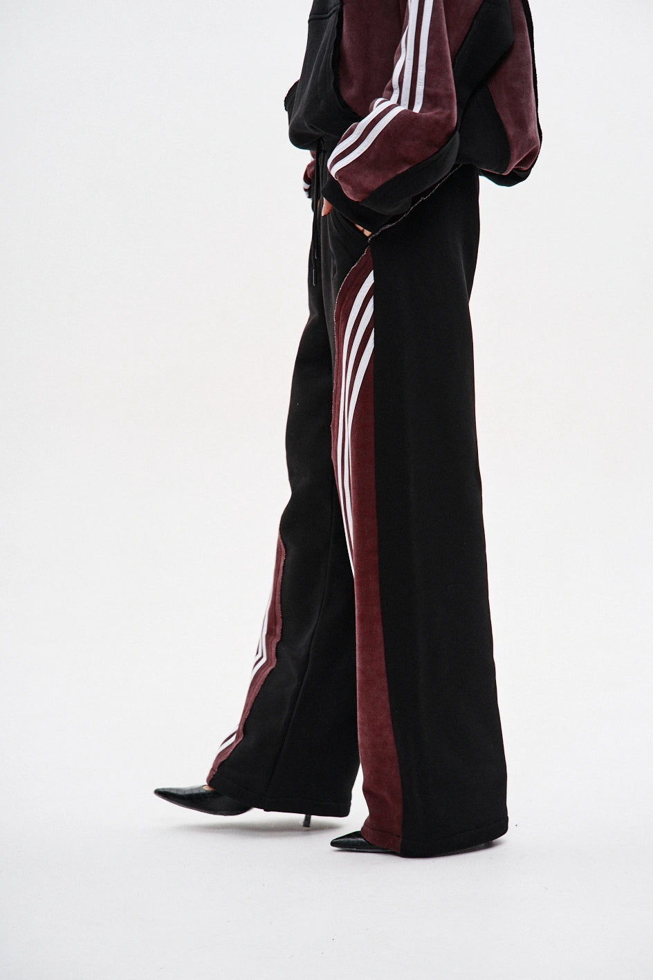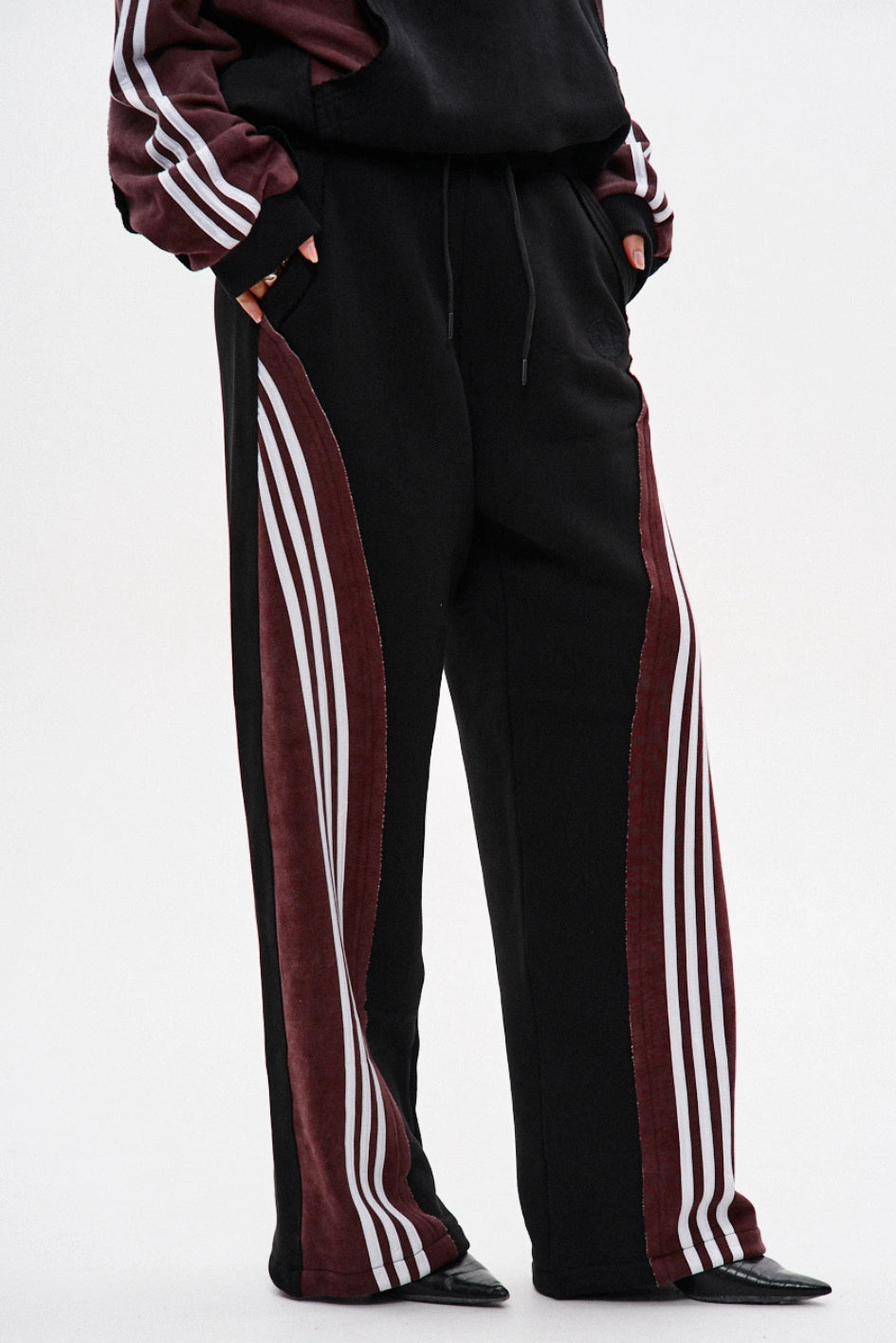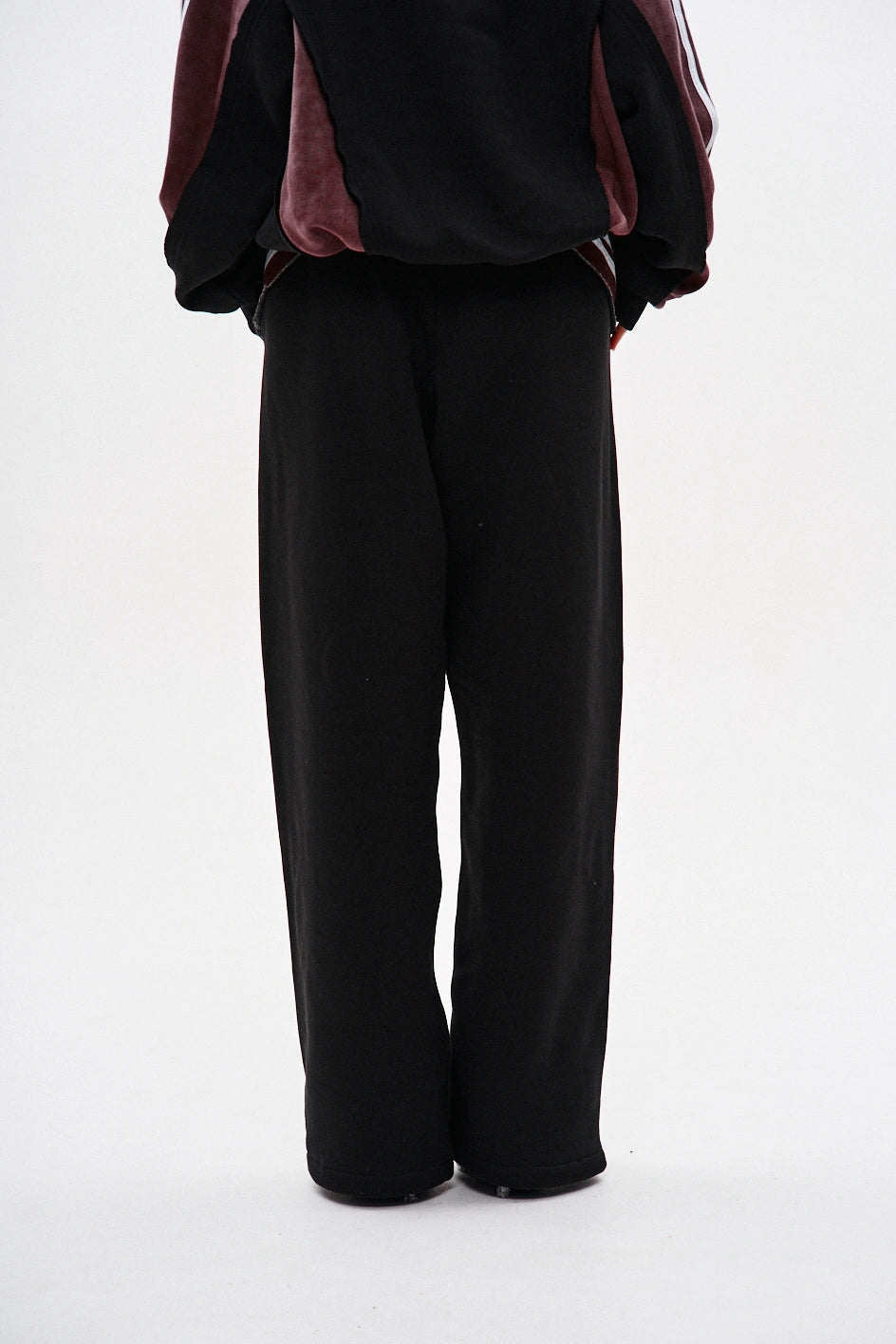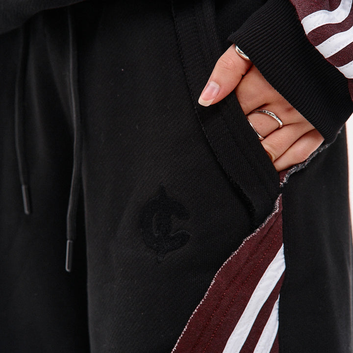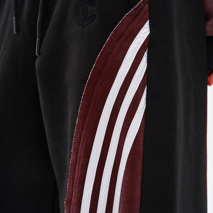 Spodnie dresowe o prostym kroju, wykonane z połączenia dwóch kolorów materiału: główna część czarna, a karczek z tyłu — bordowy, z surowymi krawędziami. Na bordowych elementach znajdują się po trzy białe lampasy z każdej strony. Aby uzyskać efekt vintage, zastosowano technologię prania przemysłowego. Spodnie posiadają dwie kieszenie z przodu, pas na gumce ze sznurkiem oraz ściągacz na elastyczny sznurek w dolnej części nogawek. Po lewej stronie umieszczony jest firmowy haft w czarnym kolorze.