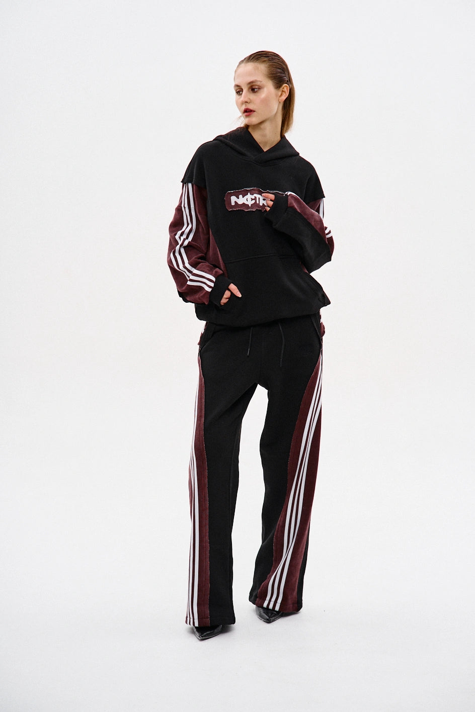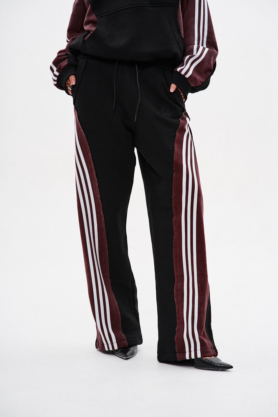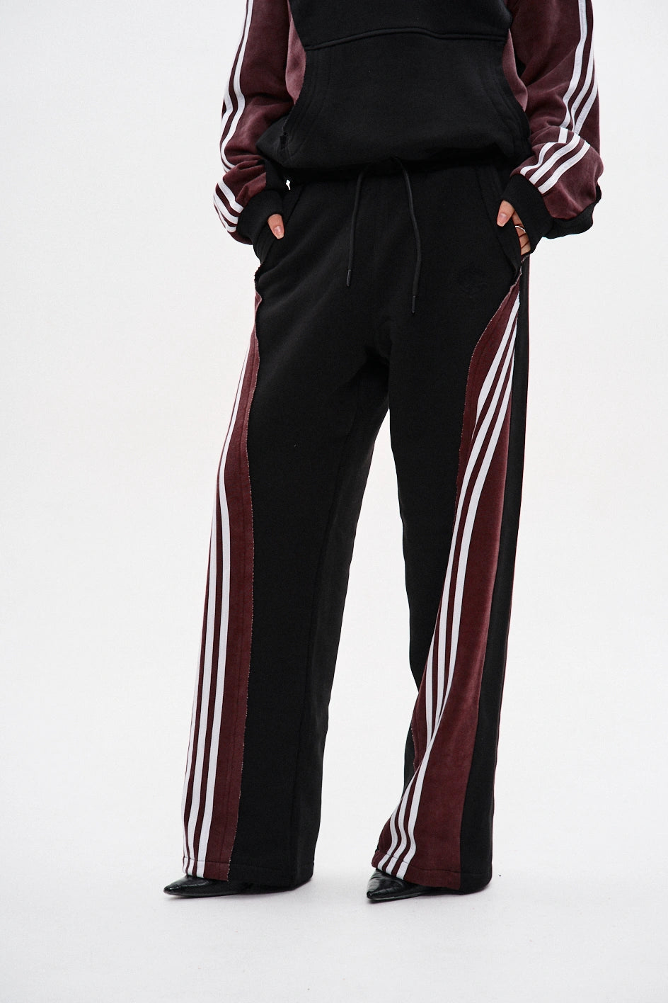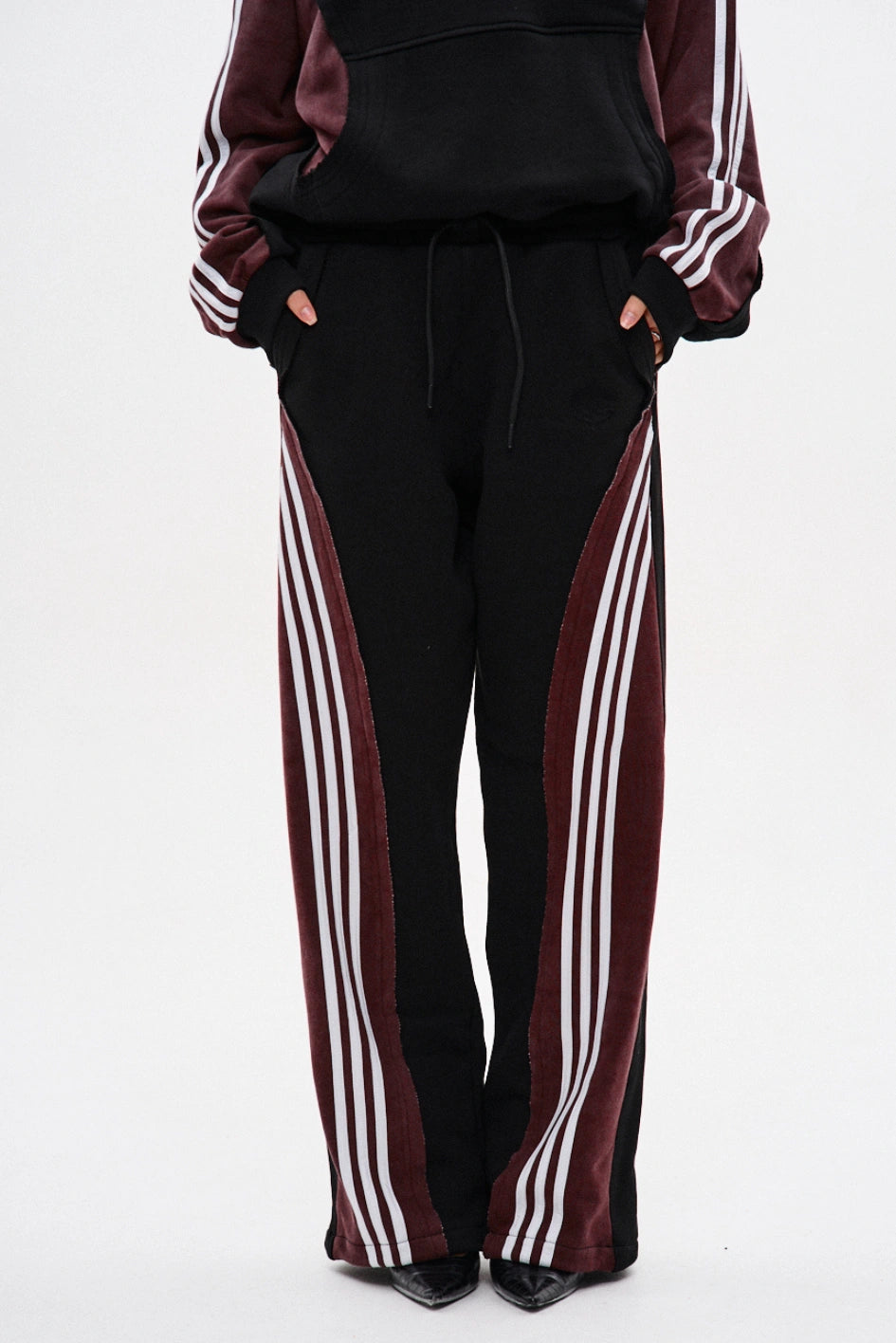 Spodnie dresowe o prostym kroju, wykonane z połączenia dwóch kolorów materiału: główna część czarna, a karczek z tyłu — bordowy, z surowymi krawędziami. Na bordowych elementach znajdują się po trzy białe lampasy z każdej strony. Aby uzyskać efekt vintage, zastosowano technologię prania przemysłowego. Spodnie posiadają dwie kieszenie z przodu, pas na gumce ze sznurkiem oraz ściągacz na elastyczny sznurek w dolnej części nogawek. Po lewej stronie umieszczony jest firmowy haft w czarnym kolorze.
