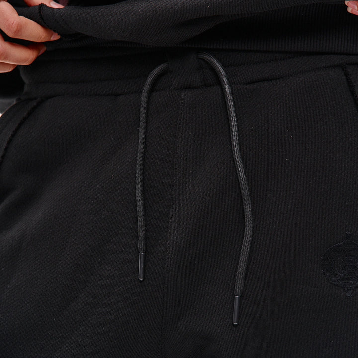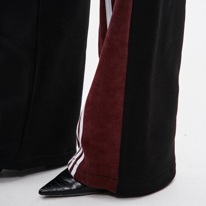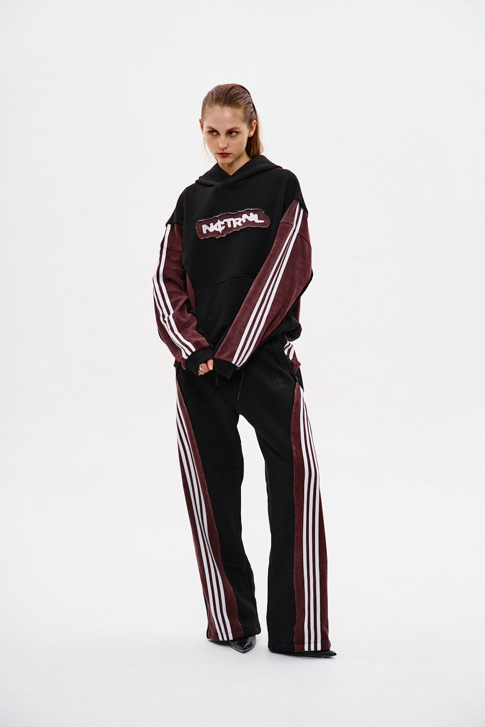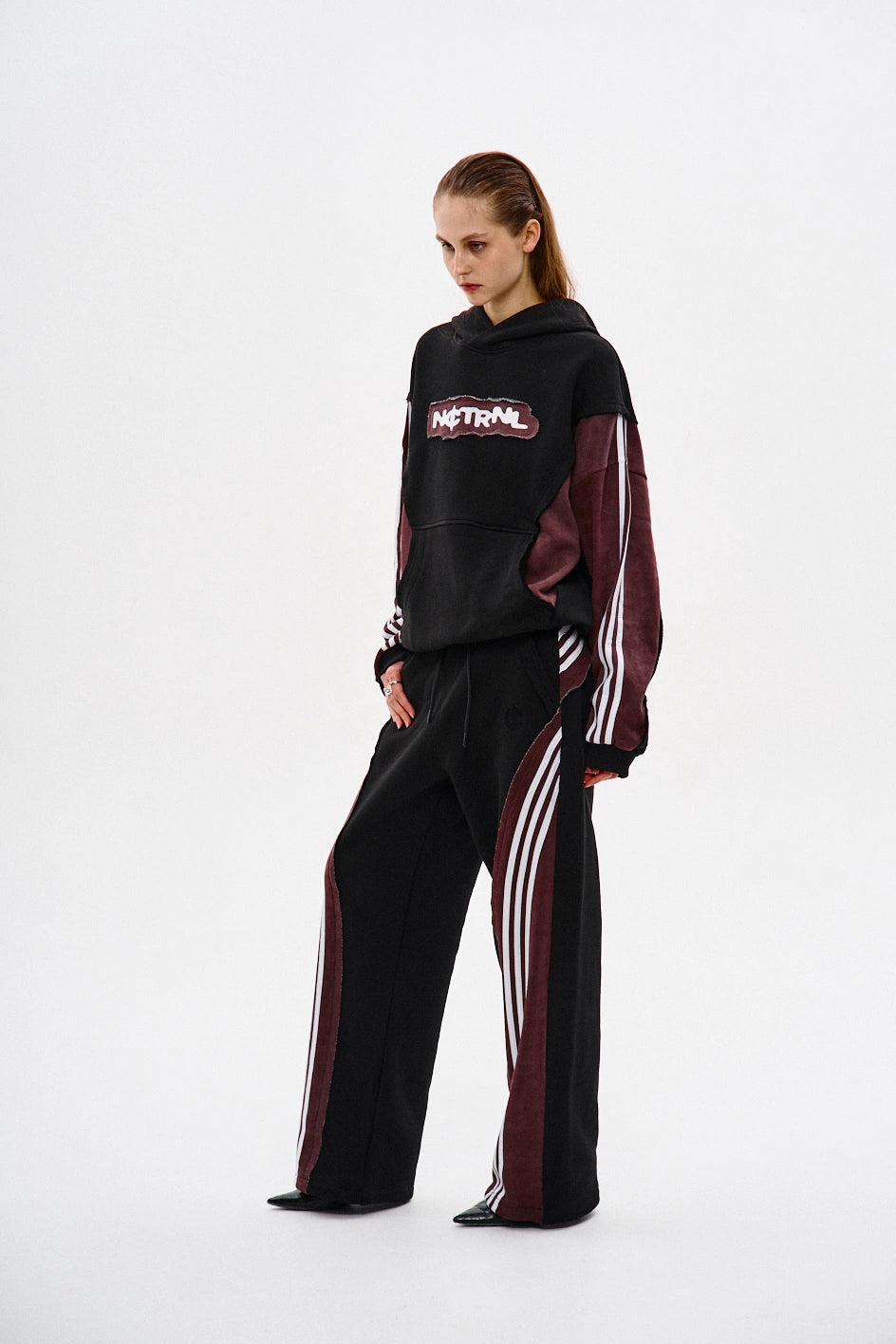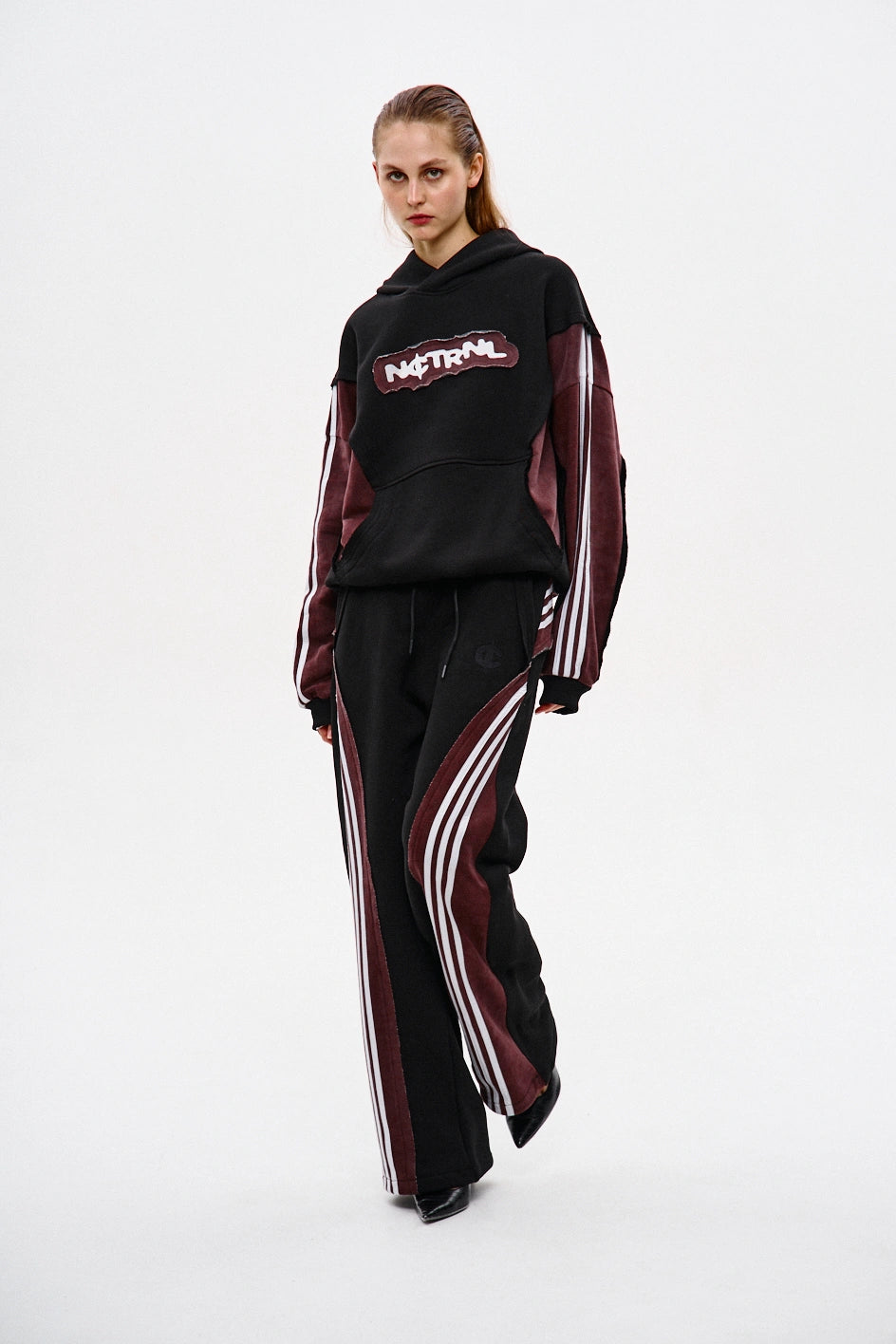 Spodnie dresowe o prostym kroju, wykonane z połączenia dwóch kolorów materiału: główna część czarna, a karczek z tyłu — bordowy, z surowymi krawędziami. Na bordowych elementach znajdują się po trzy białe lampasy z każdej strony. Aby uzyskać efekt vintage, zastosowano technologię prania przemysłowego. Spodnie posiadają dwie kieszenie z przodu, pas na gumce ze sznurkiem oraz ściągacz na elastyczny sznurek w dolnej części nogawek. Po lewej stronie umieszczony jest firmowy haft w czarnym kolorze.