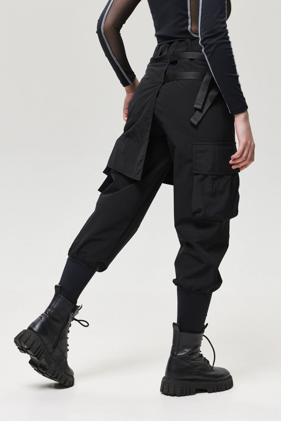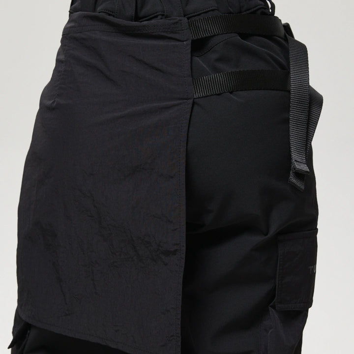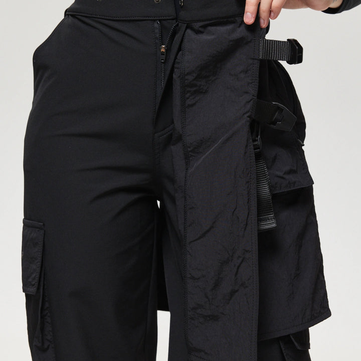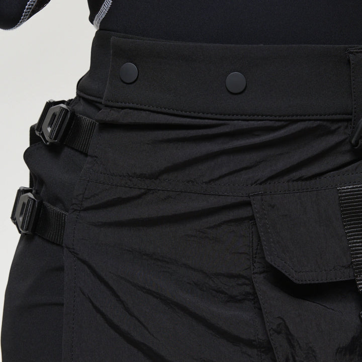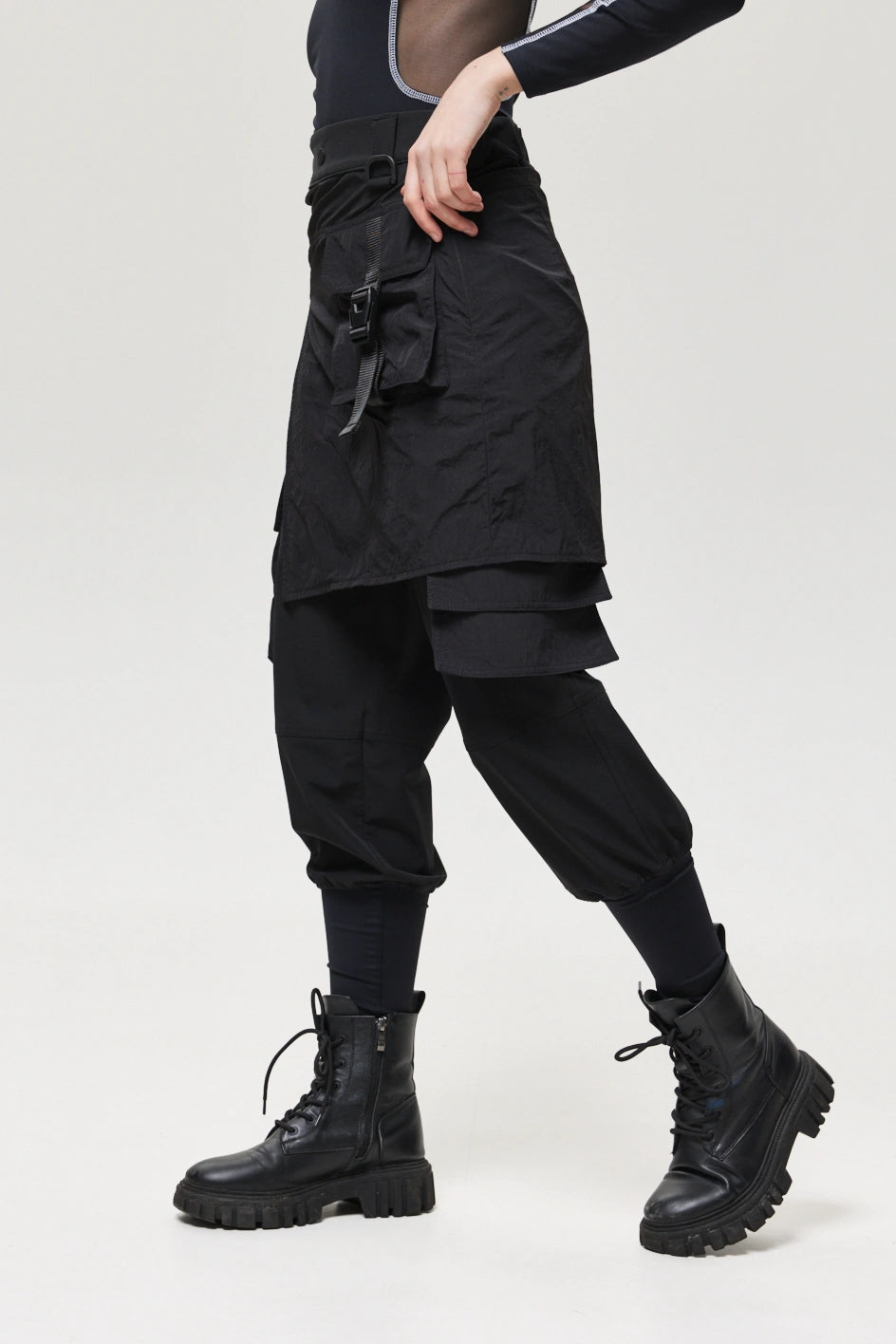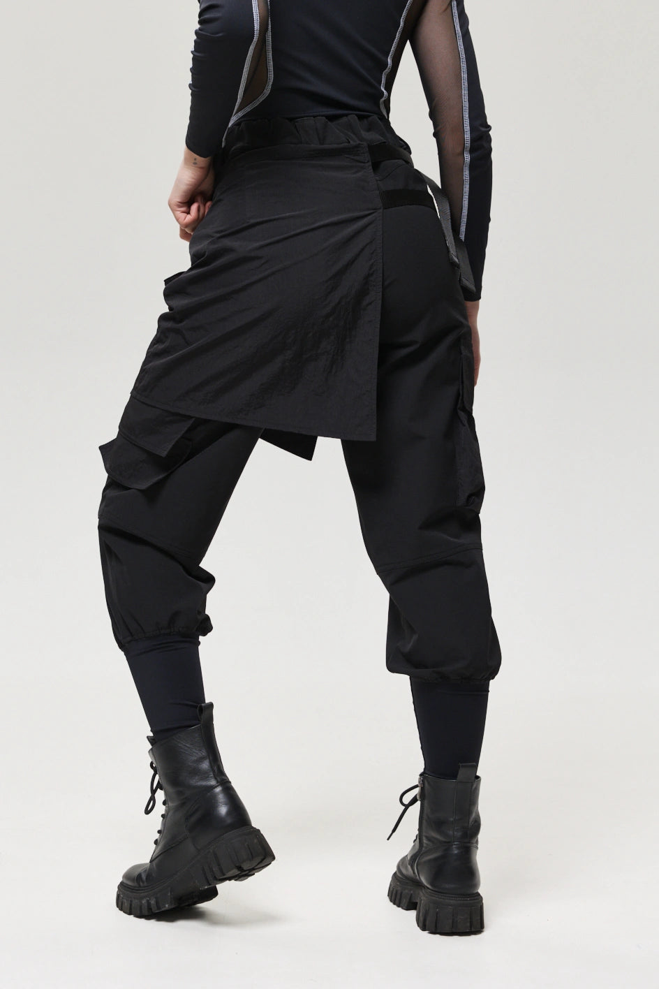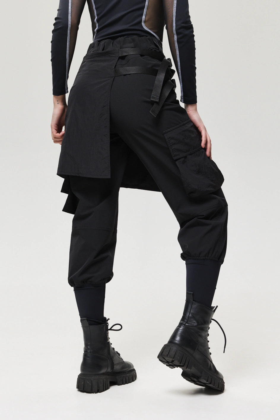 Spodnie z 4 kieszeniami oraz elementem nakładanej spódnicy z fastexami do regulacji i mocowania. Spódnica oraz dekoracyjne klapy tworzą wielowarstwowy efekt, dodając charakteru stylizacji. W pasie znajduje się półkółko do przypięcia karabińczyków i organizerów. Wysokie mankiety z nylonu zwiększają wygodę i podkreślają styl. Idealne do tworzenia outfitów w stylach techwear, cyberpunk, darkwear.