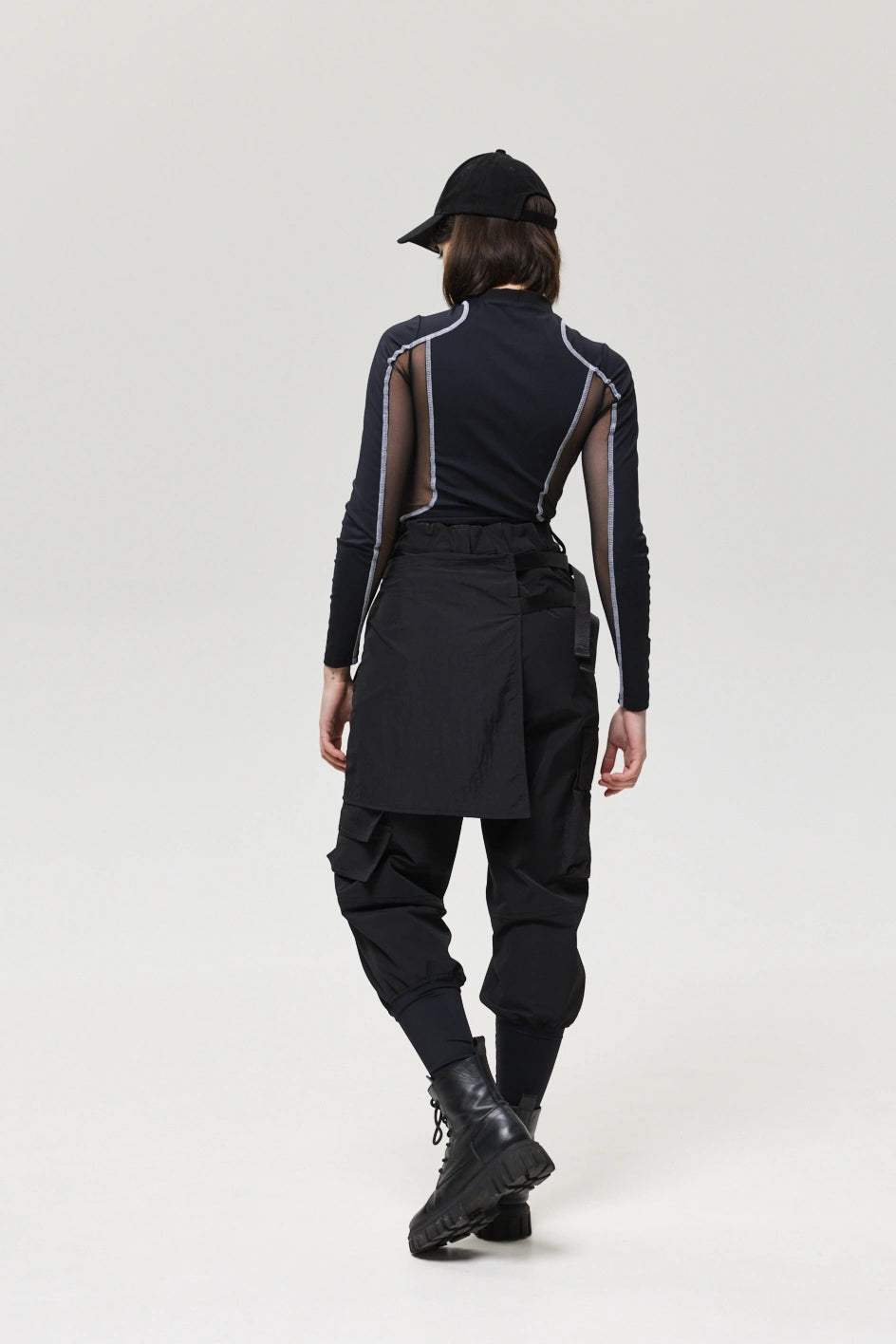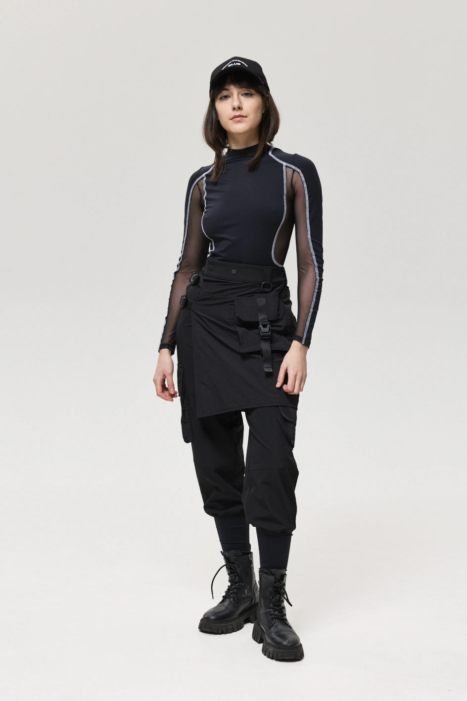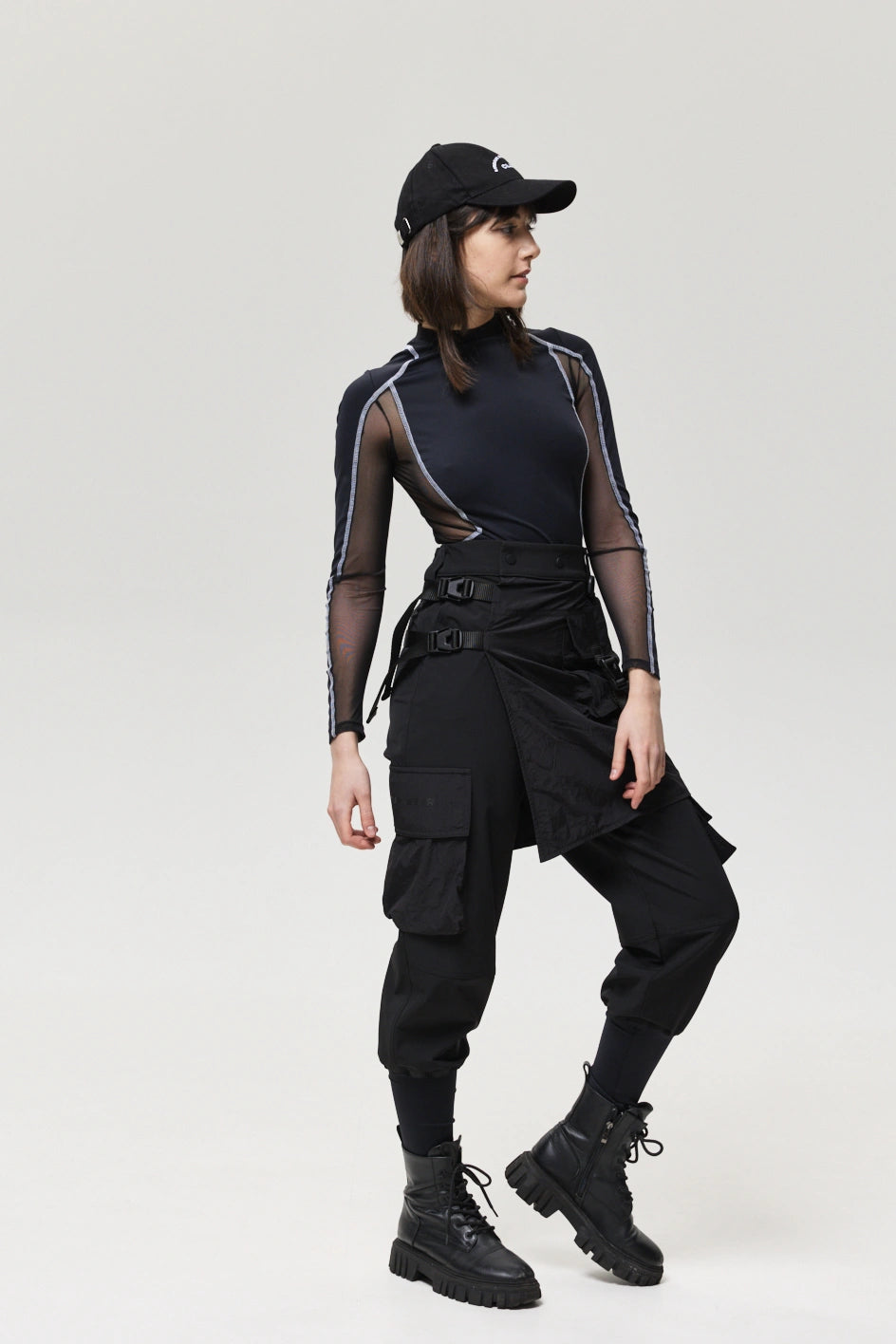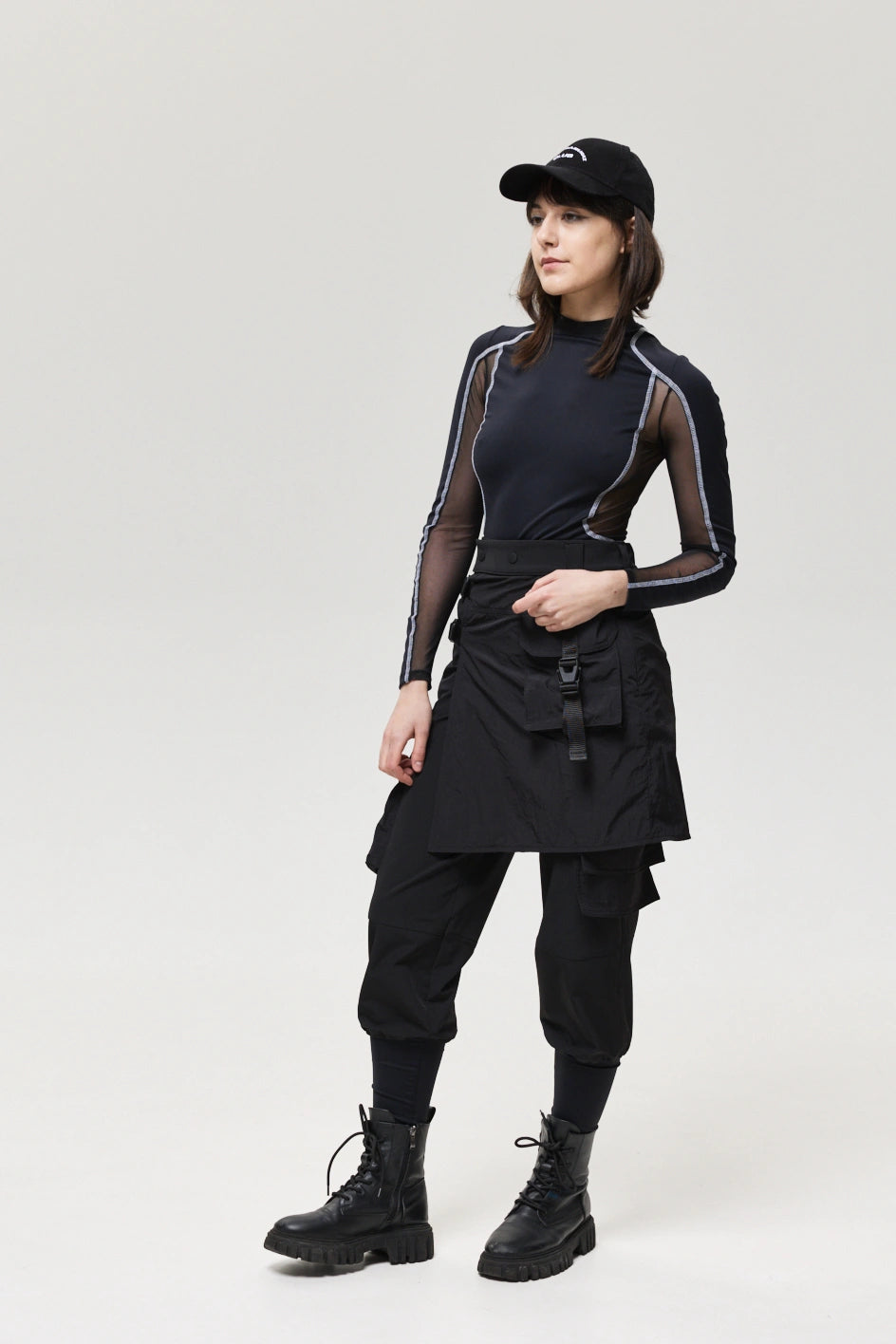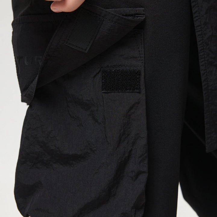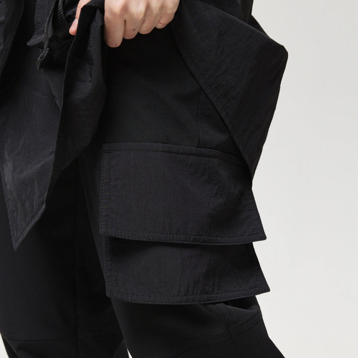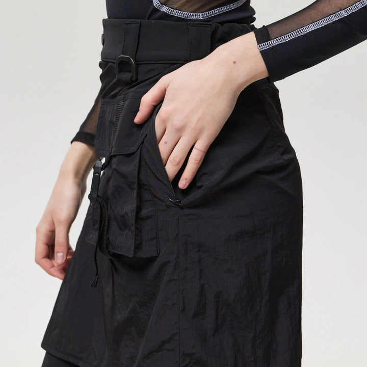 Spodnie z 4 kieszeniami oraz elementem nakładanej spódnicy z fastexami do regulacji i mocowania. Spódnica oraz dekoracyjne klapy tworzą wielowarstwowy efekt, dodając charakteru stylizacji. W pasie znajduje się półkółko do przypięcia karabińczyków i organizerów. Wysokie mankiety z nylonu zwiększają wygodę i podkreślają styl. Idealne do tworzenia outfitów w stylach techwear, cyberpunk, darkwear.
