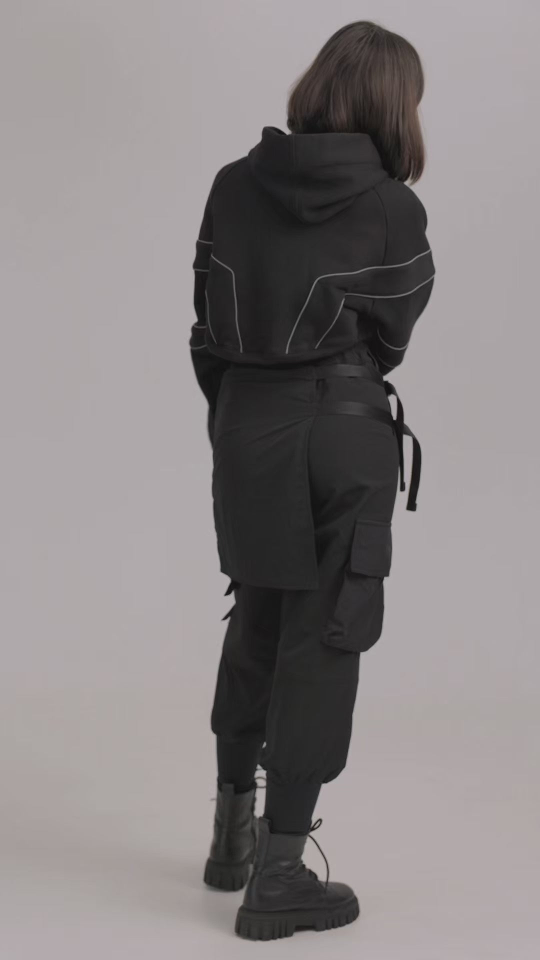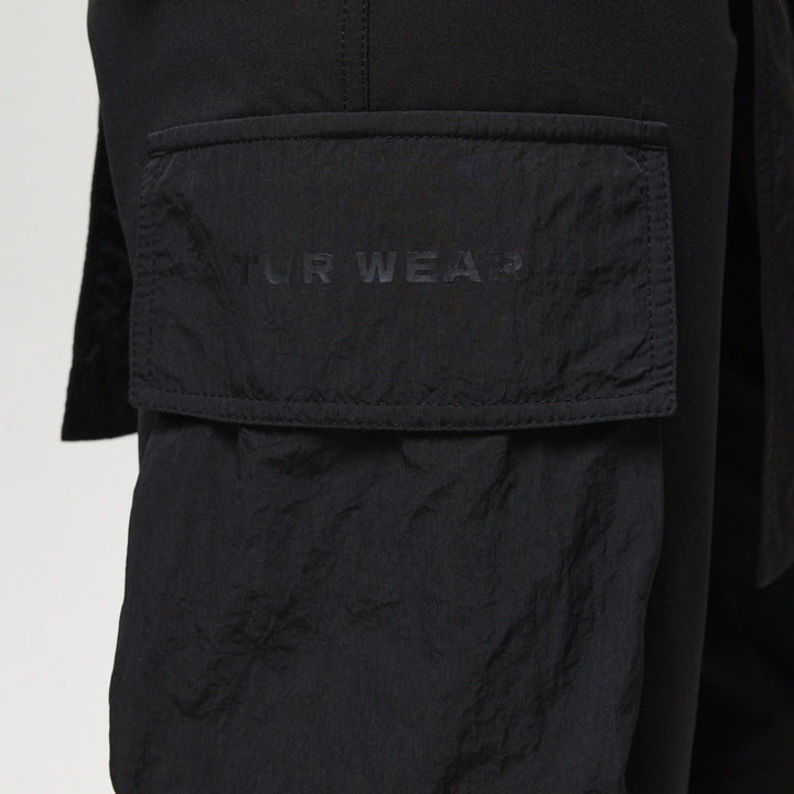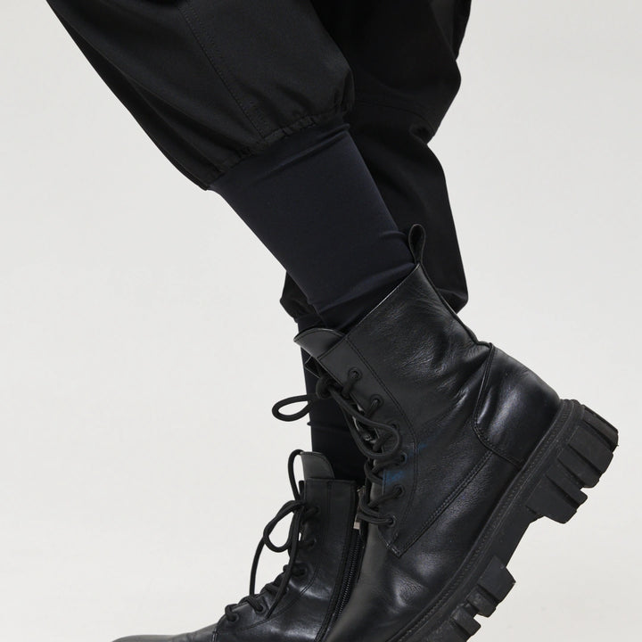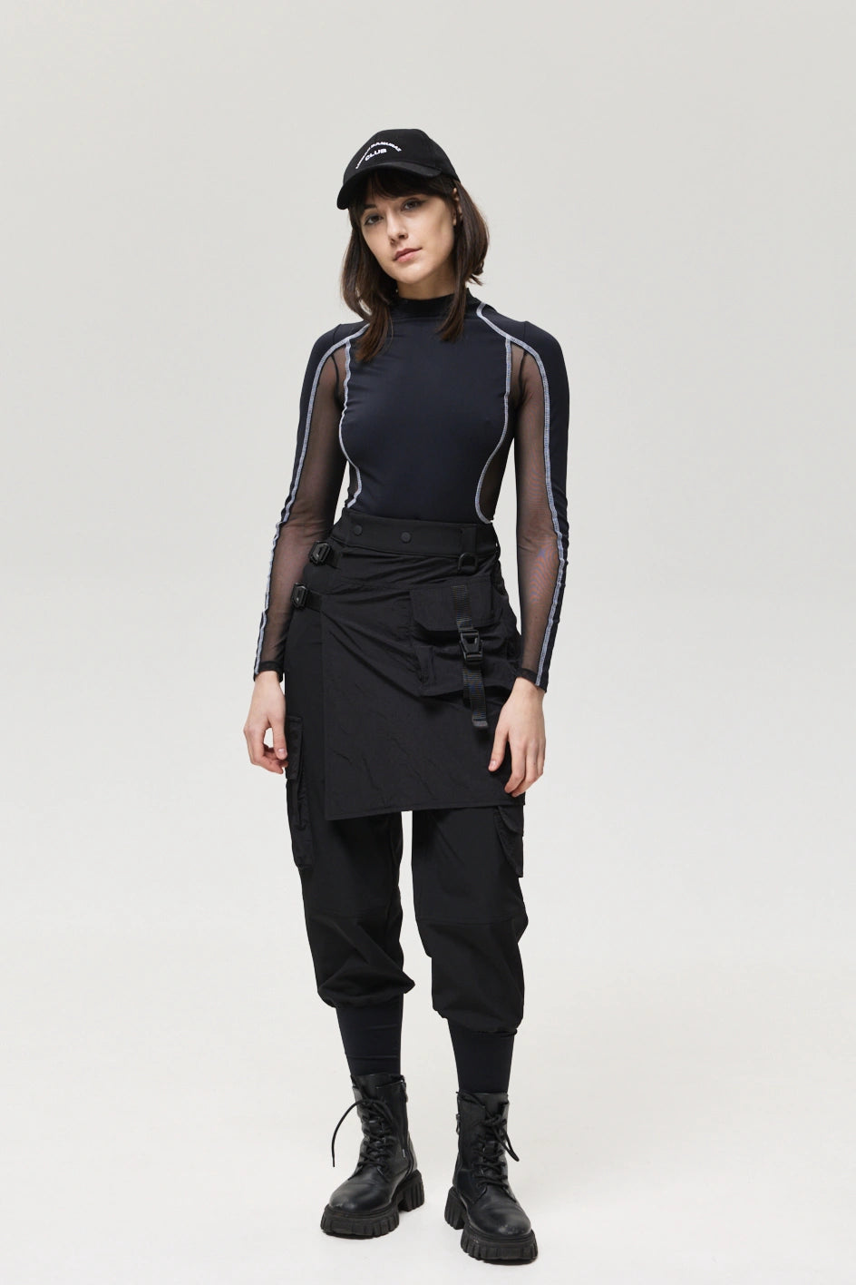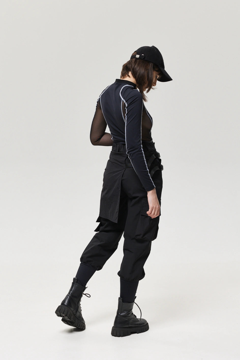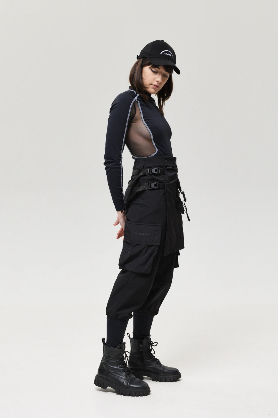 Spodnie z 4 kieszeniami oraz elementem nakładanej spódnicy z fastexami do regulacji i mocowania. Spódnica oraz dekoracyjne klapy tworzą wielowarstwowy efekt, dodając charakteru stylizacji. W pasie znajduje się półkółko do przypięcia karabińczyków i organizerów. Wysokie mankiety z nylonu zwiększają wygodę i podkreślają styl. Idealne do tworzenia outfitów w stylach techwear, cyberpunk, darkwear.